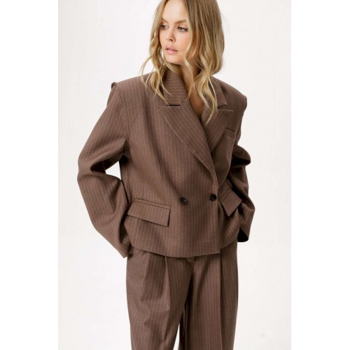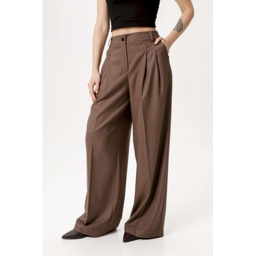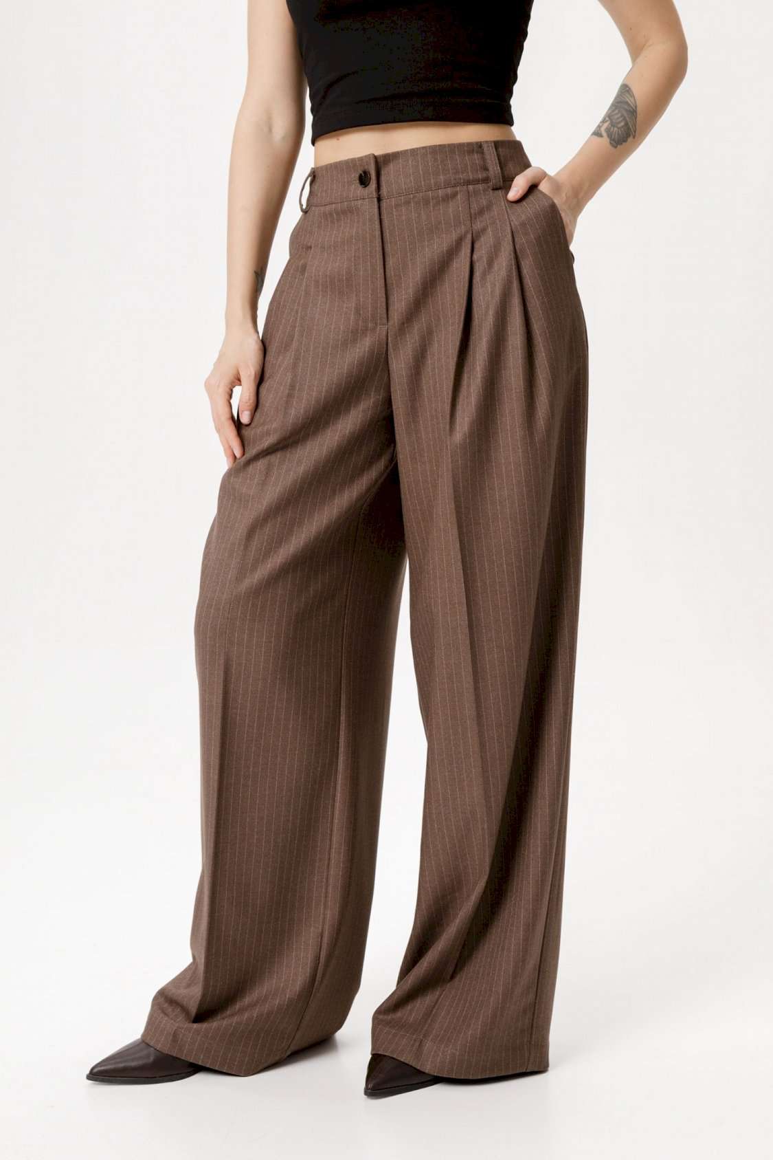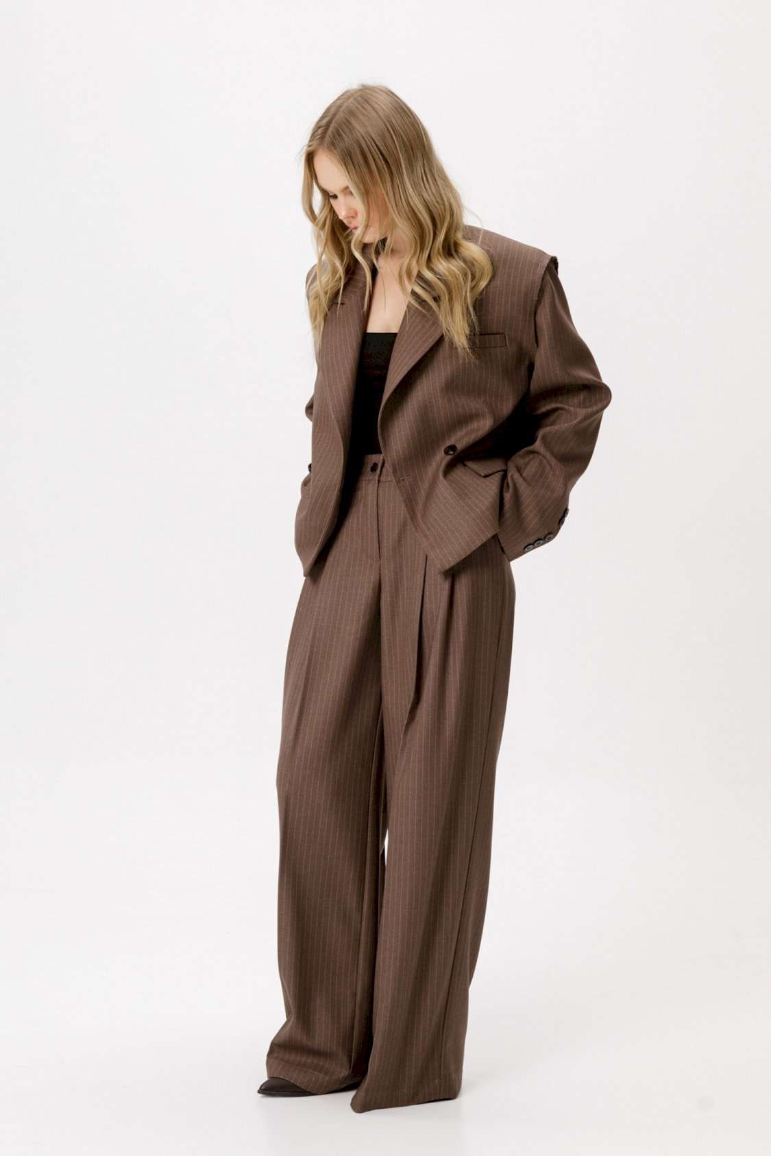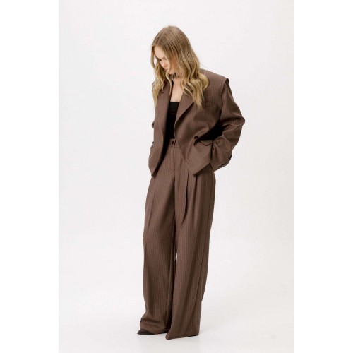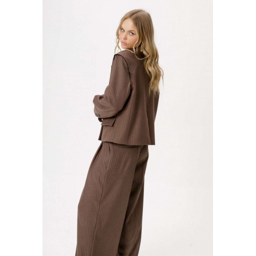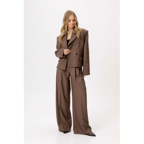 Костюм-двойка из укороченного оверсайз жакета с необработанным краем пройм и широких брюк-палаццо из текстильной ткани в полоску. Детали: жакет прямого силуэта, пиджачный воротник, двубортная застежка на две петли и пуговицы, функциональные карманы, спинка с фигурной кокеткой, рукава втачные, жакет на подкладке. Брюки с притачным поясом со шлевками, складки у пояса, застежка на молнию и пуговицу, боковые карманы, заутюженные стрелки. Задние части брюк с вытачками и имитацией карманов. Длина жакета по спинке около 55 см в размерах 40-46 и около 56,5 см в размерах 48-52, длина рукавов около 61 см. Длина брюк по боковому шву с поясом около 109,5 см, длина по внутреннему шву около 83 см