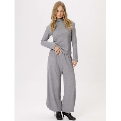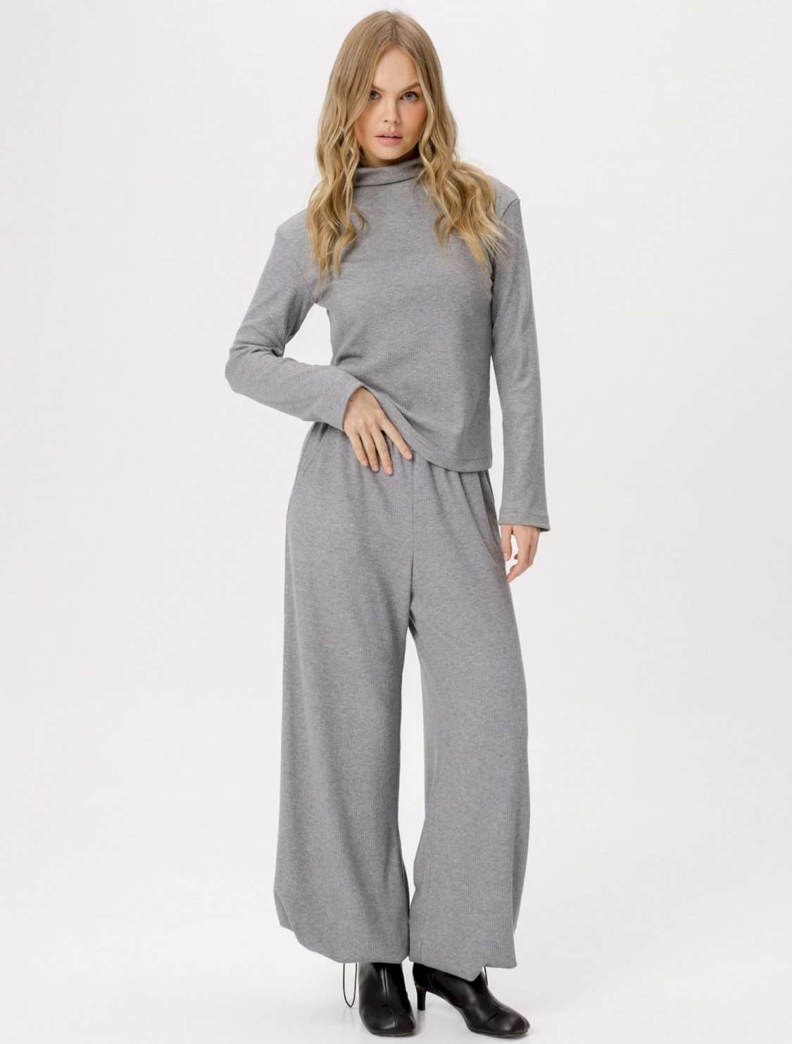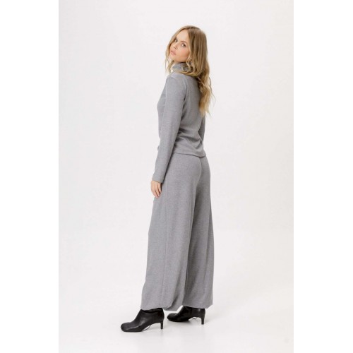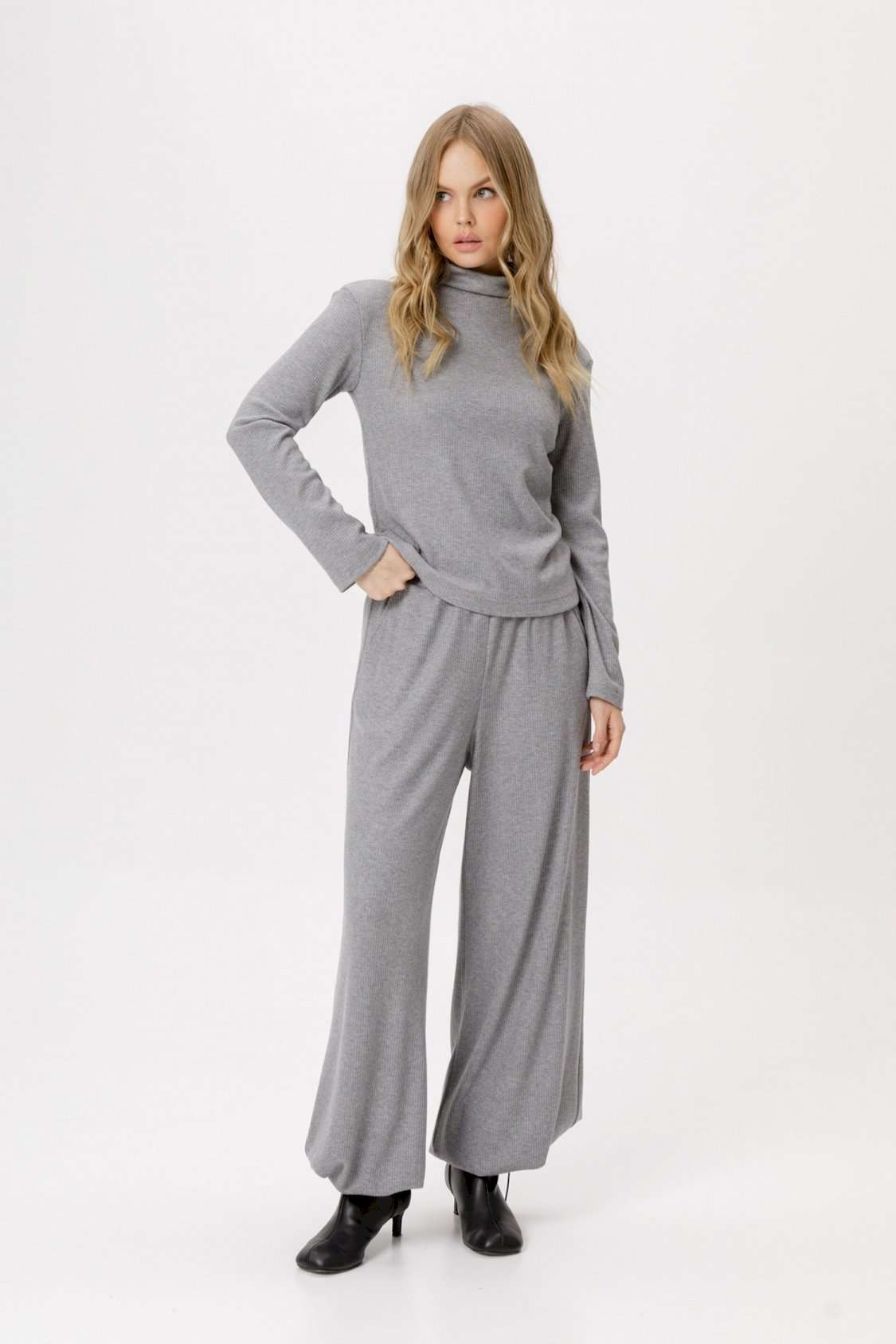 Трикотажный костюм-двойка из джемпера с цельнокроеной стойкой и широких брюк. Детали: джемпер со спущенными плечами, полуприлегающий силуэт, втачные длинные рукава. Брюки с высокой посадкой, эластичный пояс с резинкой, боковые карманы. Длина джемпера от плеча 57 см в размерах 40-46 и около 59,5 см в размерах 48-52, длина рукава около 60 см. Длина брюк с поясом около 105 см