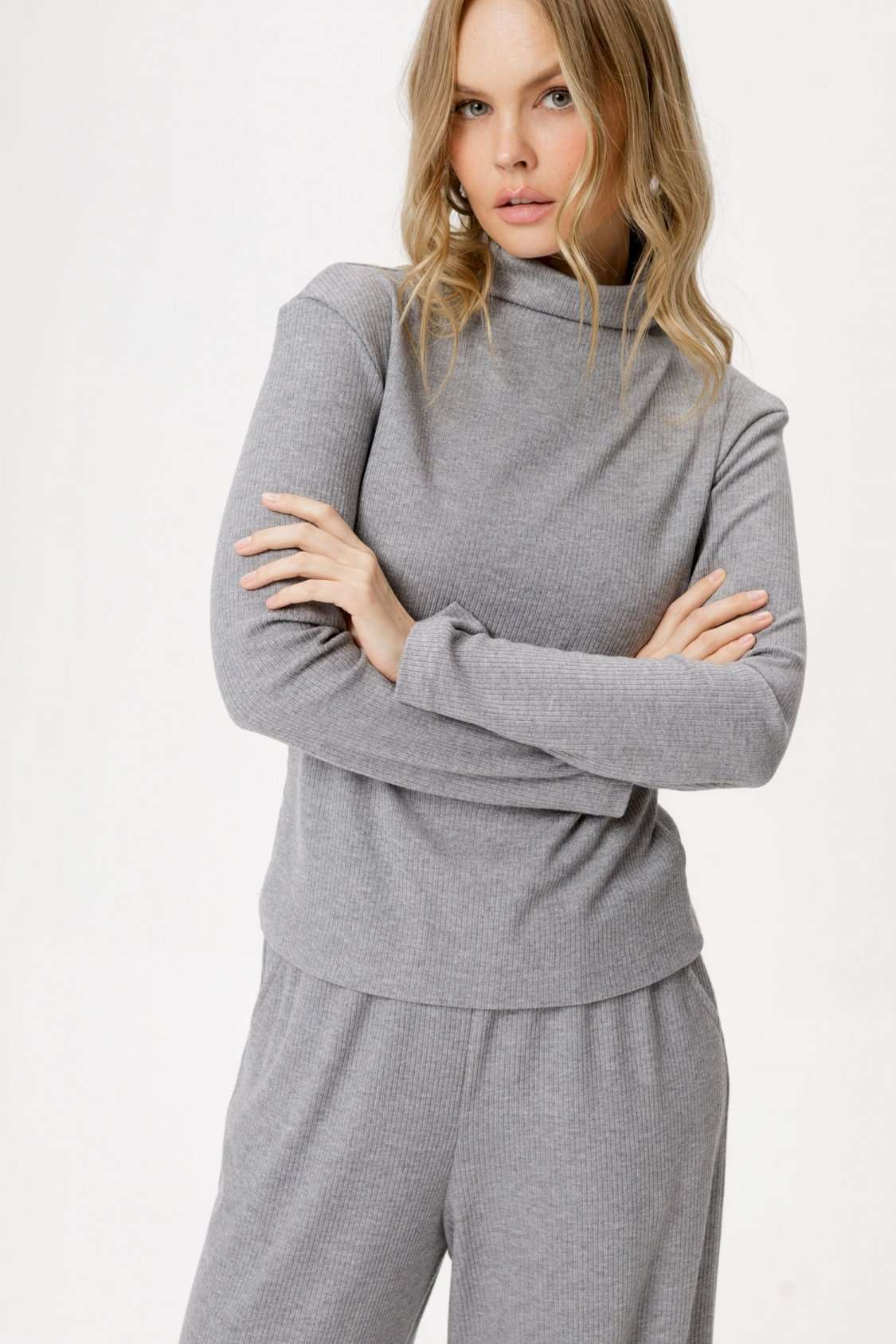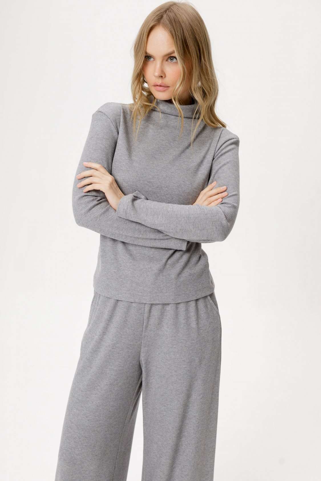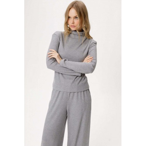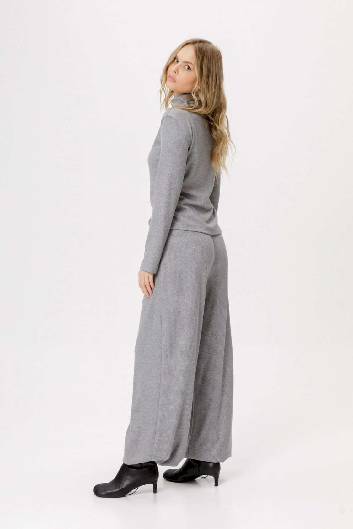 Трикотажный костюм-двойка из джемпера с цельнокроеной стойкой и широких брюк. Детали: джемпер со спущенными плечами, полуприлегающий силуэт, втачные длинные рукава. Брюки с высокой посадкой, эластичный пояс с резинкой, боковые карманы. Длина джемпера от плеча 57 см в размерах 40-46 и около 59,5 см в размерах 48-52, длина рукава около 60 см. Длина брюк с поясом около 105 см