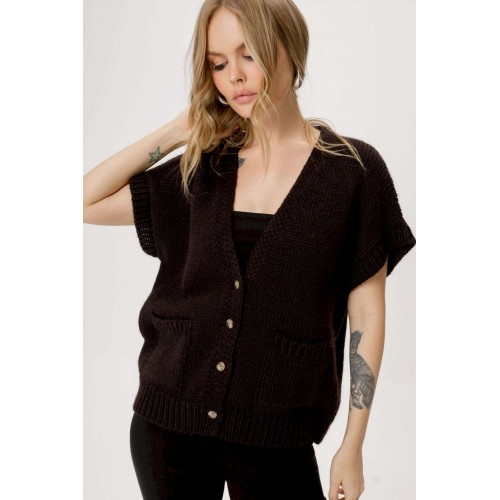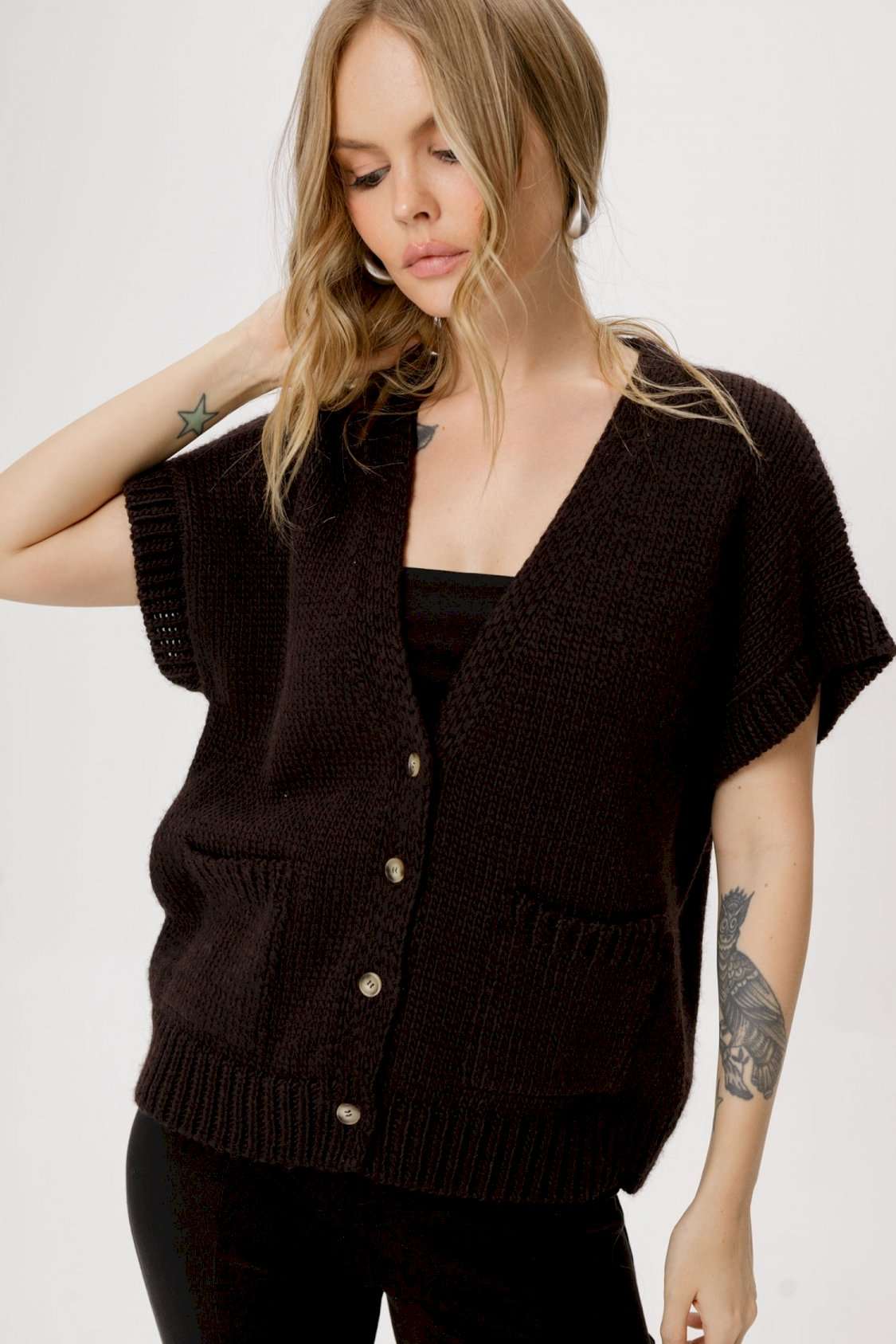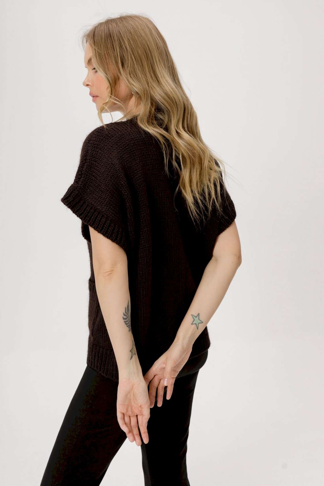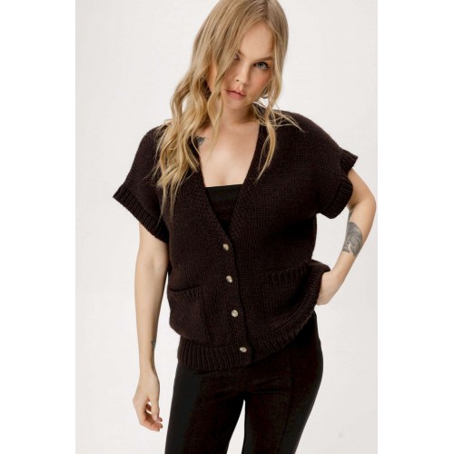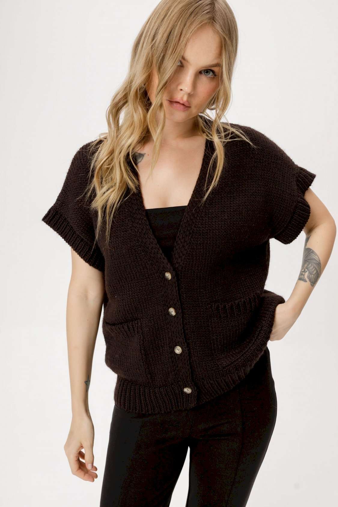 Комплект-двойка из свободного вязаного жилета с шерстью и трикотажных облегающих брюк-клеш. Детали: Жилет прямого силуэта, накладные карманы, застежка на петли и пуговицы. Брюки с высокой посадкой, перед с рельефными швами, пояс с резинкой, брюки без карманов. Длина брюк по боковому шву с поясом около 107 см, по внутреннему шву около 79,5 см