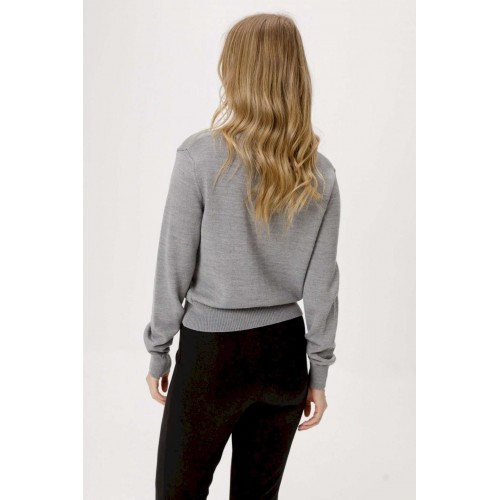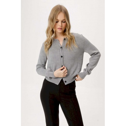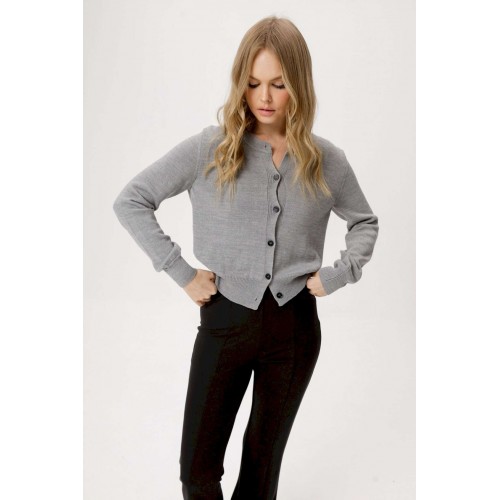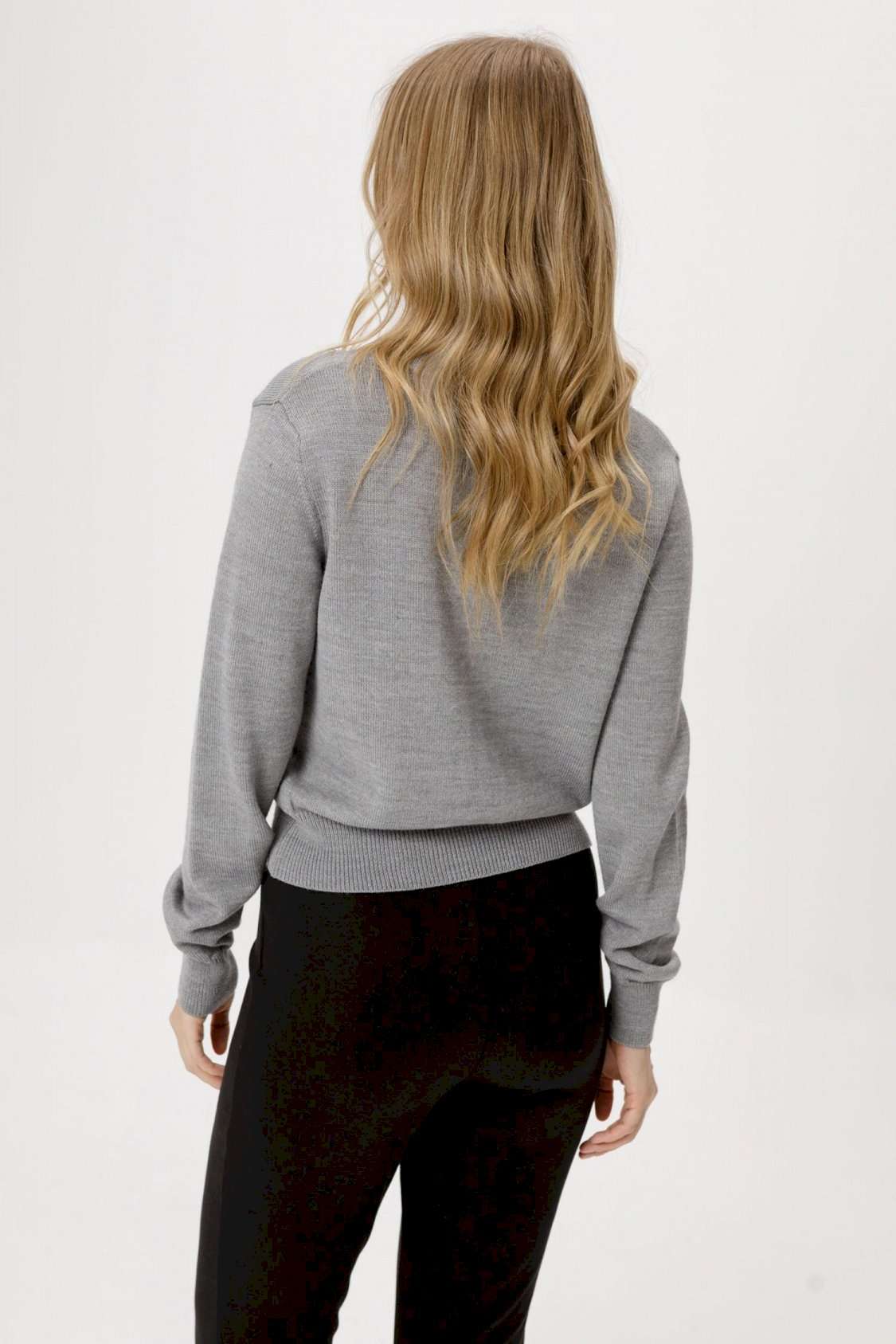 Комплект-двойка из вязаного базового джемпера на пуговицах из полушерстяной пряжи и трикотажных облегающих брюк-клеш. Детали: джемпер прямого силуэта, застежка на петли и пуговицы. Брюки с высокой посадкой, перед с рельефными швами, пояс с резинкой, брюки без карманов. Длина брюк по боковому шву с поясом около 107 см, по внутреннему шву около 79,5 см