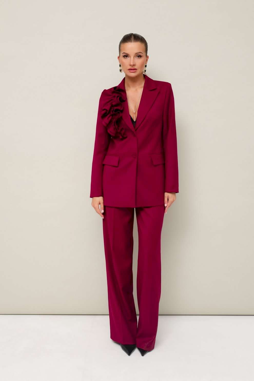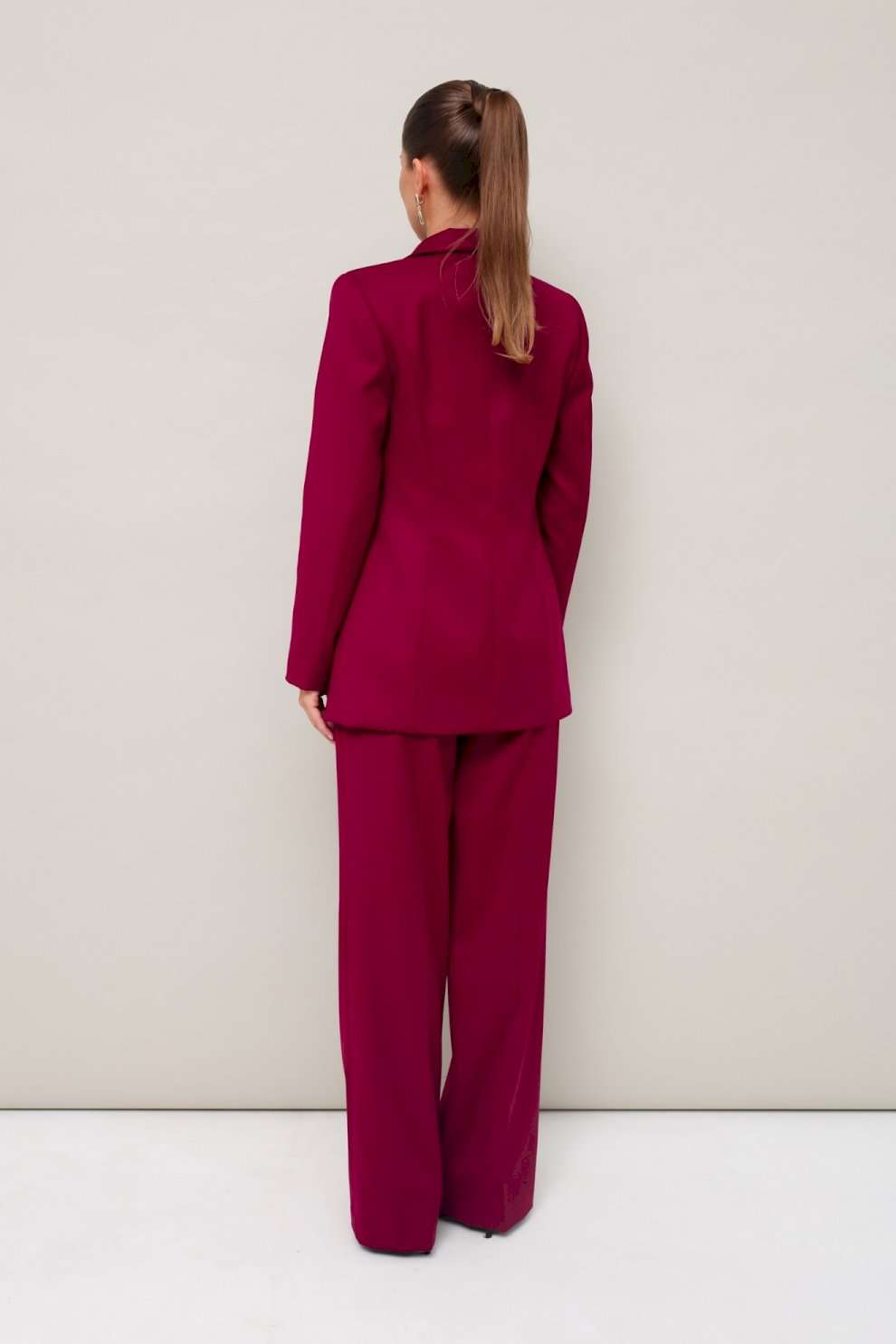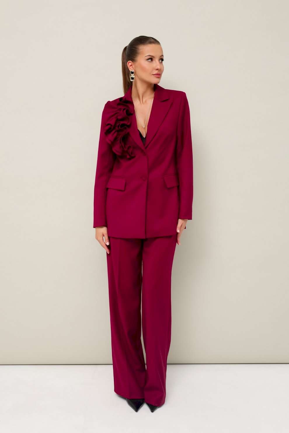 Эффектный 2-предметный комплект, состоящий из жакета и брюк, выполненный из костюмной ткани. Жакет женский полуприлегающего силуэта с центральной застежкой на петли и обтяжные пуговицы. Воротник пиджачного типа с отложными лацканами. Спереди обработаны прорезные карманы в рамку с клапанами. Рукава втачные двухшовные. Спинка со средним швом и рельефами. Изделие обработано подкладкой. Брюки прямого силуэта с заутюженными стрелками и с боковыми наклонными карманами. Пояс притачной с застежкой на пуговицу и тесьму-молнию, по спинке пояс на резинке для регуляции размера. В комплекте прилагается съемная брошь из основной ткани.