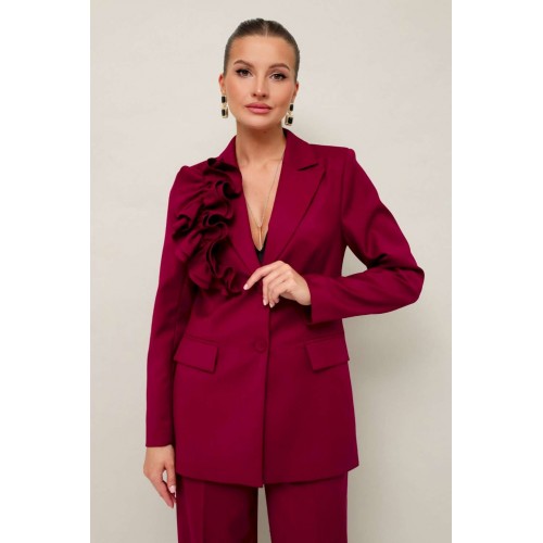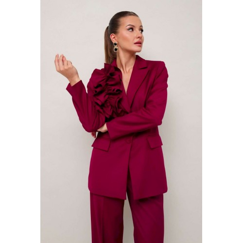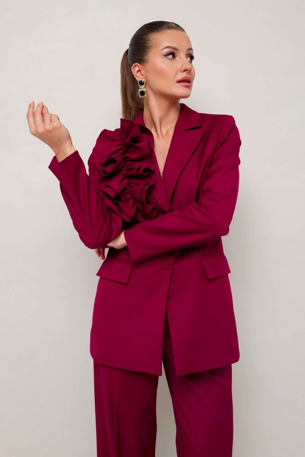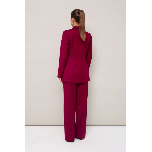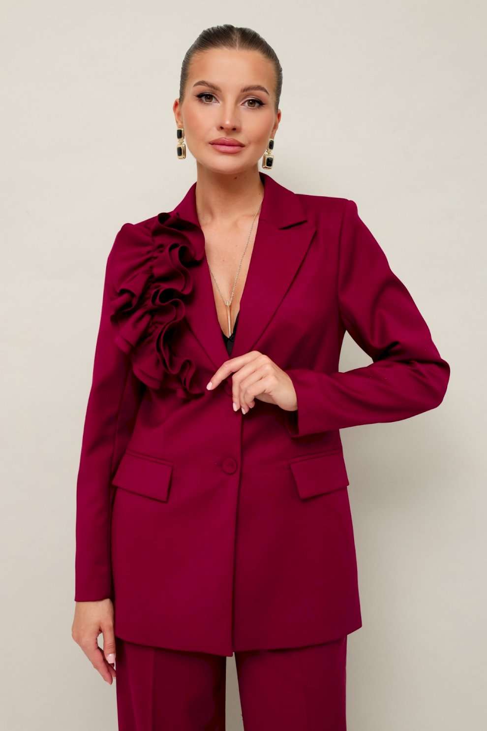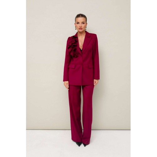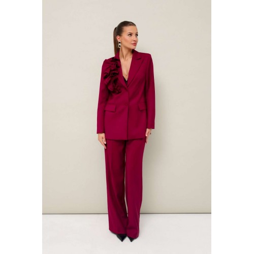 Эффектный 2-предметный комплект, состоящий из жакета и брюк, выполненный из костюмной ткани. Жакет женский полуприлегающего силуэта с центральной застежкой на петли и обтяжные пуговицы. Воротник пиджачного типа с отложными лацканами. Спереди обработаны прорезные карманы в рамку с клапанами. Рукава втачные двухшовные. Спинка со средним швом и рельефами. Изделие обработано подкладкой. Брюки прямого силуэта с заутюженными стрелками и с боковыми наклонными карманами. Пояс притачной с застежкой на пуговицу и тесьму-молнию, по спинке пояс на резинке для регуляции размера. В комплекте прилагается съемная брошь из основной ткани.