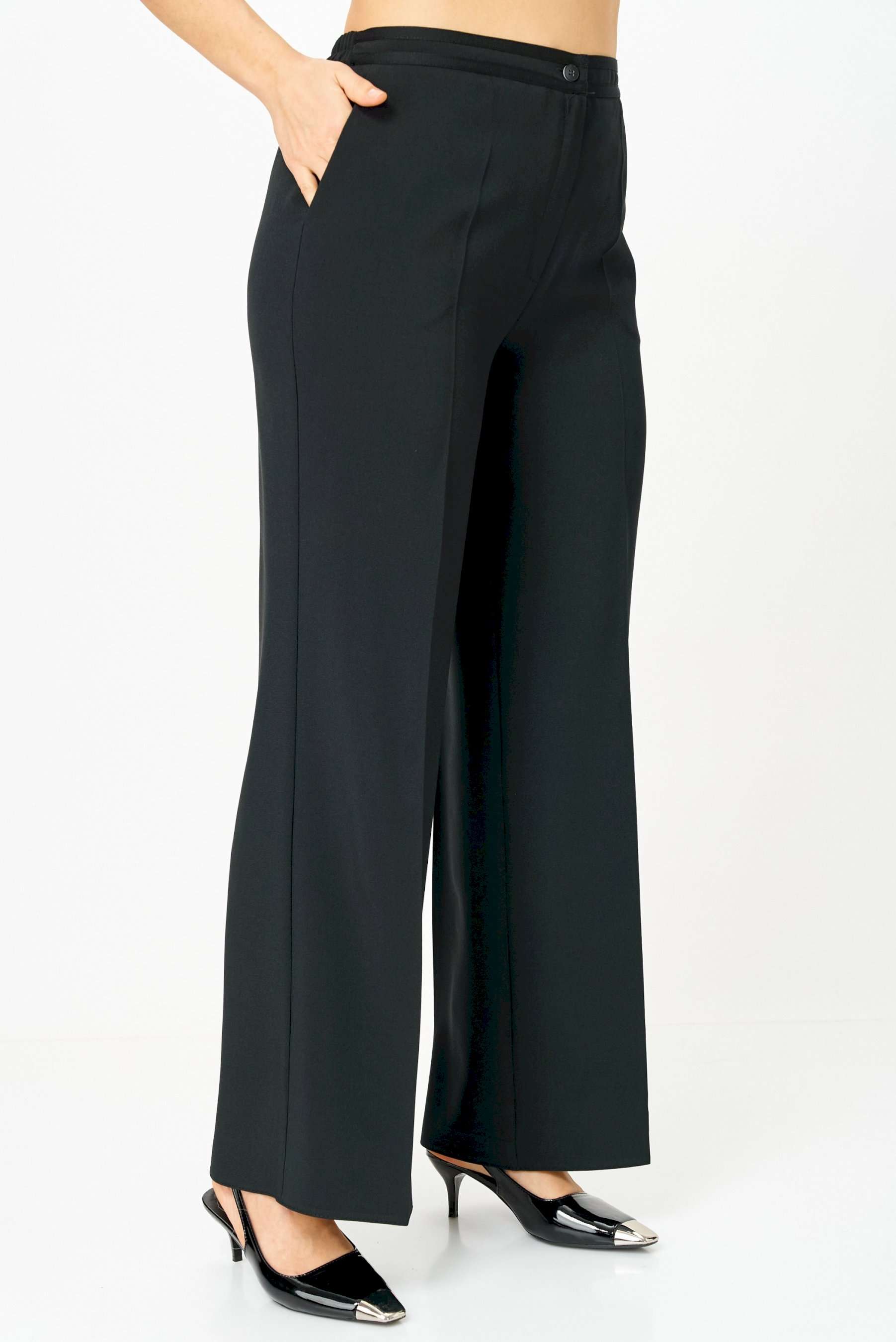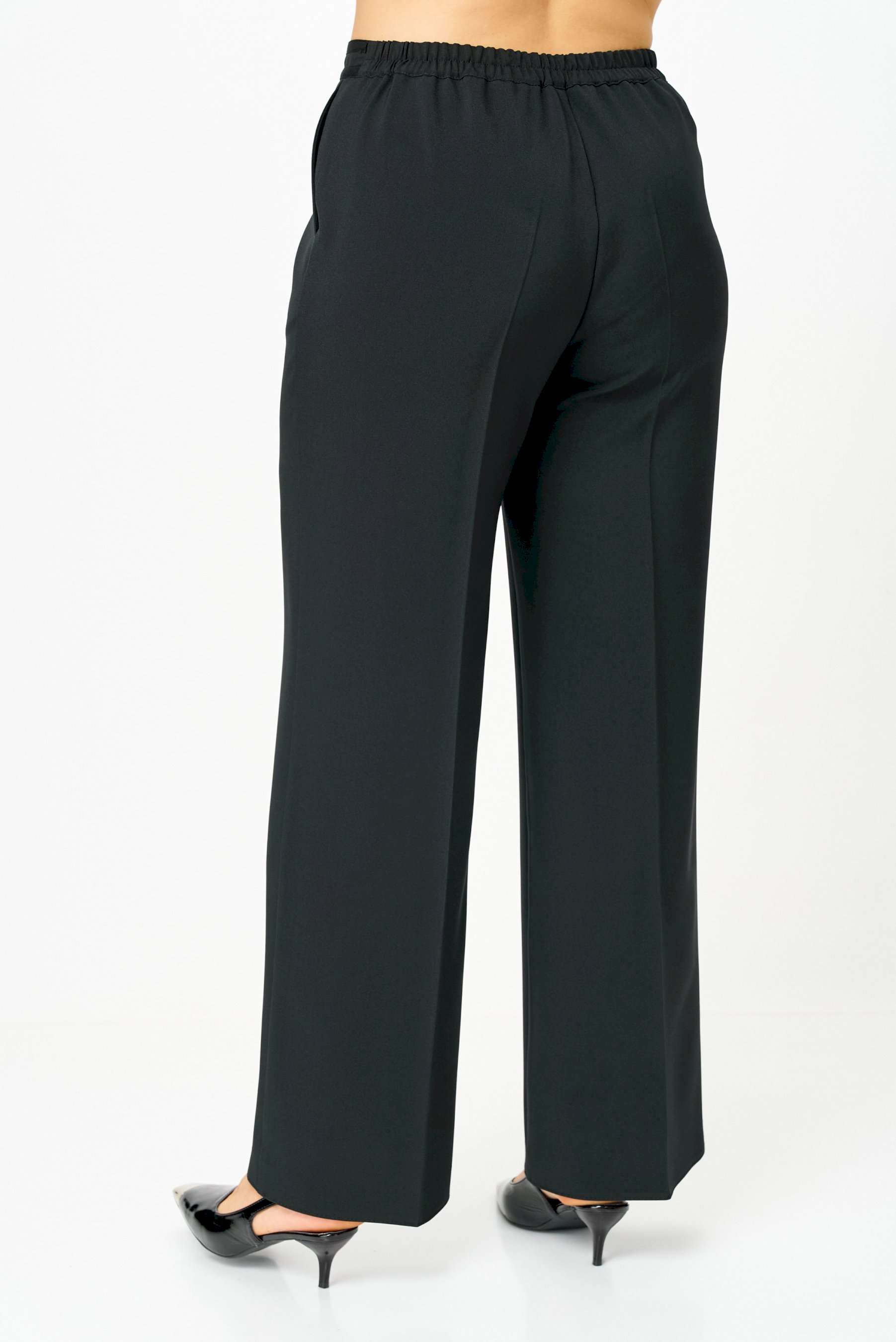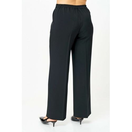 Комплект женский двухпредметный, состоящий из жакета и брюк. Жакет полуприлегающего силуэта с центральной бортовой застежкой на 6 петель-пуговиц. Перед с отрезным бочком, нагрудной вытачкой и накладными карманами фигурной формы. Горловина ии крой борта имеют закругленную форму. Края горловины, борта, низа изделия и рукавов, а также карманы окантованы контрастной киперной тесьмой. Спинка со средним швом. Рукав втачной двухшовный, длинный. Брюки классического кроя, расширенные от бедра, с заутюженными кантами и с притачным поясом сзади на резинке. По краям пояса передних половинок брюк настрочена узкая киперная тесьма. Застежка на тесьму-молнию в передних половинках и петлю-пуговицу по поясу.