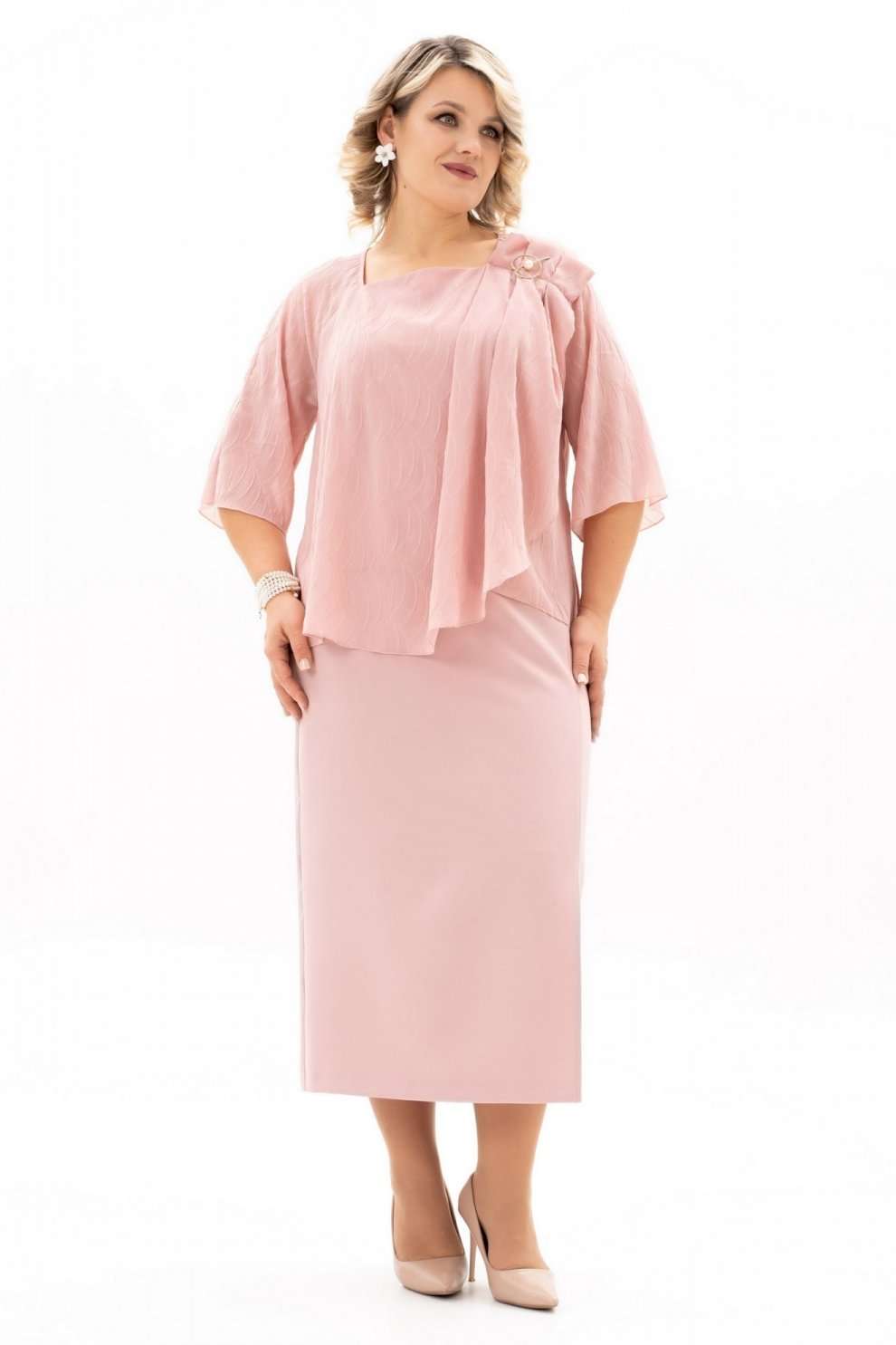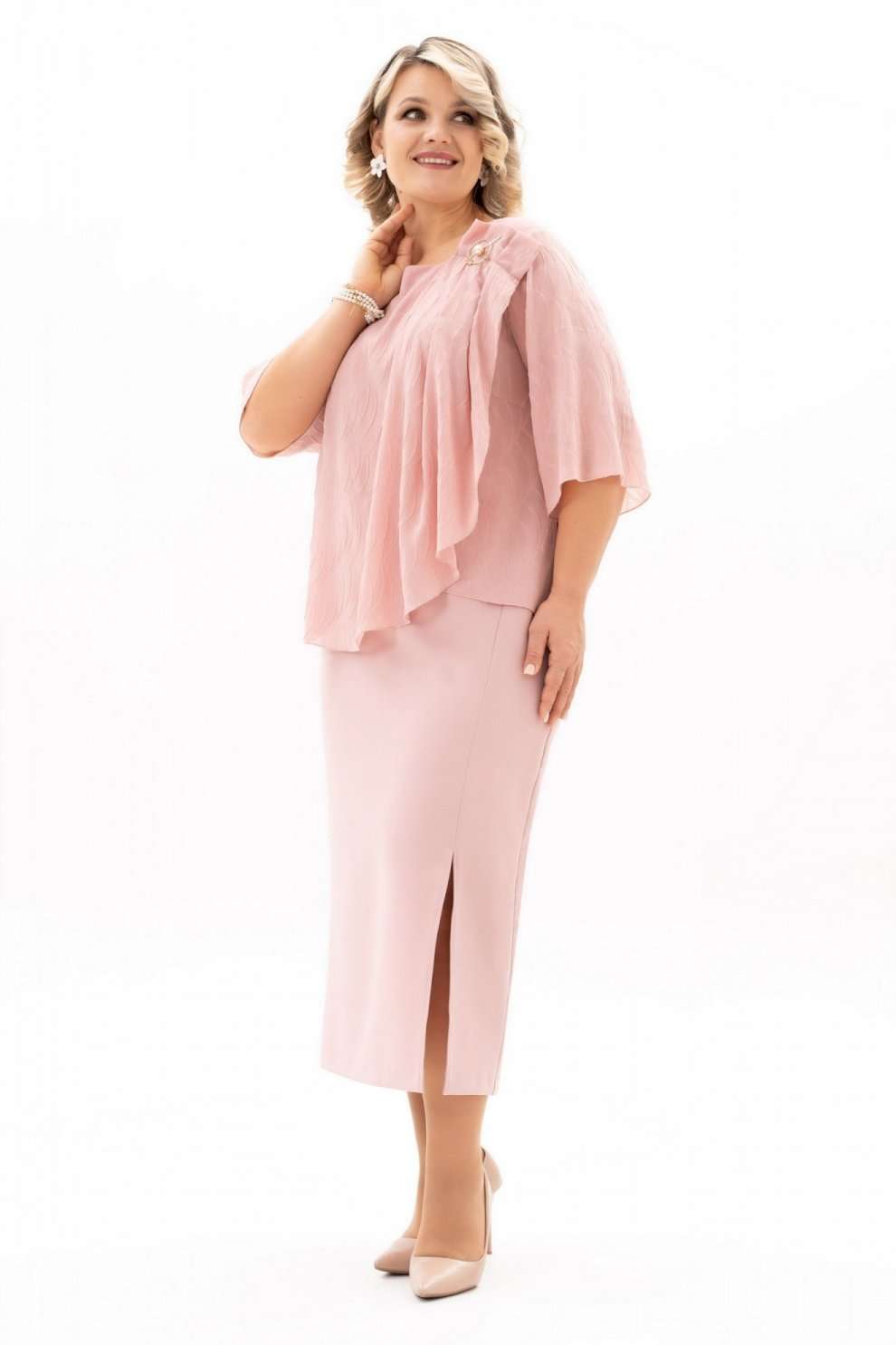 Костюм с юбкой 4125 Algranda (Новелла Шарм) мгновенно привлекает внимание своим изысканным дизайном. Коллекция бренда Новелла Шарм демонстрирует сочетание комфорта и стиля, идеального для офисной или вечерней атмосферы. Костюм выполнен из полиэстра и вискозы, что обеспечивает прочность и лёгкость ухода, а эластан добавляет эластичности. Блуза с нагрудными выточками, фигурным вырезом и декоративными элементами, такими как мягкие складки и съёмная брошь, подчёркивает женственность. Разрезы на юбке и её зауженная к низу форма добавляют динамичности образу. Длина блузы составляет 59 см, юбки — 90 см, рукава 39 см, что подходит для многих типов фигуры. Эластичная тесьма на поясе и застёжка на молнию сзади обеспечивают удобную посадку. Насыщенный синий цвет дополнит ваш гардероб, сочетаясь с различными аксессуарами. Идеален для разных сезонов — весны, осени, прохладных летних вечеров.