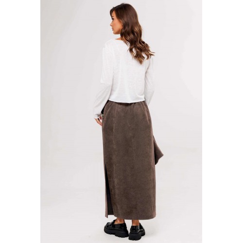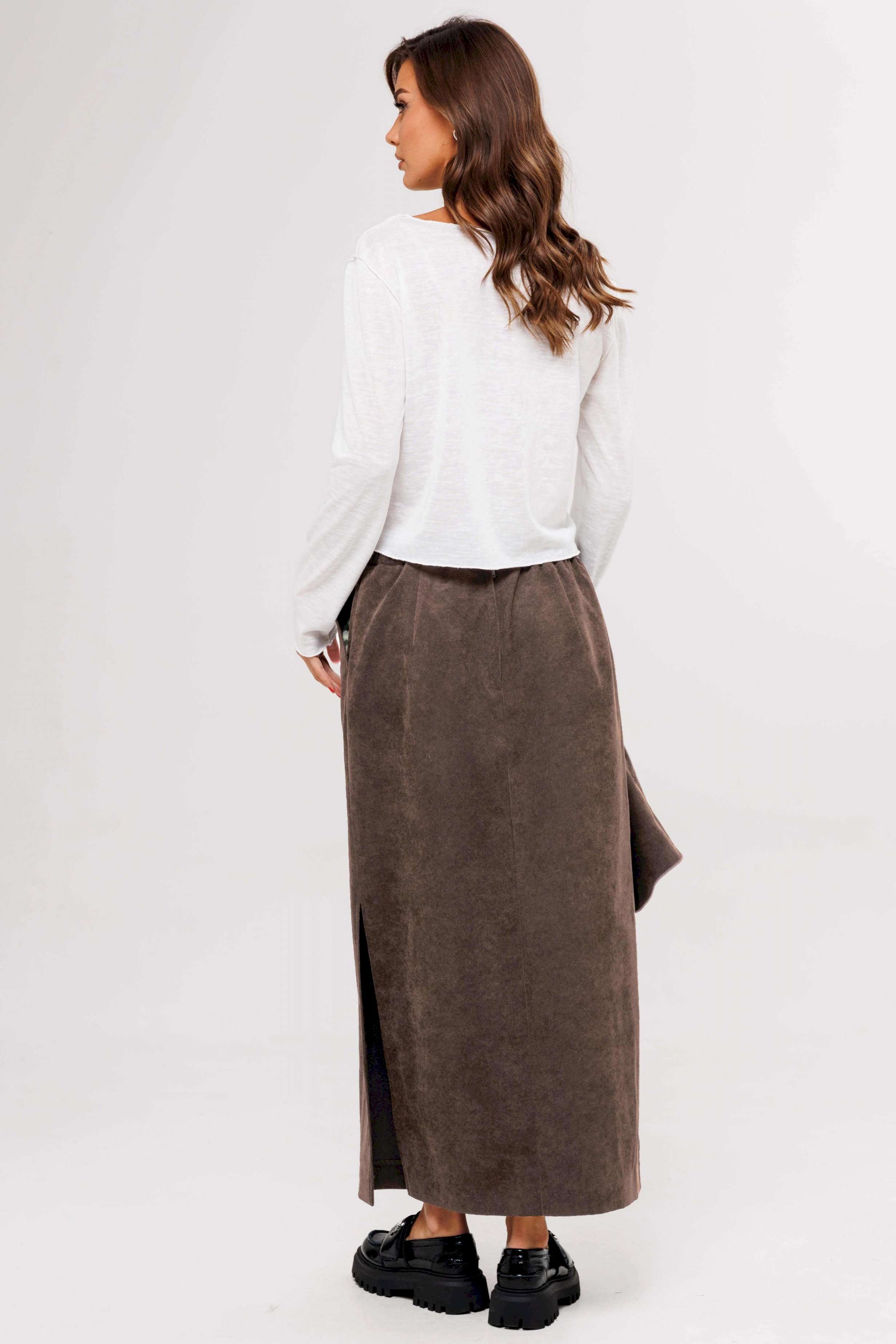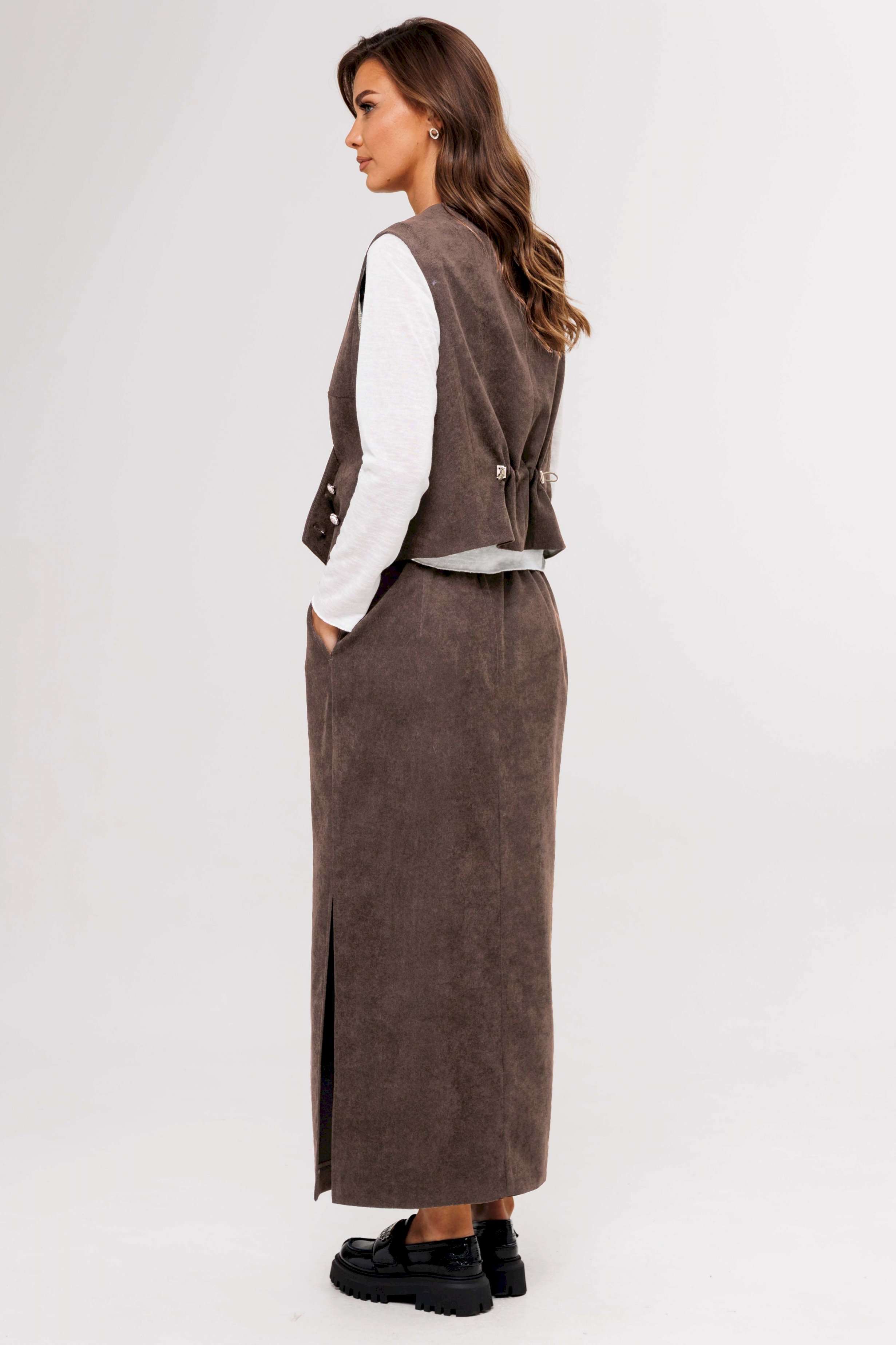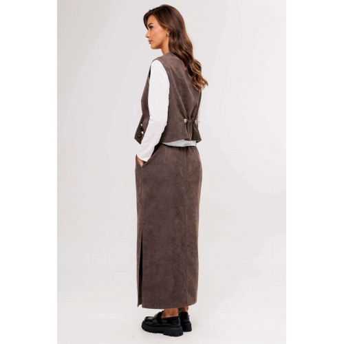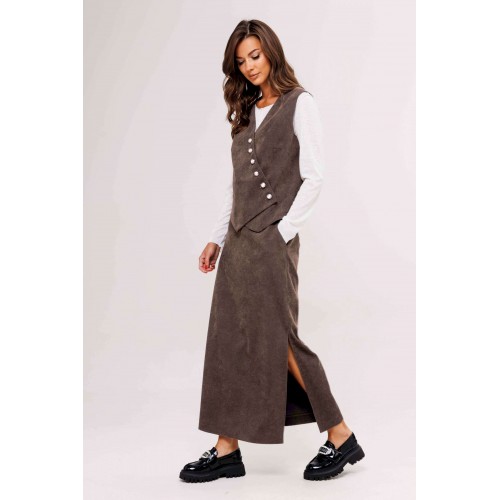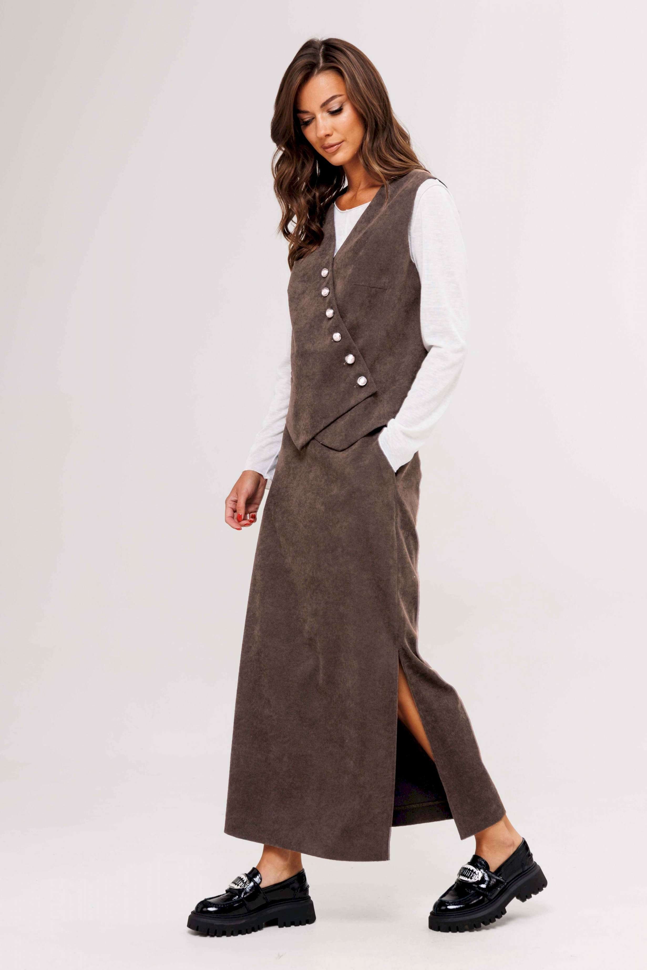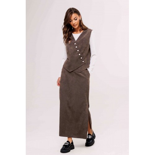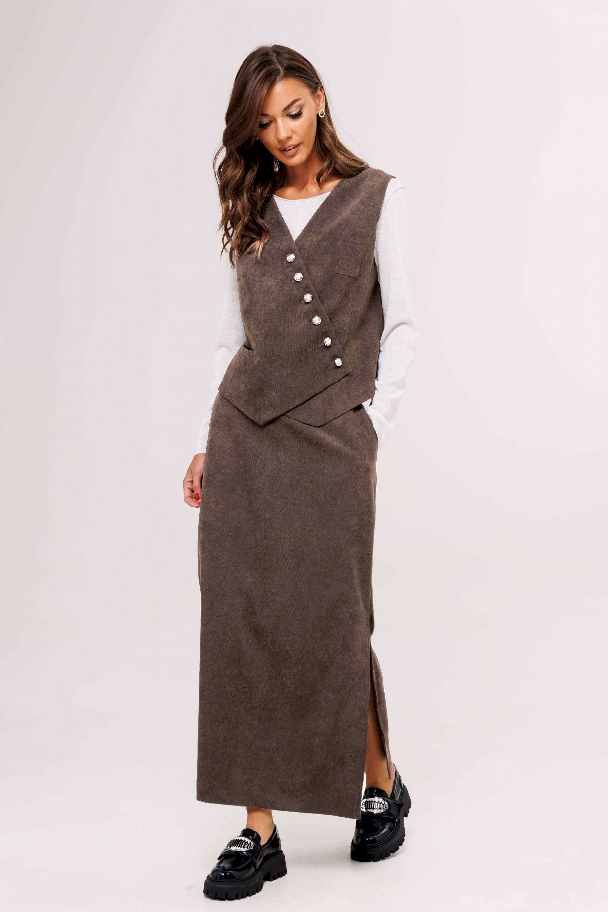 Костюм с жилетом - прекрасное решение для смелых экспериментов. Выполненный в ахроматической цветовой гамме, он позволяет дополнять себя различными аксессуарами и создавать каждый раз новые актуальные образы. Жилет полуприлегающего силуэта с асимметричной застёжкой, фигурной линией низа и регулирующийся кулисе по спинке. Полочки с отрезным бочком и нагрудными вытачками, спинки - с центральным швом, отрезным бочком и регулирующийся кулисой с фиксаторами. Юбка прямая с застёжкой и боковыми карманами по переднему полотнищу, и разрезом сбоку, из текстильного трикотажного полотна эффекта \"\"вельвет\"\". Пояс эластичный в области спинки. Джемпер трикотажный, с длинным рукавом, полуприлегающего силуэта.