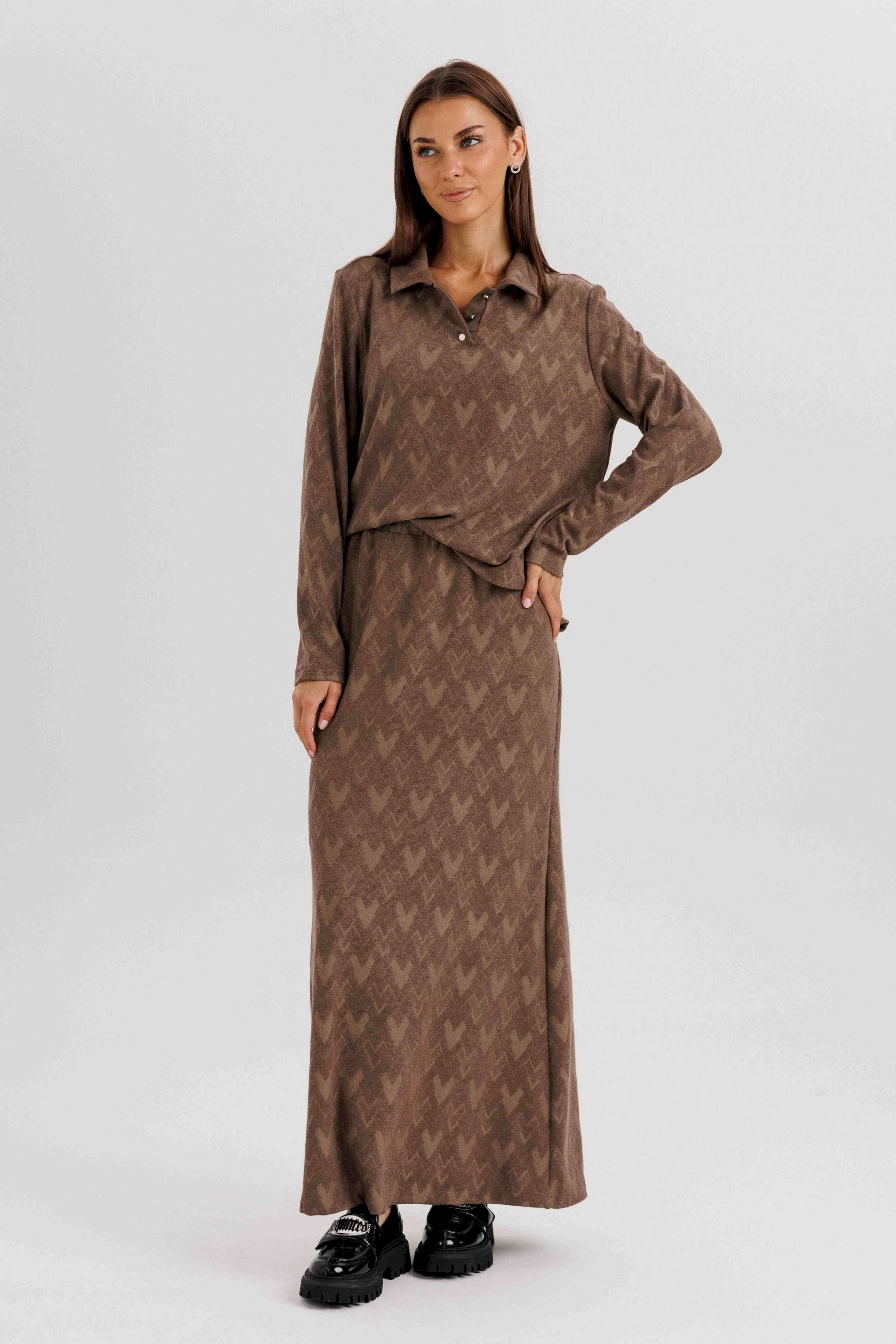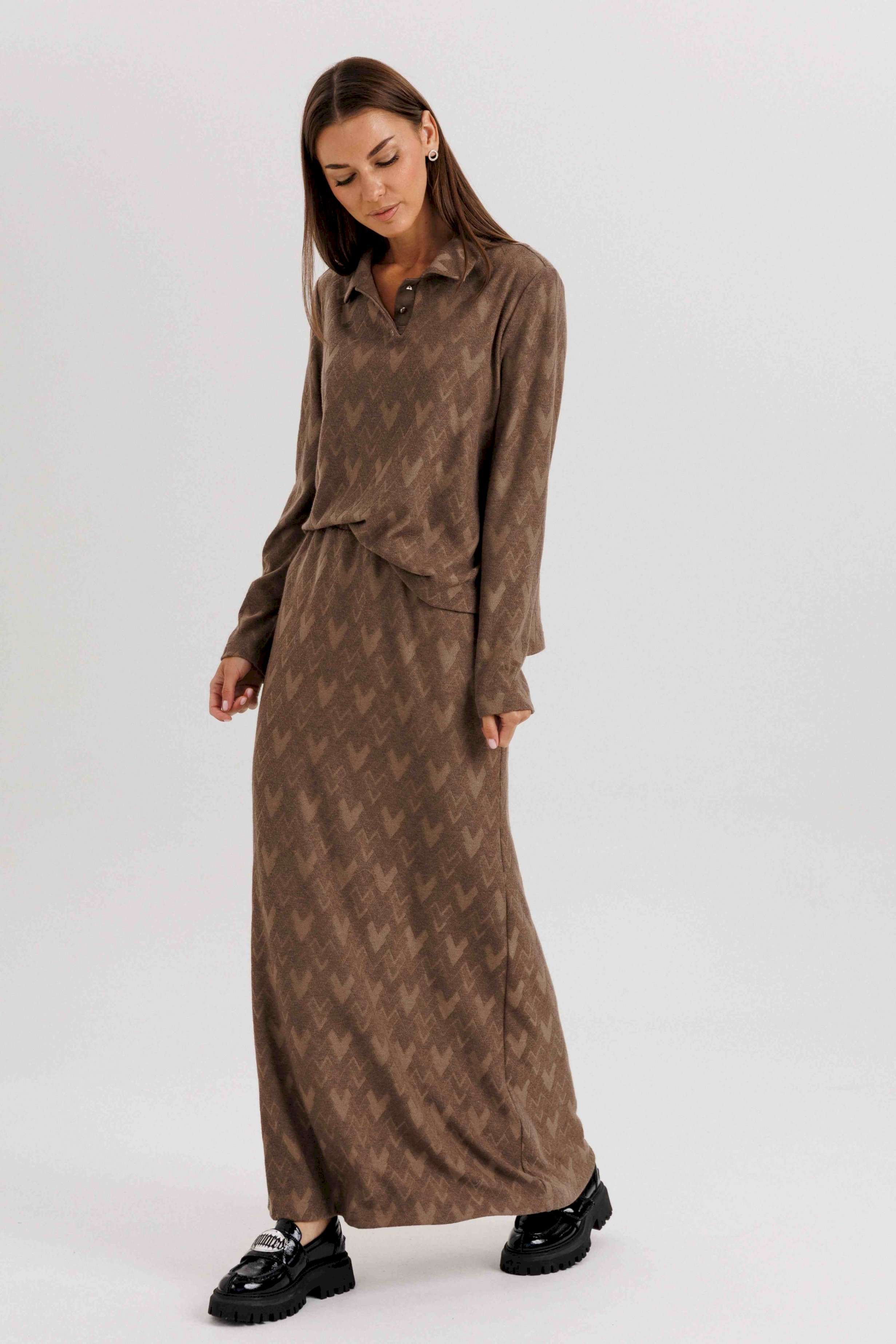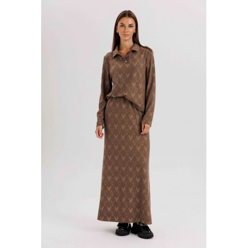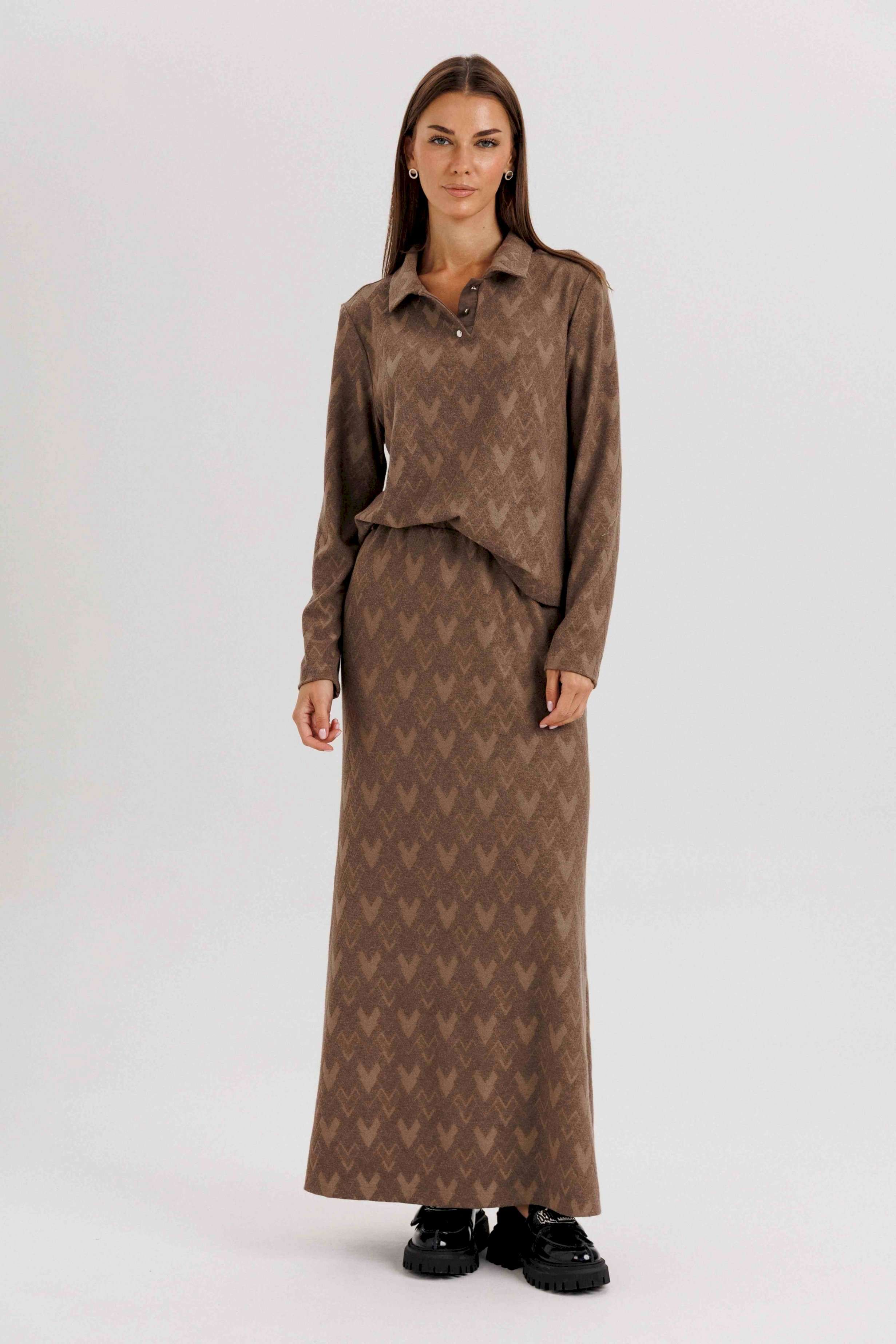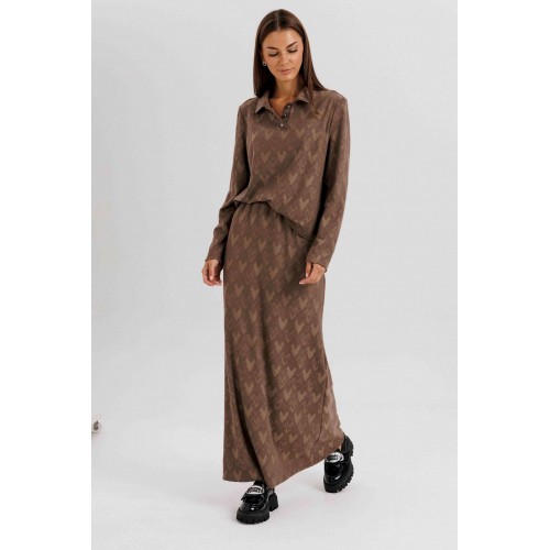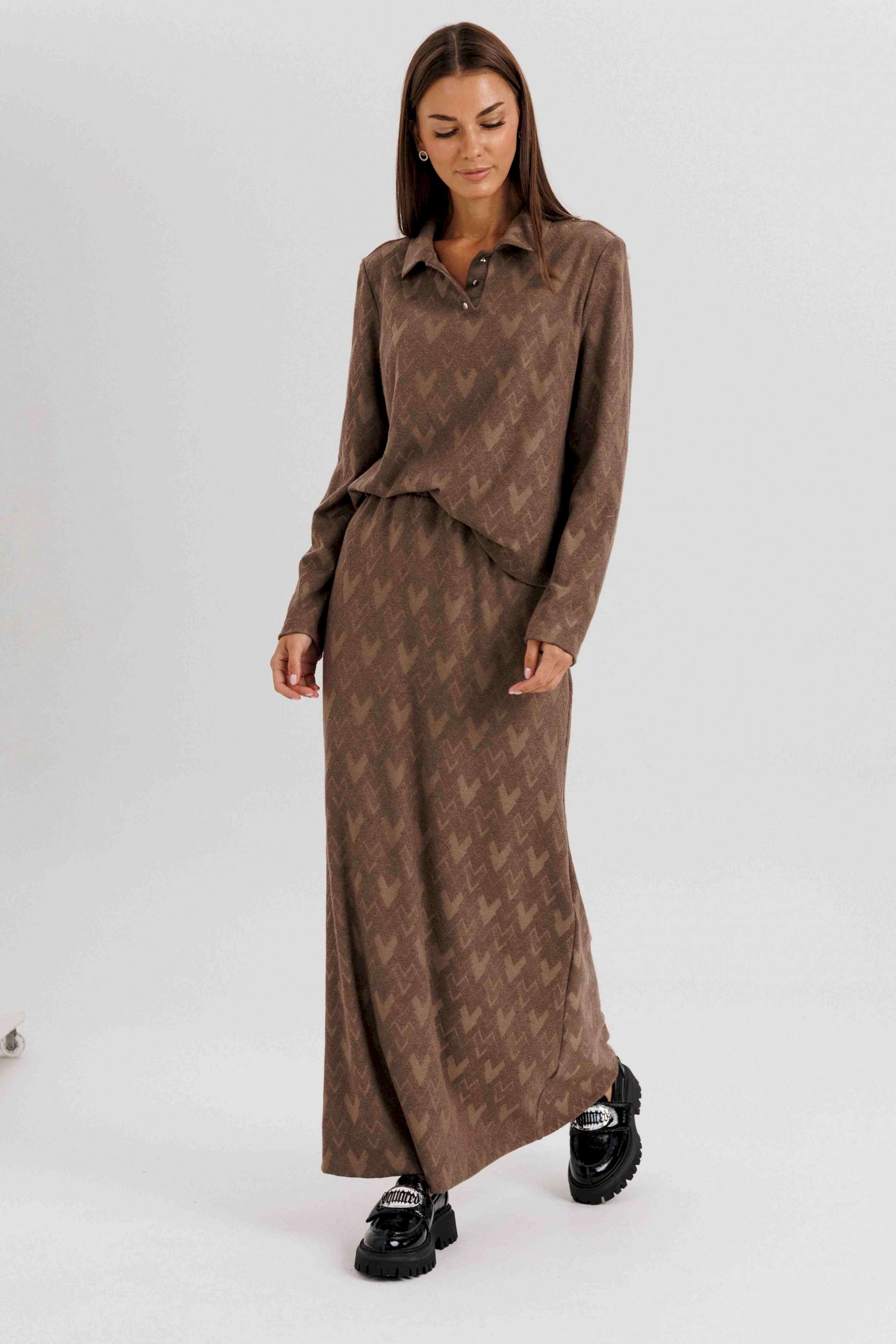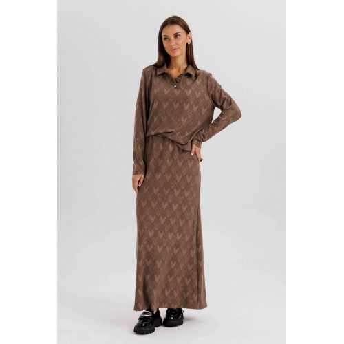 Это модный сет из мягкого трикотажа, включающий в себя джемпер-поло и юбку-«рыбку». Джемпер-поло выполнен с длинным рукавом и отложным воротником, застёжка на несколько пуговиц добавляет спортивной нотки. Свободный крой создаёт расслабленный силуэт и ощущение уюта. Юбка-«рыбка» — длинная, струящаяся, с лёгким расклёшенным низом, который изящно подчёркивает фигуру и добавляет женственности. Принт — тонкий геометрический узор в тон ткани, который придаёт образу глубину и динамику. Цвет — благородный тёплый кофейно-коричневый оттенок, универсальный для осенне-зимнего сезона. В комплекте можно выглядеть одновременно уютно и стильно — его легко адаптировать как для повседневных выходов, так и для более нарядных случаев, если дополнить аксессуарами. Длина джемпера около 60 см. Длина рукава около 61 см. Длина юбки около 90 см.