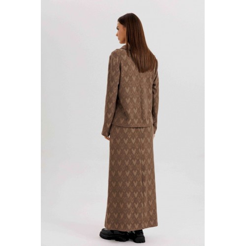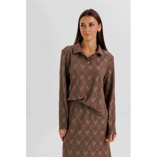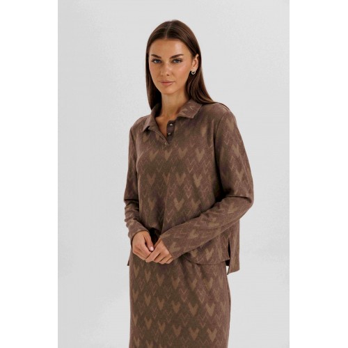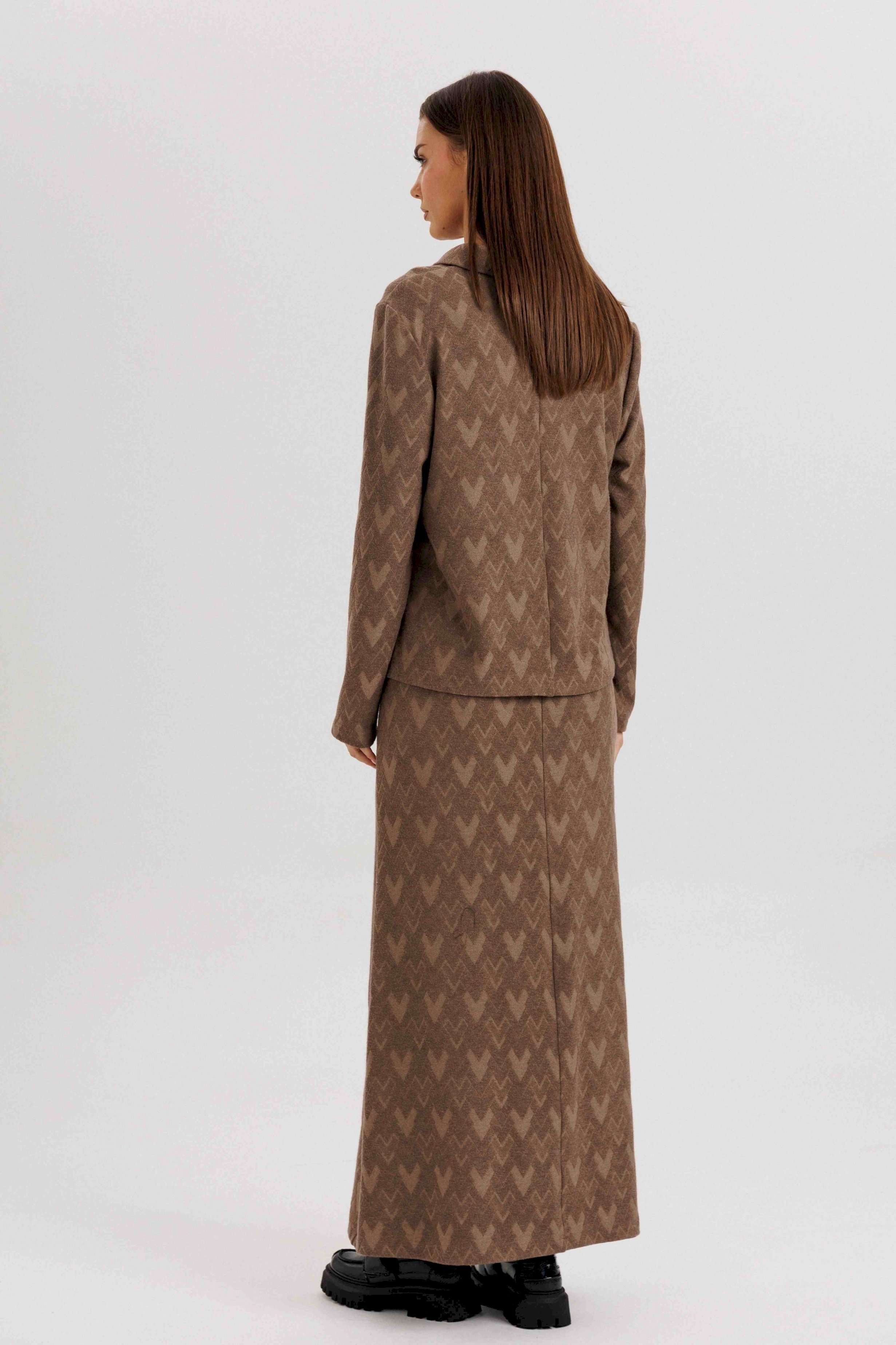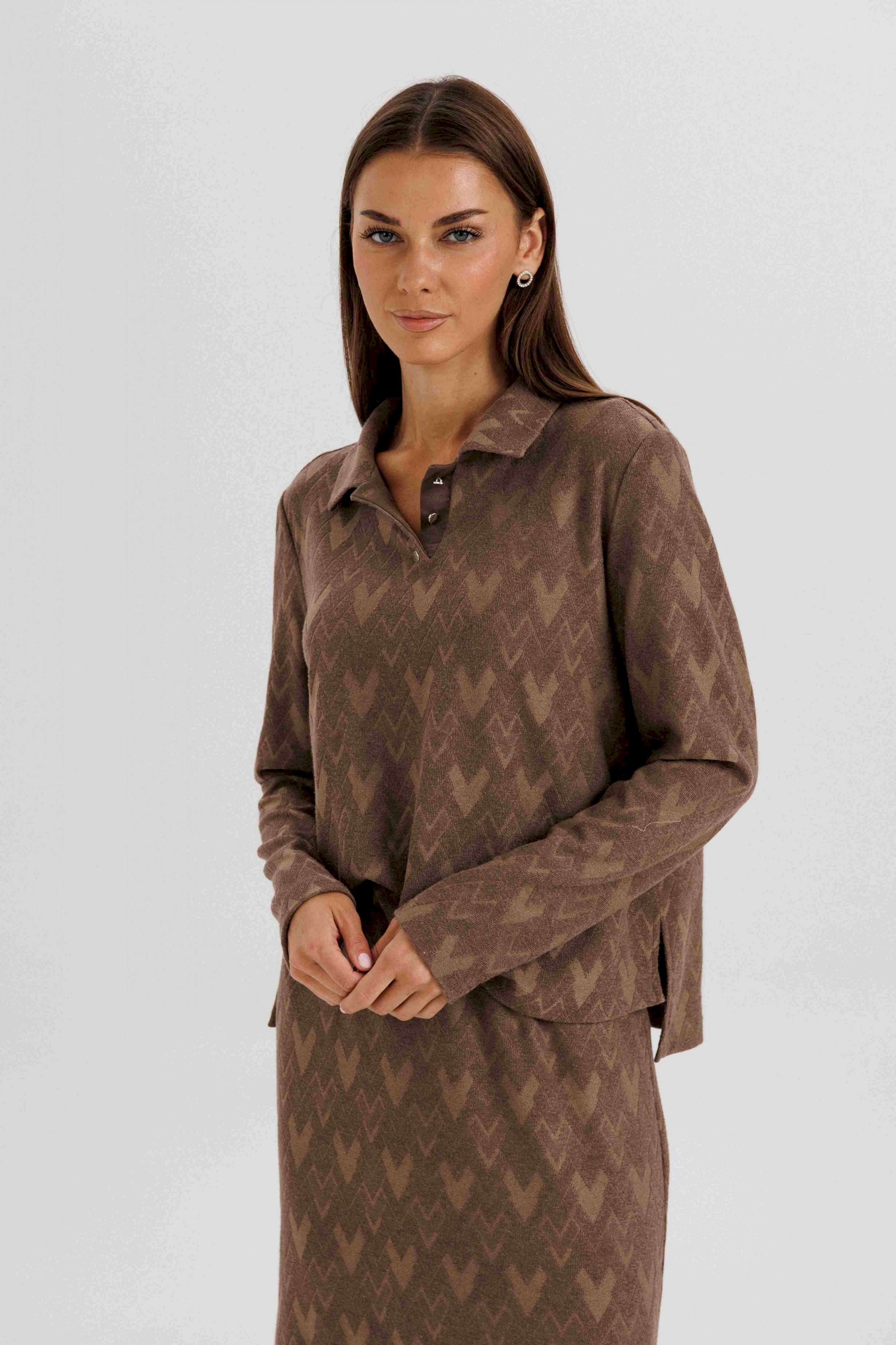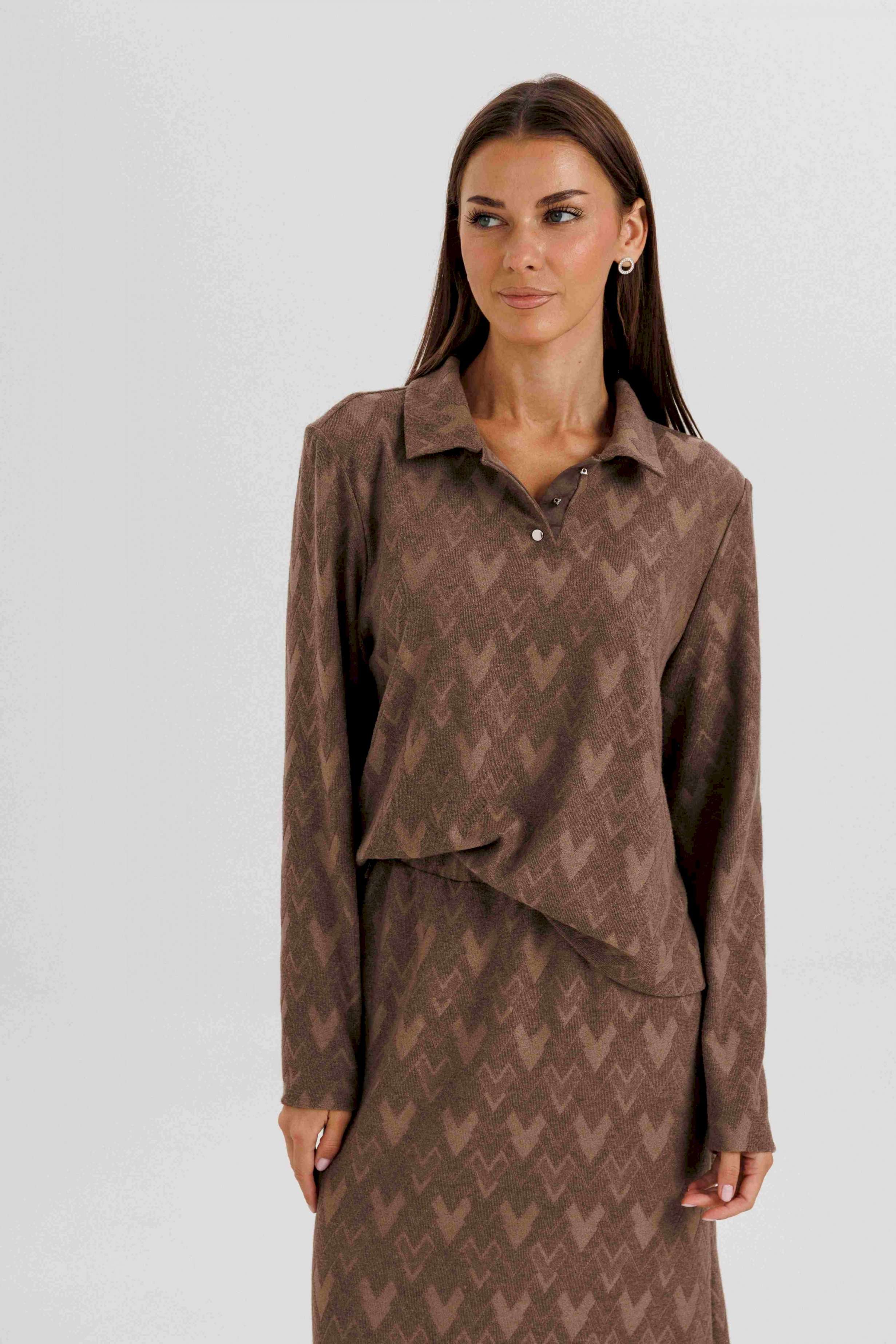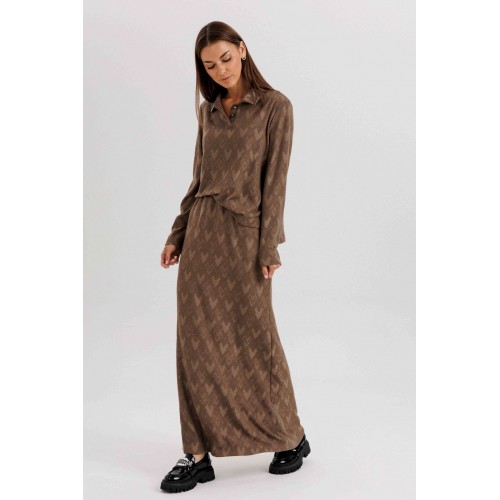 Это модный сет из мягкого трикотажа, включающий в себя джемпер-поло и юбку-«рыбку». Джемпер-поло выполнен с длинным рукавом и отложным воротником, застёжка на несколько пуговиц добавляет спортивной нотки. Свободный крой создаёт расслабленный силуэт и ощущение уюта. Юбка-«рыбка» — длинная, струящаяся, с лёгким расклёшенным низом, который изящно подчёркивает фигуру и добавляет женственности. Принт — тонкий геометрический узор в тон ткани, который придаёт образу глубину и динамику. Цвет — благородный тёплый кофейно-коричневый оттенок, универсальный для осенне-зимнего сезона. В комплекте можно выглядеть одновременно уютно и стильно — его легко адаптировать как для повседневных выходов, так и для более нарядных случаев, если дополнить аксессуарами. Длина джемпера около 60 см. Длина рукава около 61 см. Длина юбки около 90 см.
