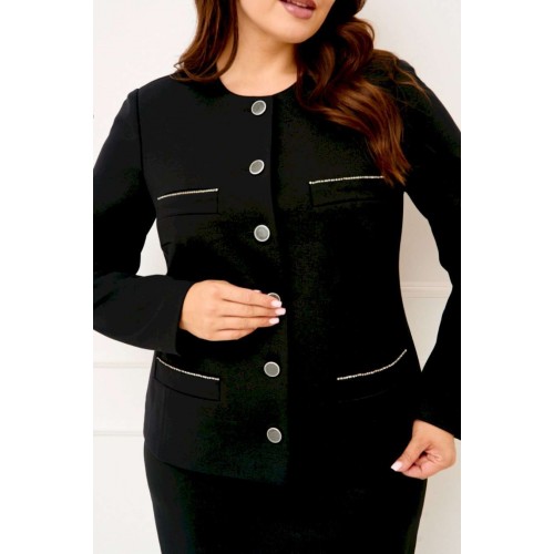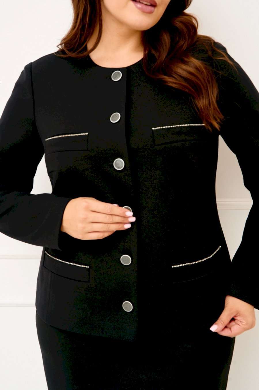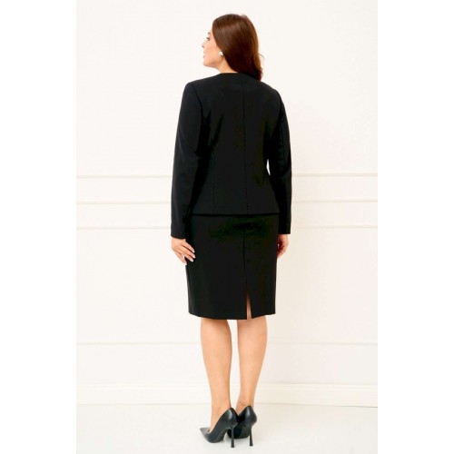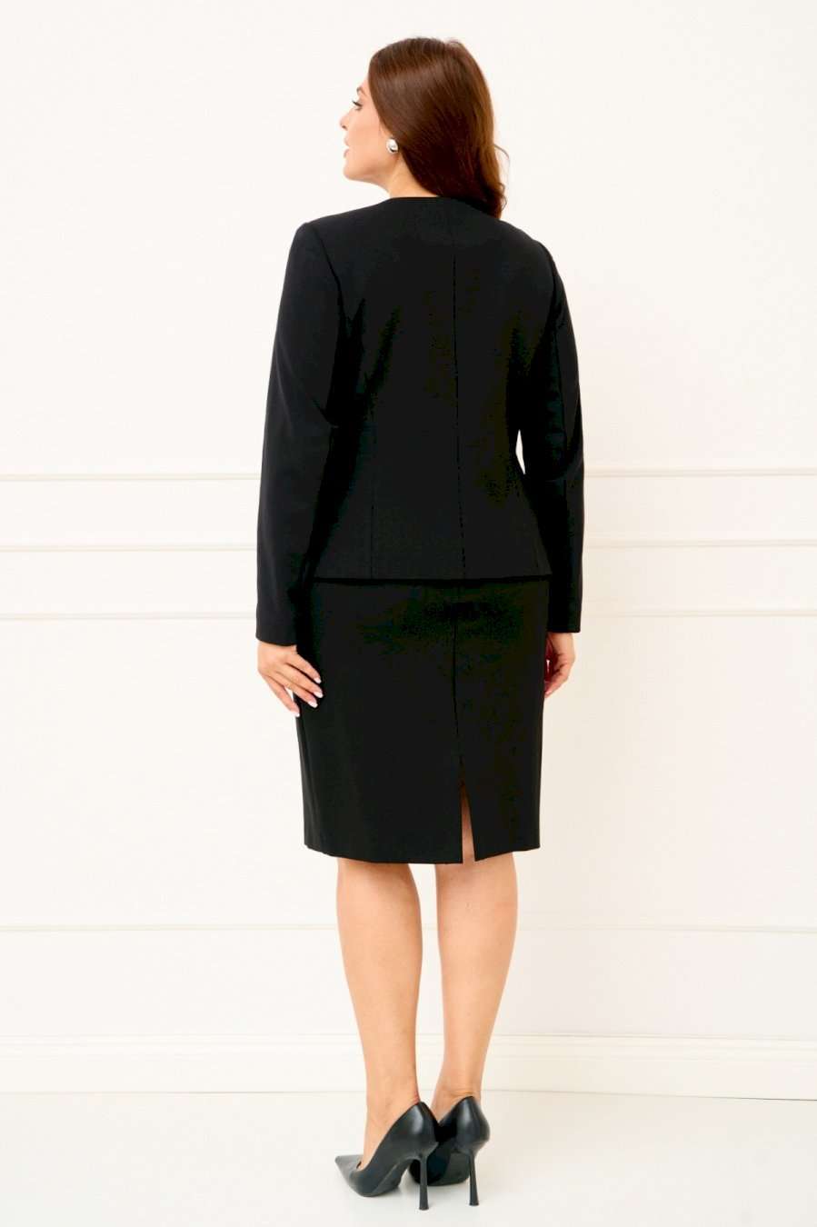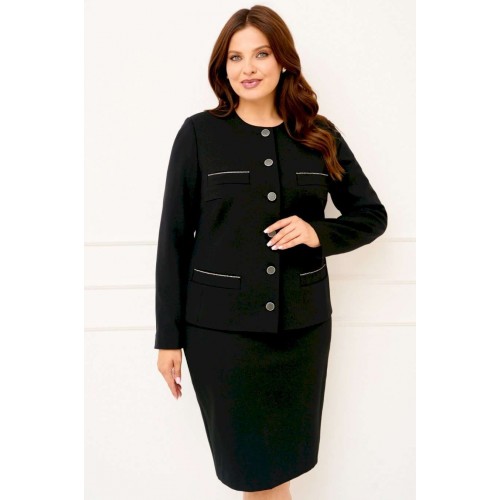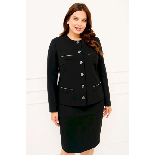 Женский костюм полуприлегающего силуэта, состоящий из жакета и юбки, выполнен из трикотажа средней плотности на эластичной подкладке. Жакет со втачными рукавами и плечевыми накладками; по переду функциональные карманы с декоративной отделочной тесьмой; застежка на петли и пуговицы. Юбка с притачным поясом, в боковые швы которого вставлена резинка для лучшего прилегания; по спинке шлица; застежка на молнию, петлю и пуговицу. Костюм полностью соответсвует заявленному размеру. Уход за натуральными тканями: - рекомендована бережная стирка при температуре не выше 30 градусов;