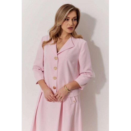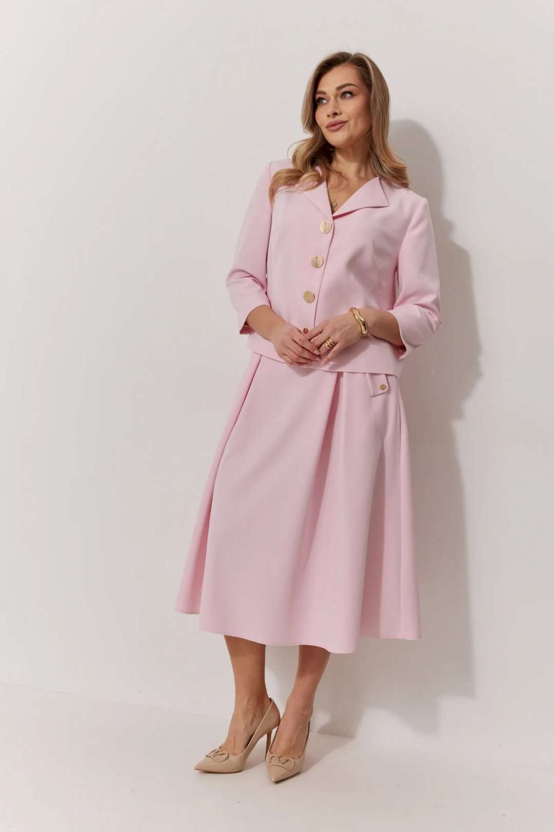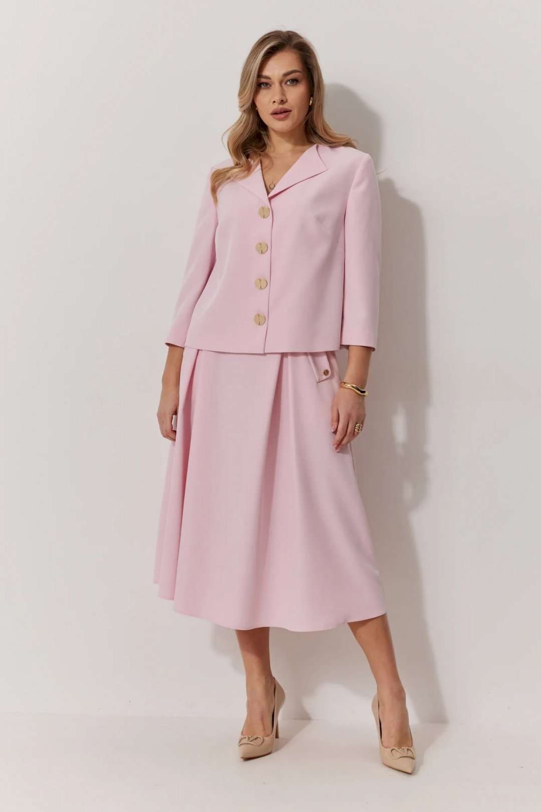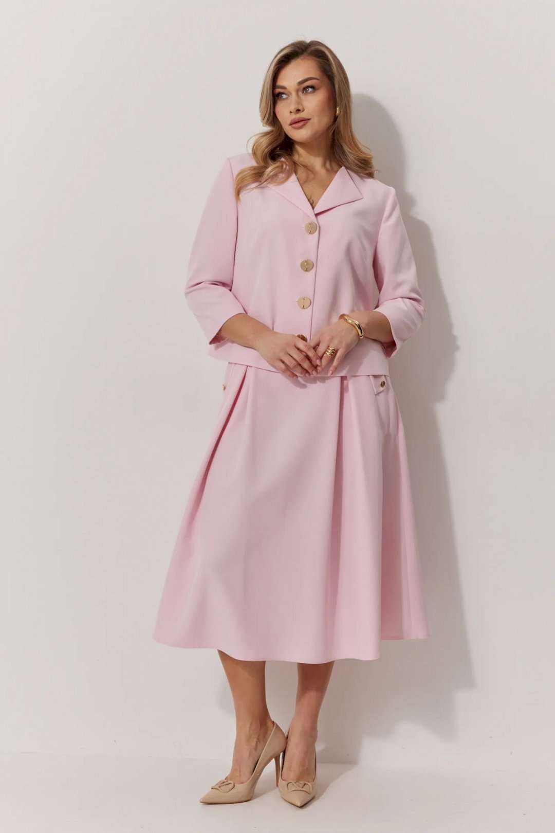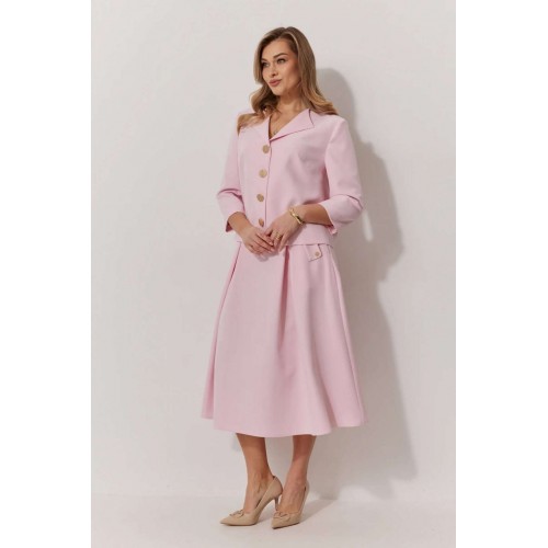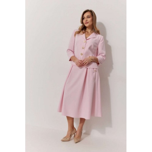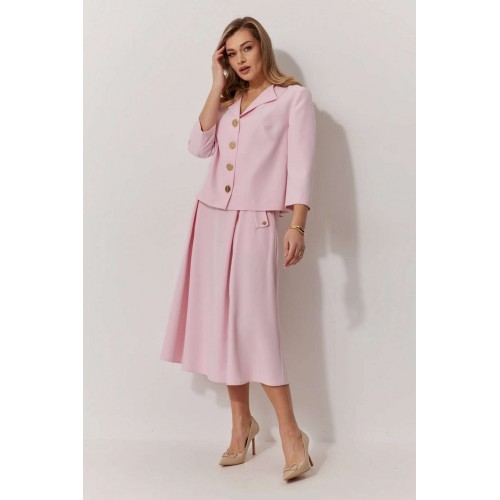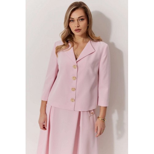 Костюм женский, состоящий из жакета и юбки. Жакет на подкладке, с рукавом и центральной однобортной застежкой на петли и декоративные пуговицы. Длина жакета до линии бедра. По переду обработаны наклонные вытачки. Спинка со средним швом. Горловина V-образной формы с отворачивающимися лацканами. Линия горловины обработана обтачкой. Рукав втачной, двухшовный ¾ длины. Юбка женская на подкладке А – силуэта длиной до середины икры. По переду юбки заложены встречные складки и нстрочены клапаны с декоративными пуговицами. Спинка юбки цельная. Карманы обработаны в боковом шве юбки. По левому боковому шву юбки находится застежка – молния. Верхний срез юбки обработан притачным поясом с резинкой по спинке.