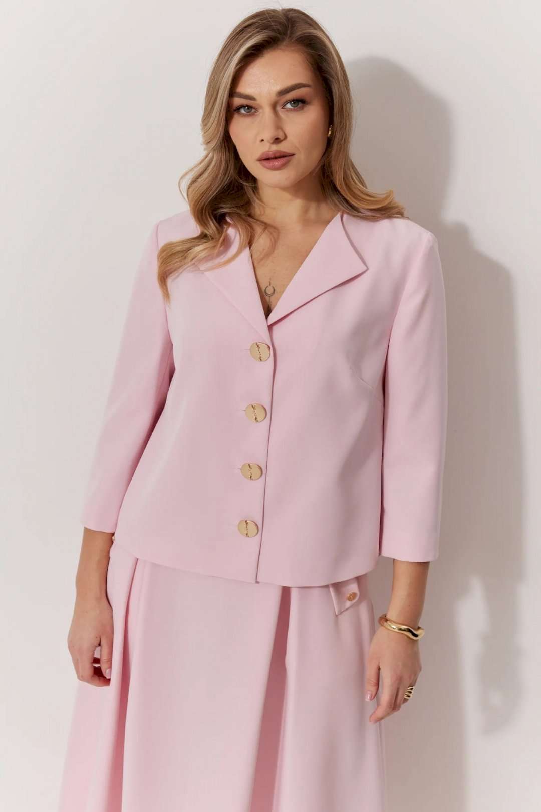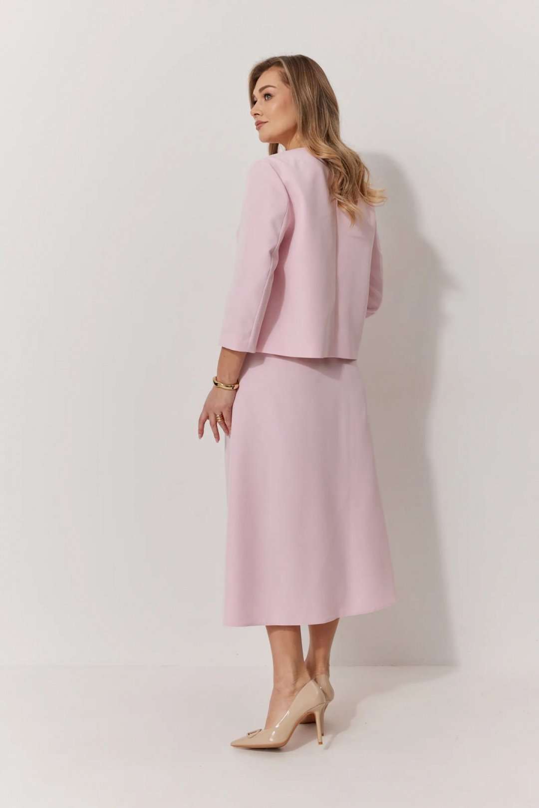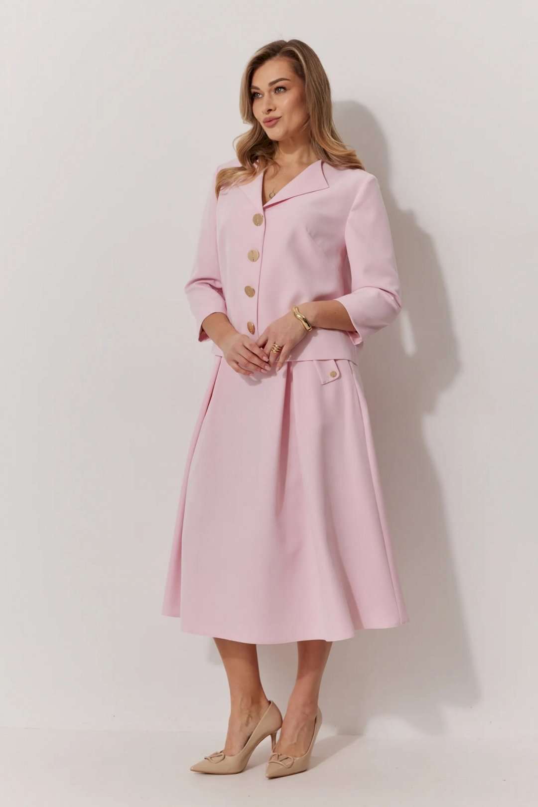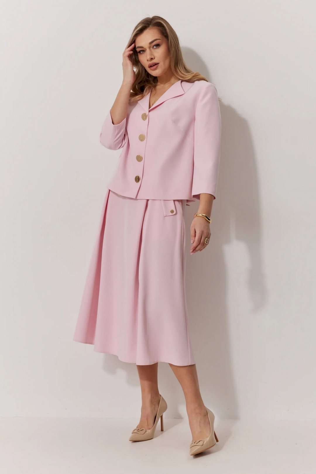 Костюм женский, состоящий из жакета и юбки. Жакет на подкладке, с рукавом и центральной однобортной застежкой на петли и декоративные пуговицы. Длина жакета до линии бедра. По переду обработаны наклонные вытачки. Спинка со средним швом. Горловина V-образной формы с отворачивающимися лацканами. Линия горловины обработана обтачкой. Рукав втачной, двухшовный ¾ длины. Юбка женская на подкладке А – силуэта длиной до середины икры. По переду юбки заложены встречные складки и нстрочены клапаны с декоративными пуговицами. Спинка юбки цельная. Карманы обработаны в боковом шве юбки. По левому боковому шву юбки находится застежка – молния. Верхний срез юбки обработан притачным поясом с резинкой по спинке.