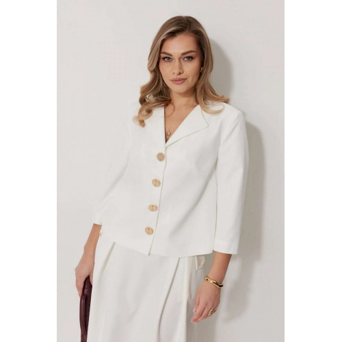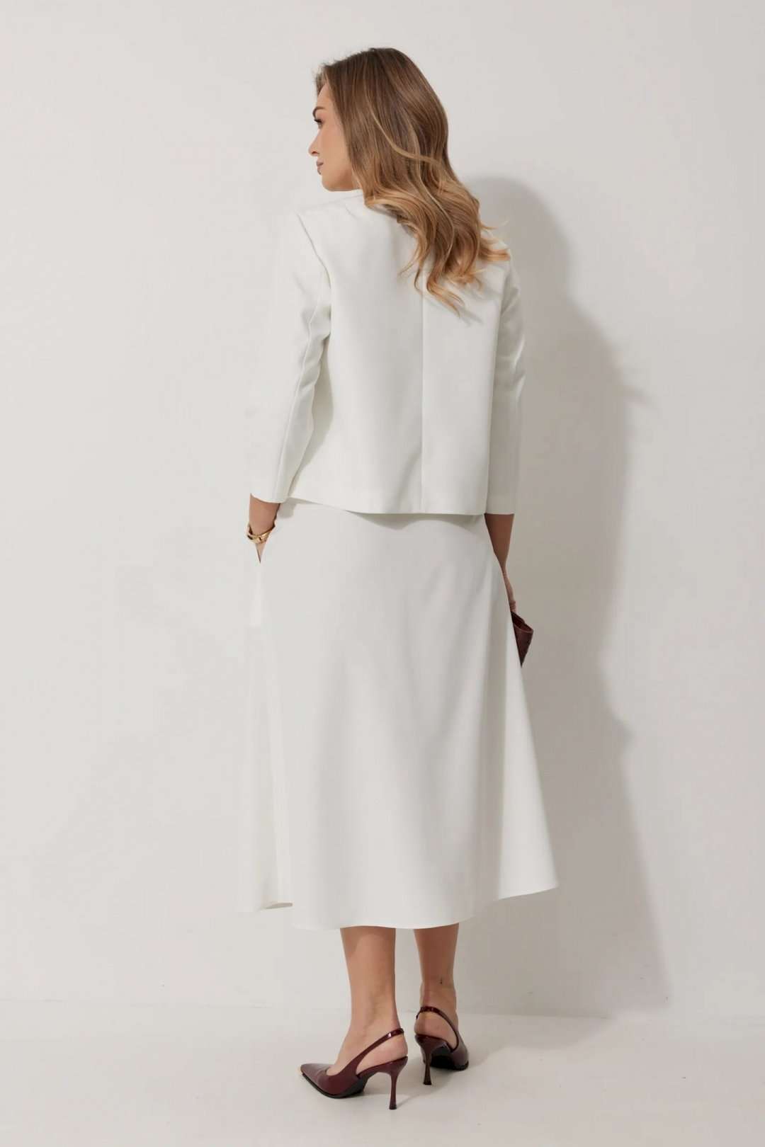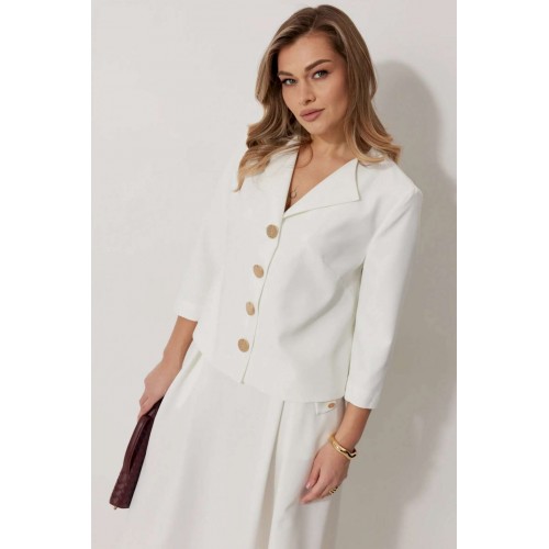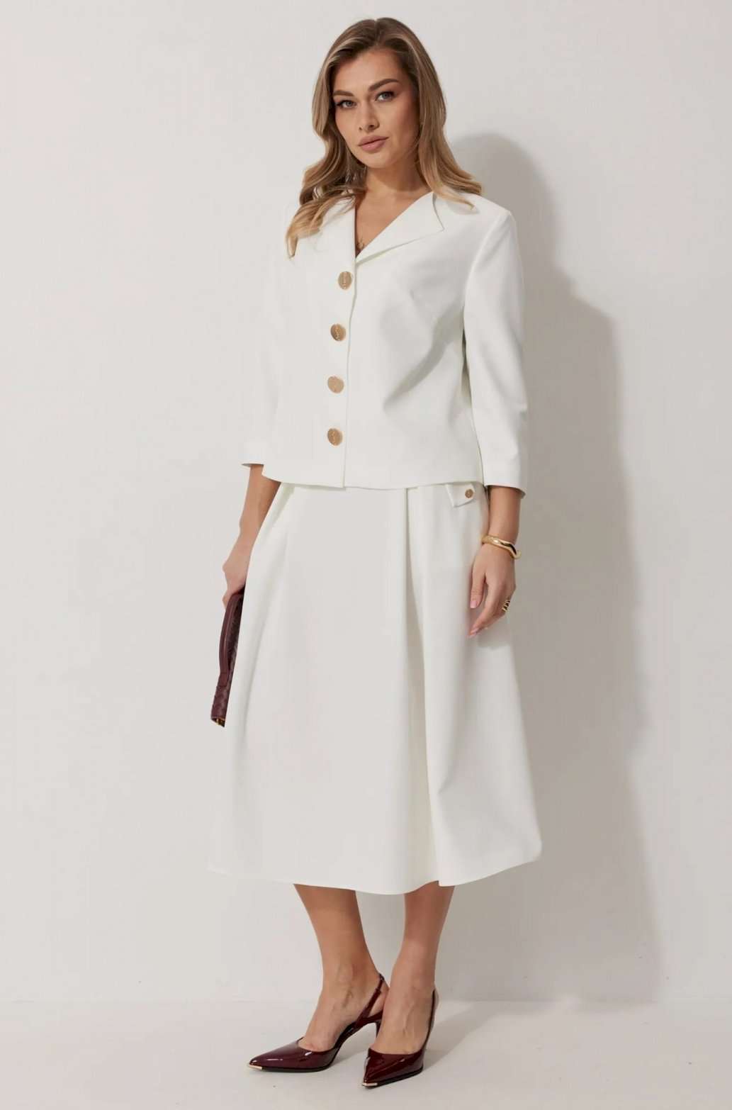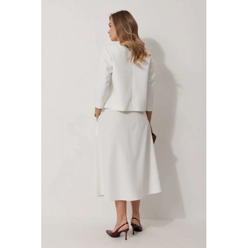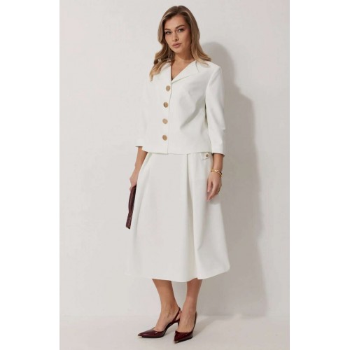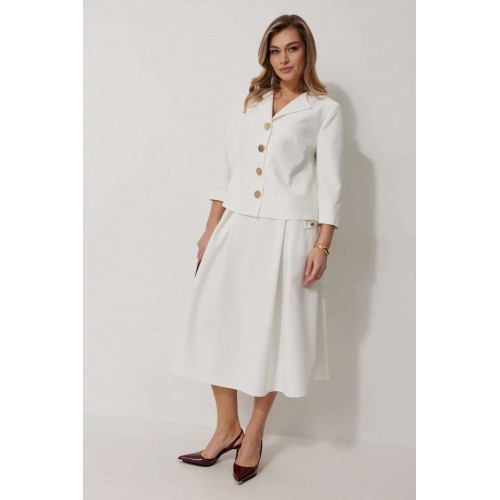 Костюм женский, состоящий из жакета и юбки. Жакет на подкладке, с рукавом и центральной однобортной застежкой на петли и декоративные пуговицы. Длина жакета до линии бедра. По переду обработаны наклонные вытачки. Спинка со средним швом. Горловина V-образной формы с отворачивающимися лацканами. Линия горловины обработана обтачкой. Рукав втачной, двухшовный ¾ длины. Юбка женская на подкладке А – силуэта длиной до середины икры. По переду юбки заложены встречные складки и нстрочены клапаны с декоративными пуговицами. Спинка юбки цельная. Карманы обработаны в боковом шве юбки. По левому боковому шву юбки находится застежка – молния. Верхний срез юбки обработан притачным поясом с резинкой по спинке.