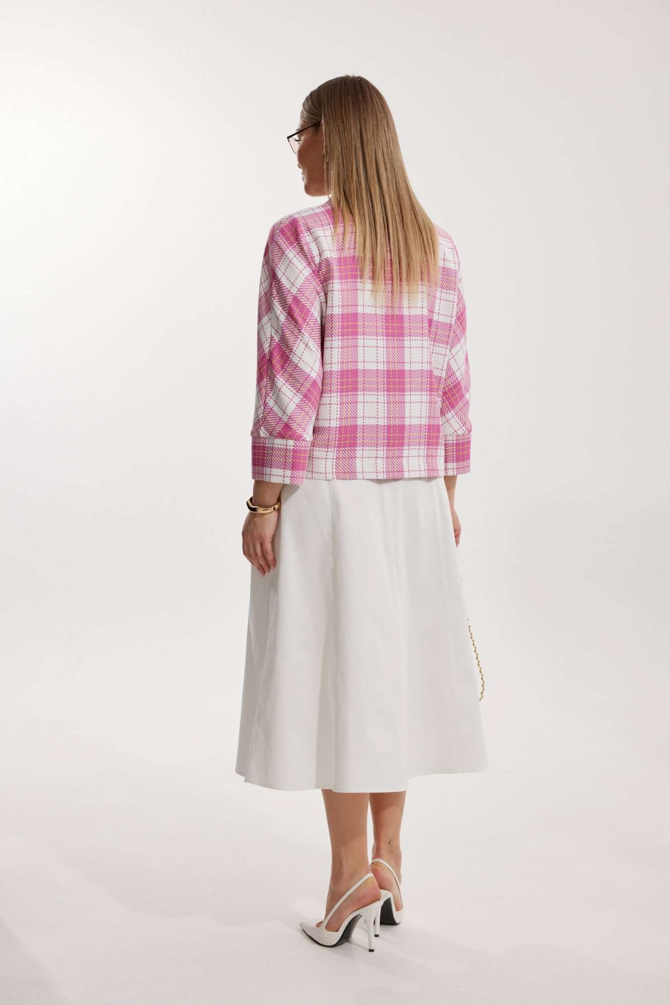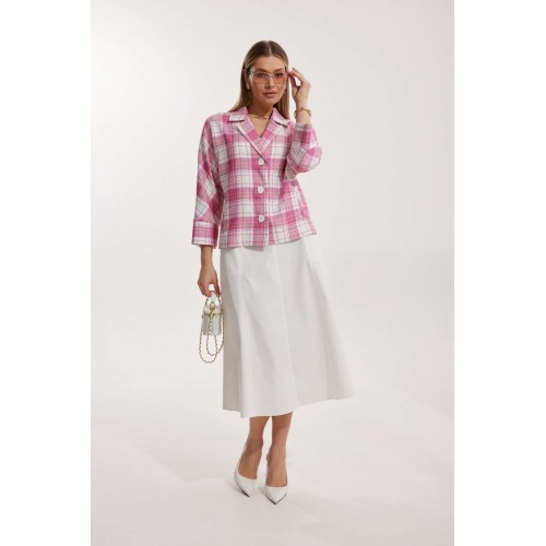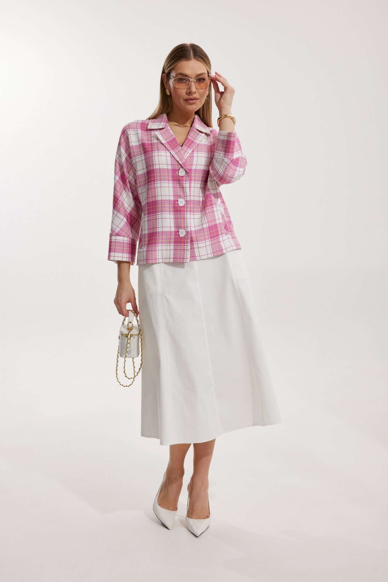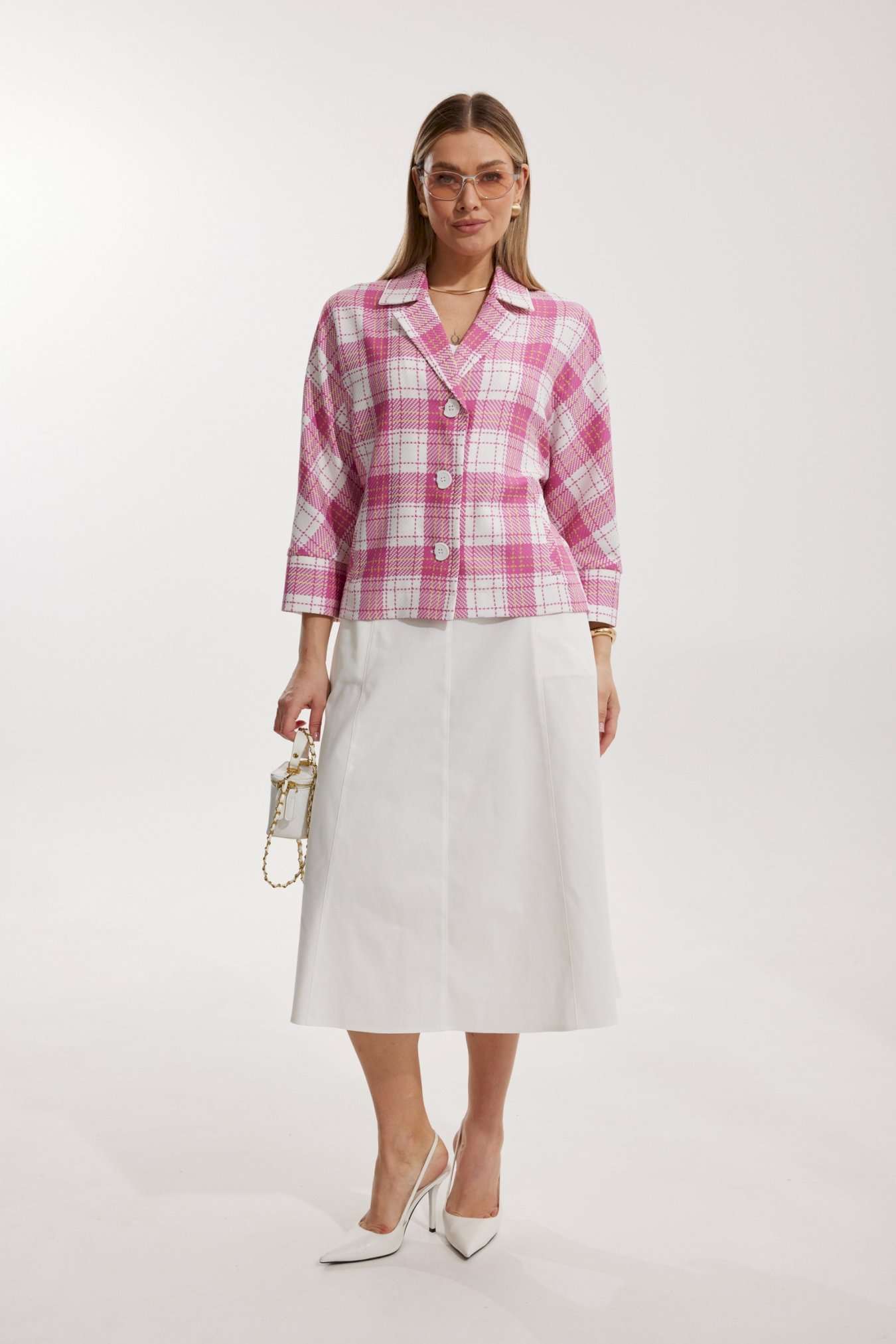 Костюм женский, состоящий из жакета и юбки. Жакет в клетку без подкладки, кроя «летучая мышь», с центральной однобортной застежкой на петли и контрастные пуговицы. По переду обработаны вертикальные прорезные карманы с листочкой. Спинка цельнокроеная. Горловина V-образной формы, обработана воротником пиджачного типа с контрастным кантом. Рукав 7/8, по низу обработан широкой притачной манжетой. Юбка женская А – силуэта длиной до середины икры. Перед юбки состоит из 4 клиньев. Вверху передней части юбки располагается карман с отрезным бочком. Спинка юбки состоит из 4 клиньев. По среднему шву юбки находится застежка – молния. Верхний срез юбки обработан обтачкой.
