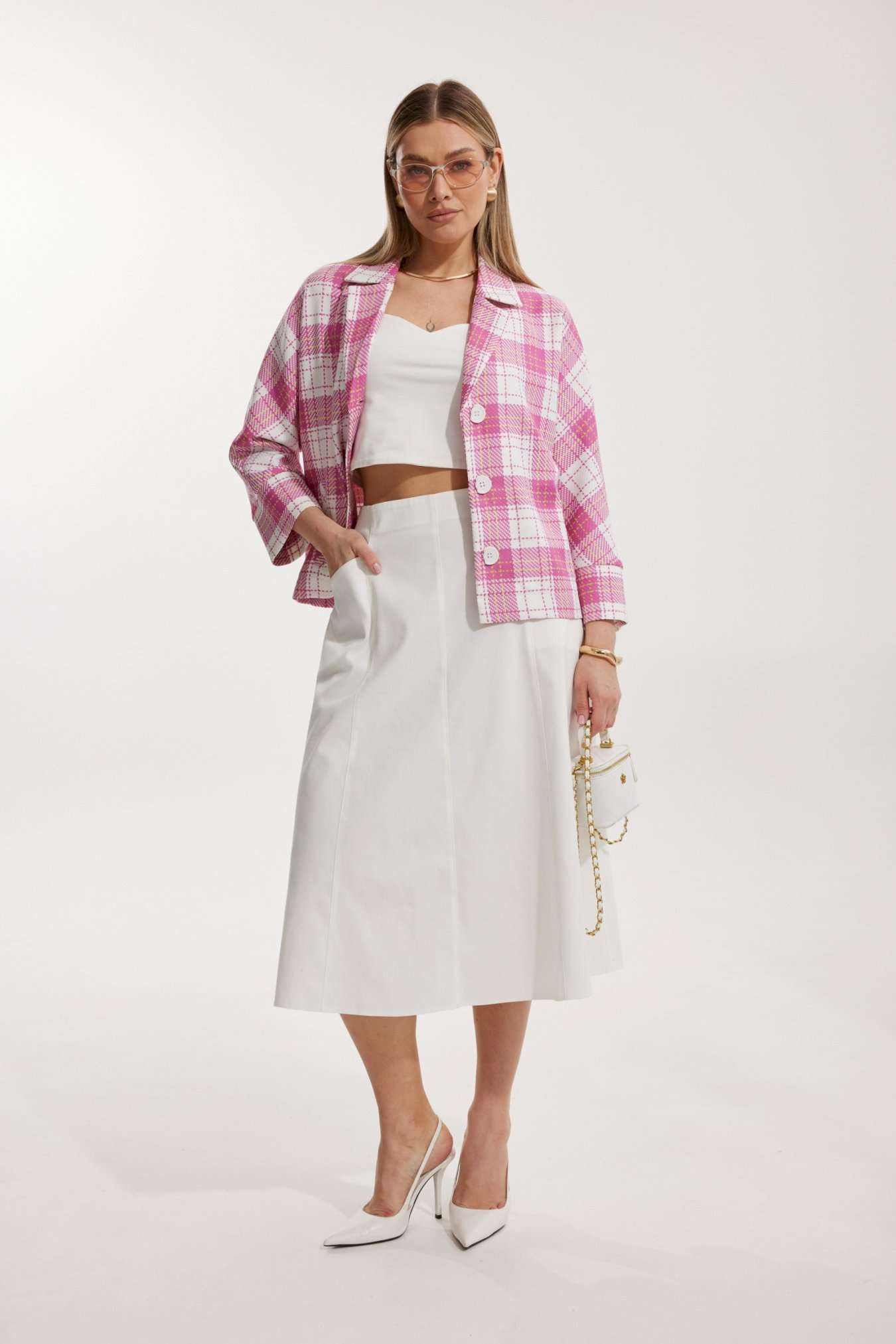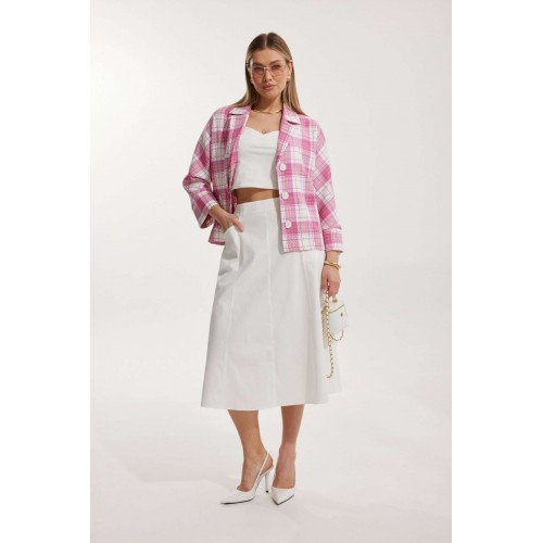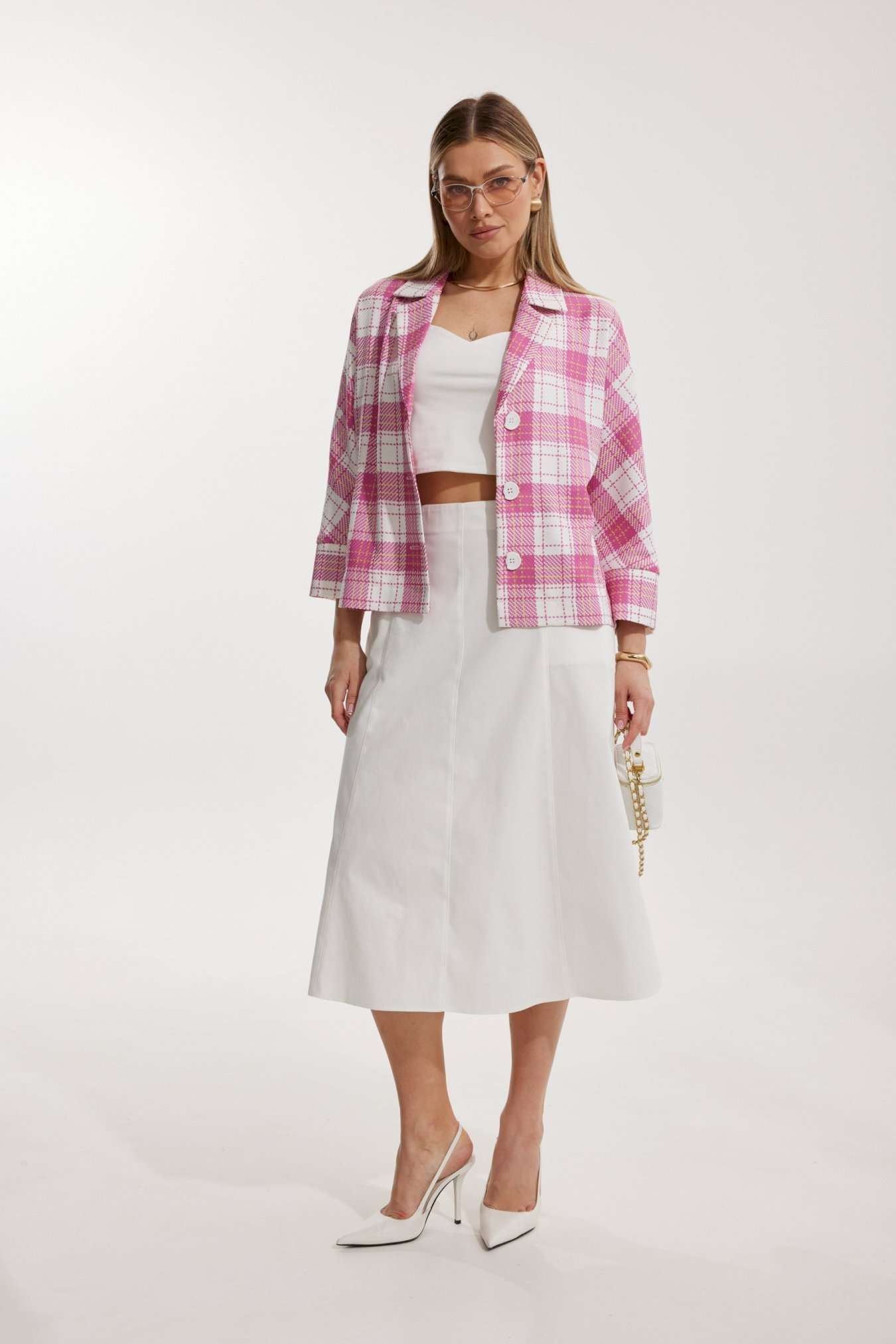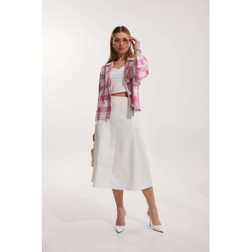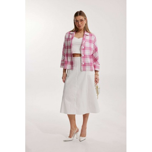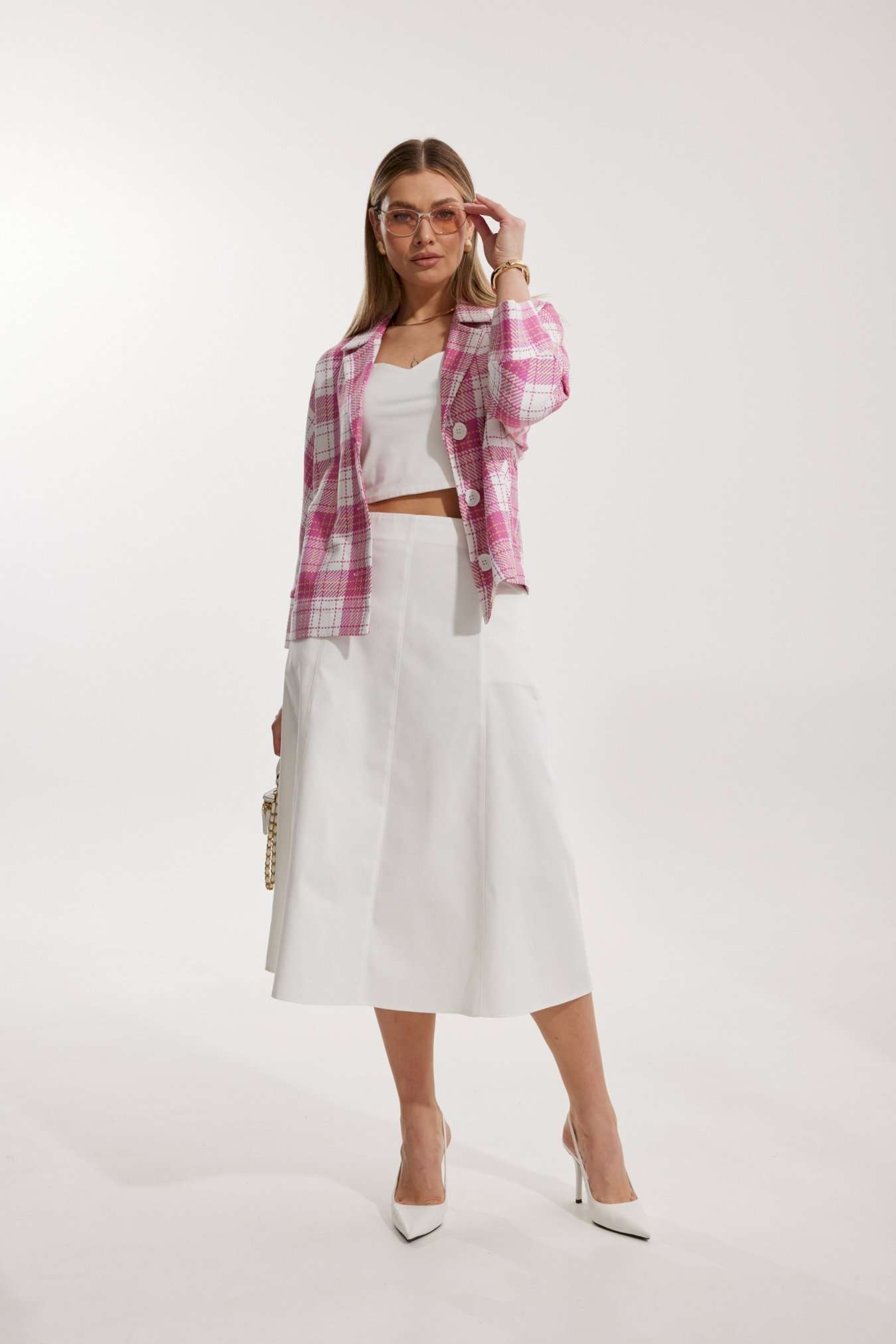 Костюм женский, состоящий из жакета и юбки. Жакет в клетку без подкладки, кроя «летучая мышь», с центральной однобортной застежкой на петли и контрастные пуговицы. По переду обработаны вертикальные прорезные карманы с листочкой. Спинка цельнокроеная. Горловина V-образной формы, обработана воротником пиджачного типа с контрастным кантом. Рукав 7/8, по низу обработан широкой притачной манжетой. Юбка женская А – силуэта длиной до середины икры. Перед юбки состоит из 4 клиньев. Вверху передней части юбки располагается карман с отрезным бочком. Спинка юбки состоит из 4 клиньев. По среднему шву юбки находится застежка – молния. Верхний срез юбки обработан обтачкой.