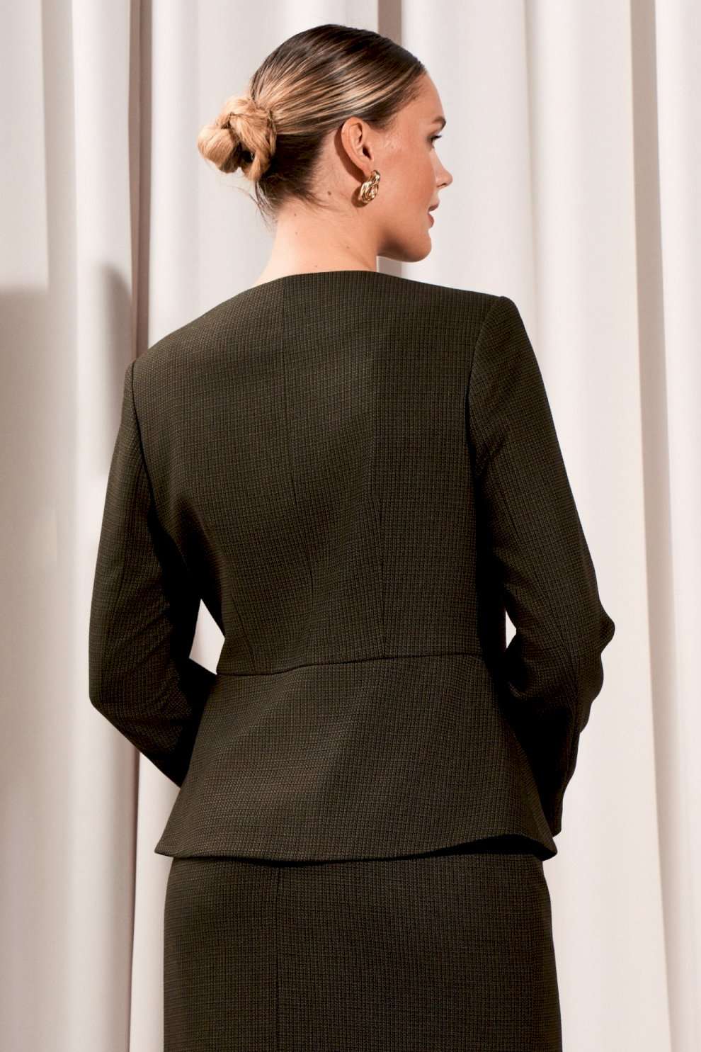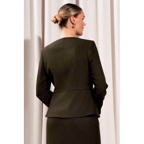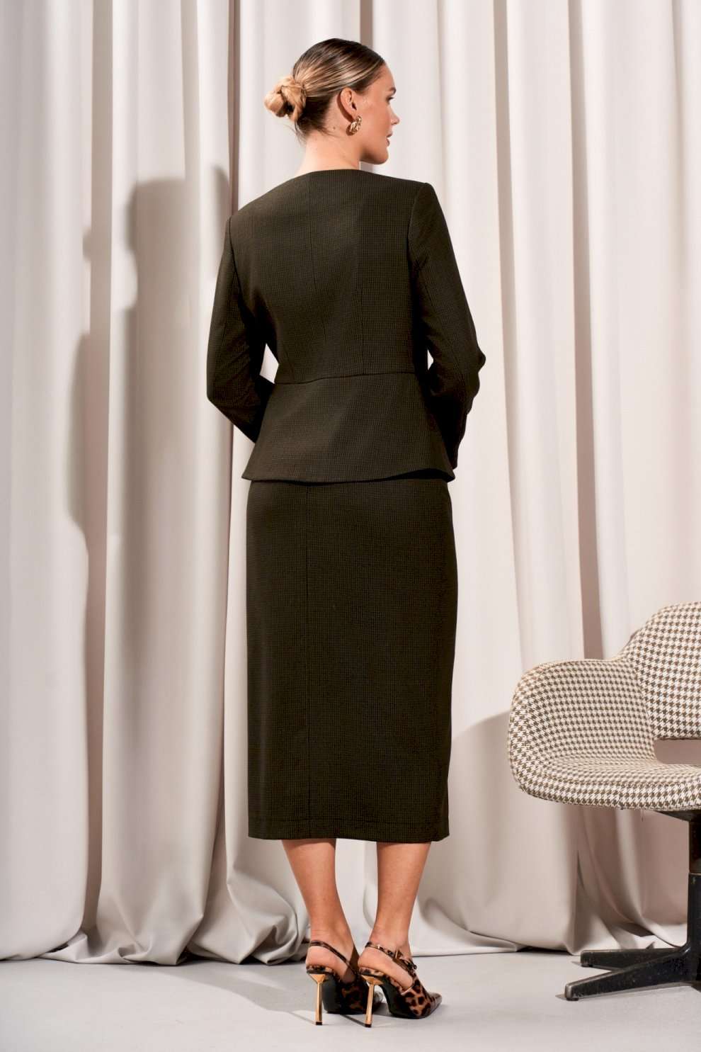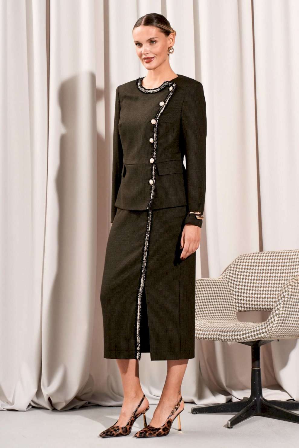 Костюм юбочный Жакет с округлым вырезом горловины и смещённой застёжкой на петли и пуговицы. Изделие с отрезной баской. Перед с клапанами от баски. Спинка со средним швом и талиевыми вытачками до баски. Рукава втачные. По горловине и краю борта располагается декоративная тесьма. Жакет на подкладке. Юбка на поясе с резинкой. Переднее полотнище с разрезом в нижней части и настрочной декоративной тесьмой. Заднее полотнище с потайной молнией в среднем шве. Юбка на подкладке. ВОЗМОЖНА ЗАМЕНА ФУРНИТУРЫ НА АНАЛОГИЧНУЮ ТАКОГО ЖЕ КАЧЕСТВА.
