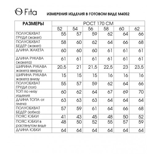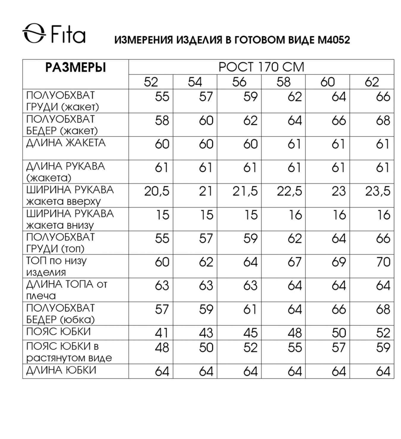 Состав: жакет: 60% вискоза, 36% полиамид , 4% спандекс; юбка: 70% полиэстер, 30% вискоза; блузка: 95% искусственный шелк, 5% спандекс.