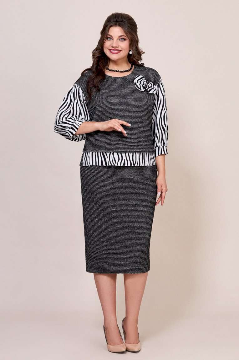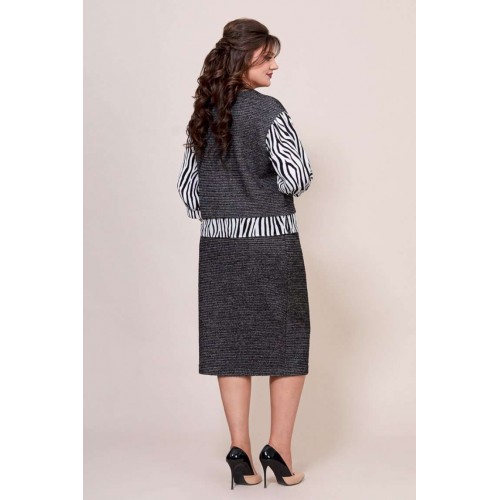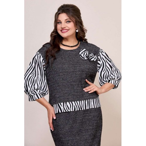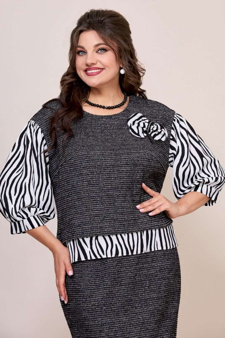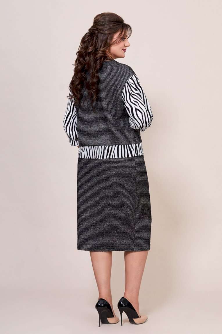 Стильный, женский комплект полу-прилегающего покроя, выполнен из трикотажного полотна, состоит из блузы и юбки. Блуза выполнена из трикотажного полотна, в качестве отделки используется плательная ткань с принтом. Горловина округлой формы, на обтачке, по низу блузы выполнена имитация рубашки, притачена плательная ткань, по боковым швам разрезы. Рукав спущенного покроя, выполнен из плательной ткани с принтом, присборен по окату и по низу на манжет. Спинка идентична полочке, также в качестве декора на полочке съемная брошь ручной работы. Юбка трикотажная, прямого покроя, верхний срез на поясе с резинкой. Элегантный и в то же время удобный комплект станет вашим любимчиком для любого мероприятия! Длина блузы 56см, длина юбки 68см. В 52р Блуза: Ширина груди- 55см, Ширина талии -53см, Ширина бедер -56см, длина рукава- 40см., ширина рукава 25см. Юбка: Ширина талии -38см резинка, Ширина бедер- 57см.