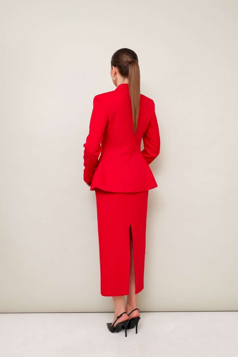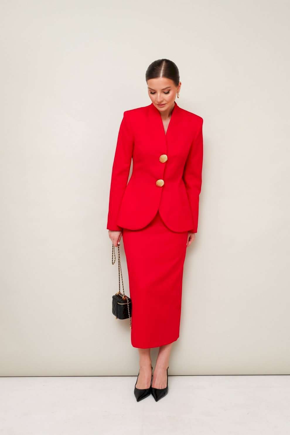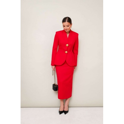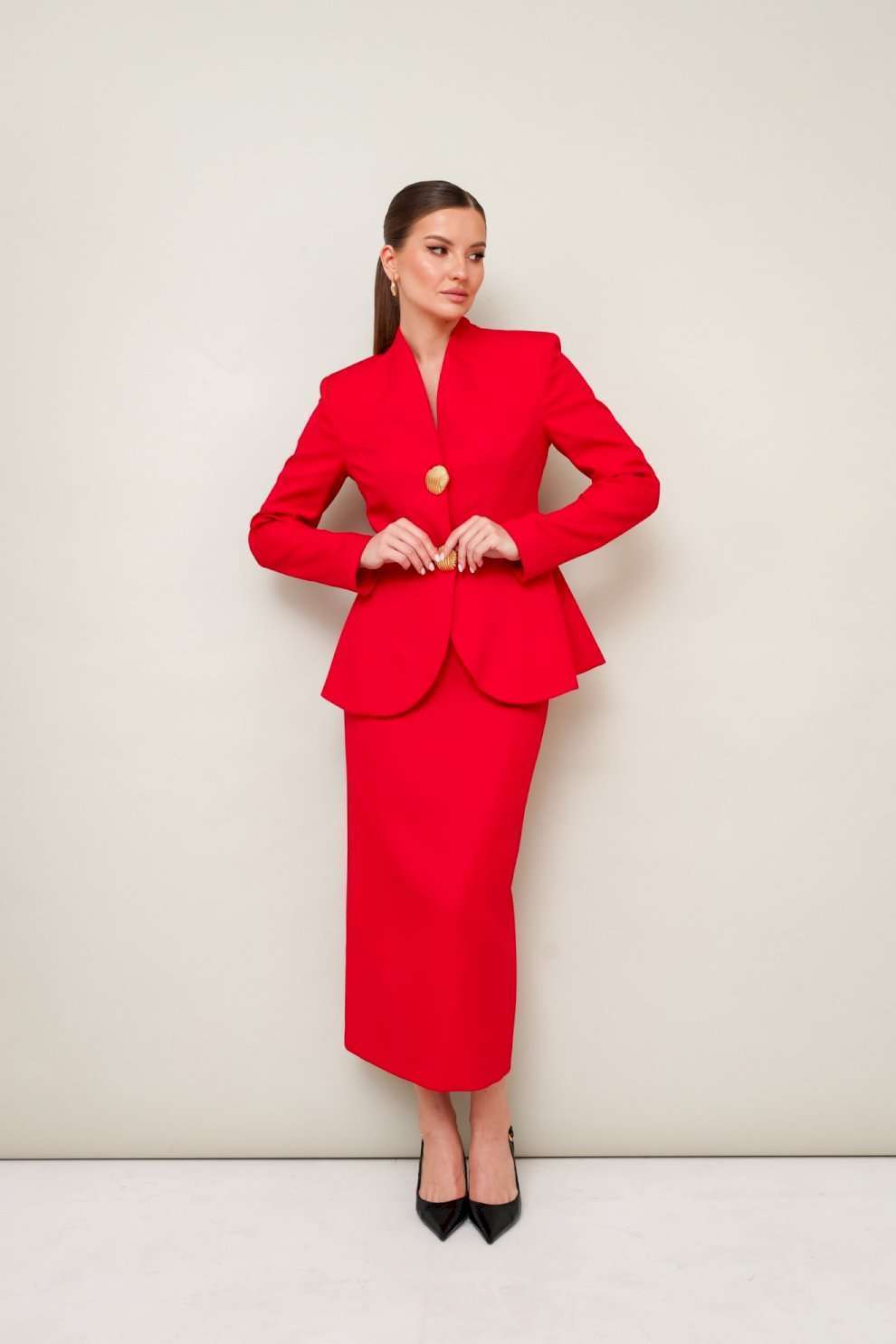 Костюм с юбкой 11-452-1 Pur Pur − яркий и стильный выбор для современных женщин. Коллекция бренда Pur Pur представляет этот костюм, выполненный из качественной костюмной ткани с добавлением полиэстера и спандекса. Жакет прилегающего силуэта, расширенный к низу, с удобной застёжкой на потайные кнопки и акцентными пуговицами. Горловина оформлена цельнокроеной стойкой и V-образным вырезом, придающим элегантности. Рукава втачные, с двухшовной конструкцией. Спинка жакета с рельефами и средним швом для идеальной посадки. Миди-юбка оснащена скрытой молнией и шлицей для удобства движения. Ярко-красный цвет и строгий классический стиль делают этот комплект отличным выбором для деловых встреч и стильных мероприятий в осенне-зимний период.