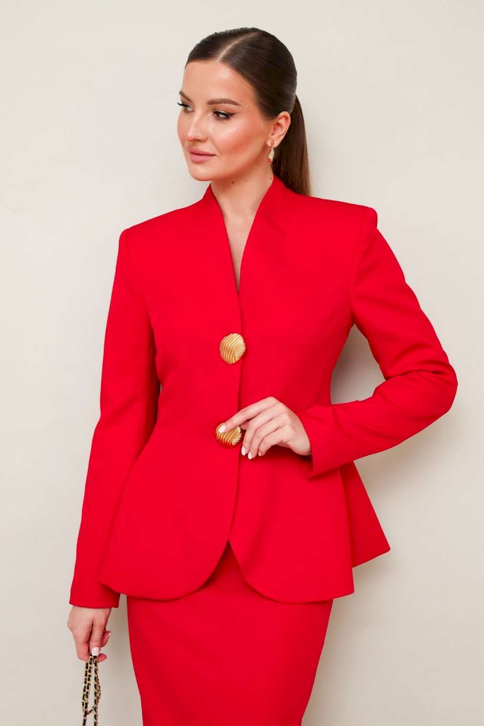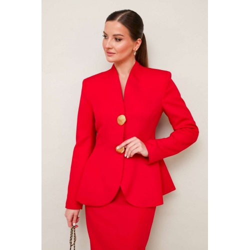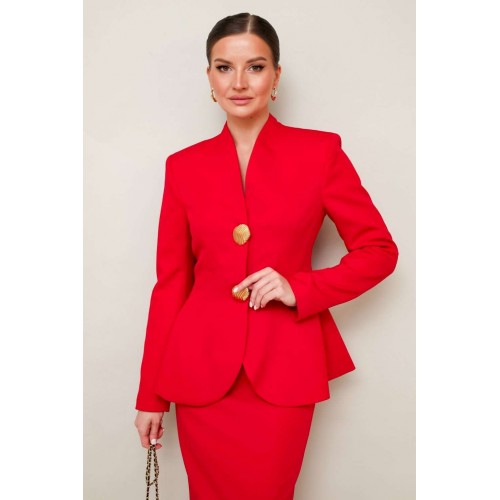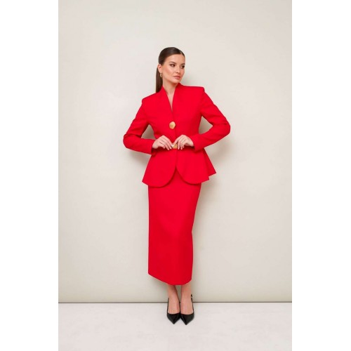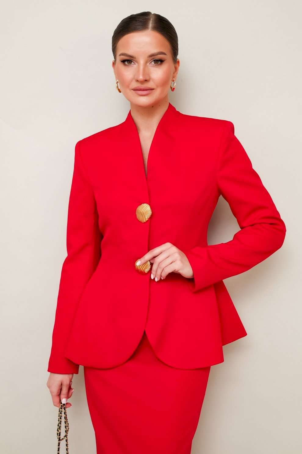 Костюм с юбкой 11-452-1 Pur Pur − яркий и стильный выбор для современных женщин. Коллекция бренда Pur Pur представляет этот костюм, выполненный из качественной костюмной ткани с добавлением полиэстера и спандекса. Жакет прилегающего силуэта, расширенный к низу, с удобной застёжкой на потайные кнопки и акцентными пуговицами. Горловина оформлена цельнокроеной стойкой и V-образным вырезом, придающим элегантности. Рукава втачные, с двухшовной конструкцией. Спинка жакета с рельефами и средним швом для идеальной посадки. Миди-юбка оснащена скрытой молнией и шлицей для удобства движения. Ярко-красный цвет и строгий классический стиль делают этот комплект отличным выбором для деловых встреч и стильных мероприятий в осенне-зимний период.