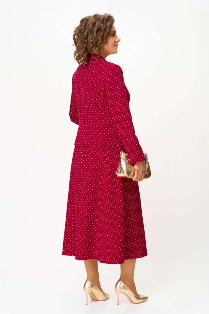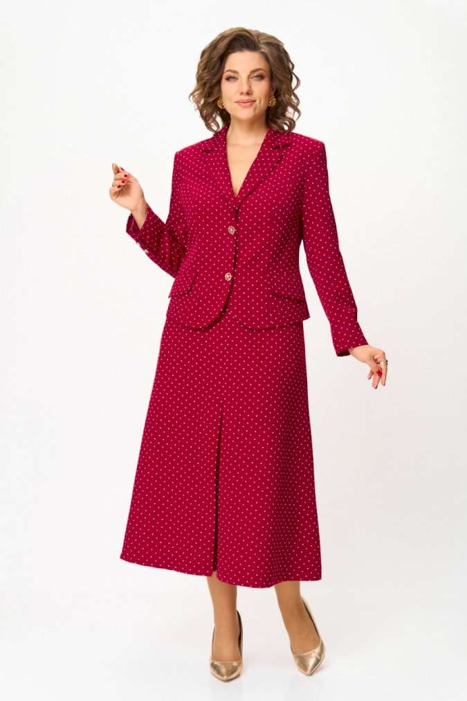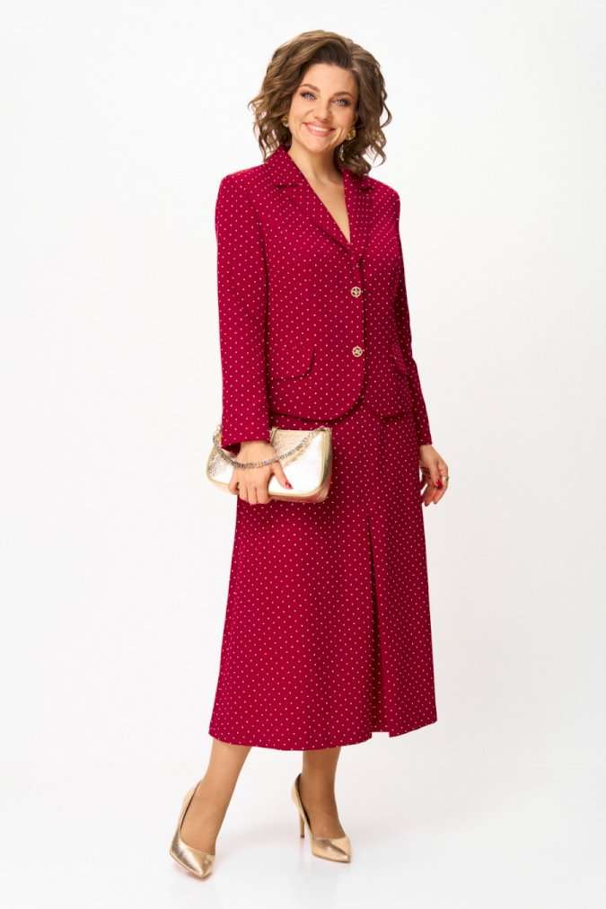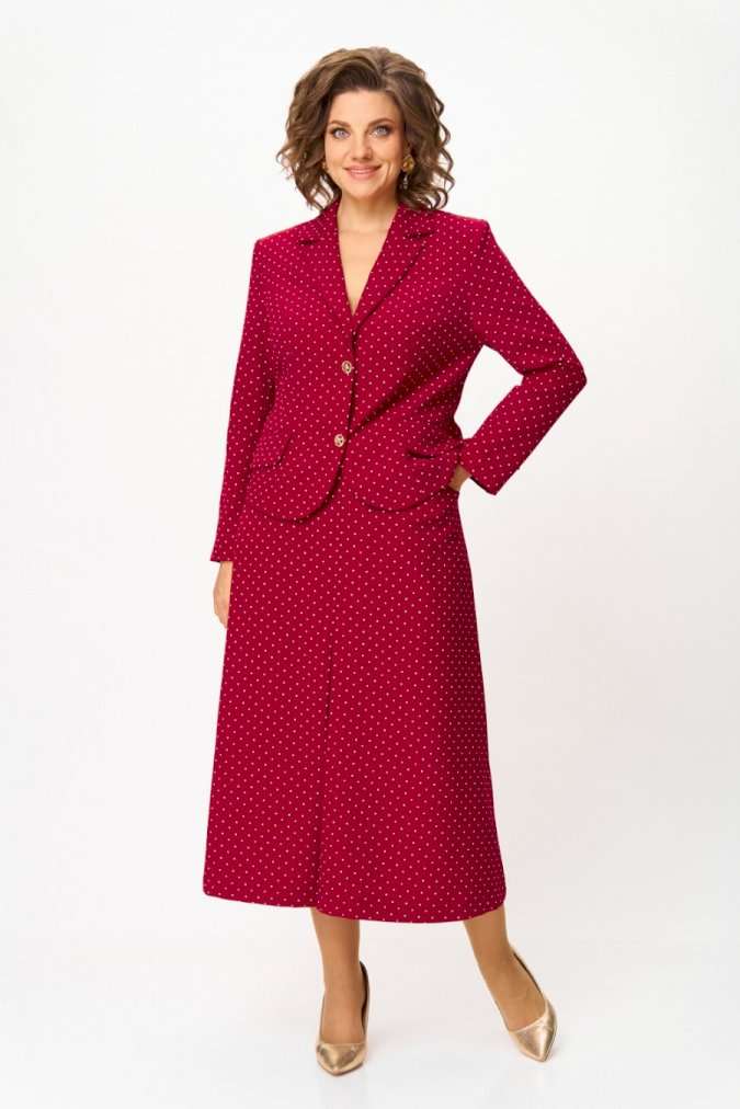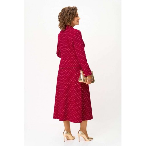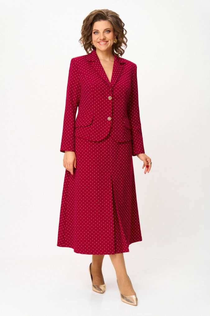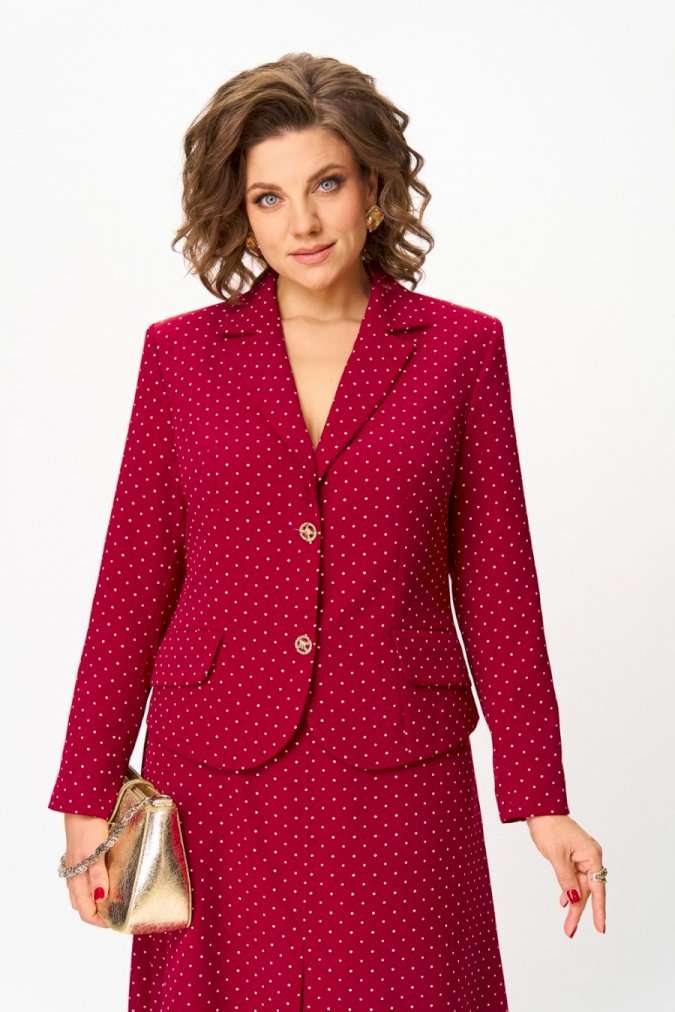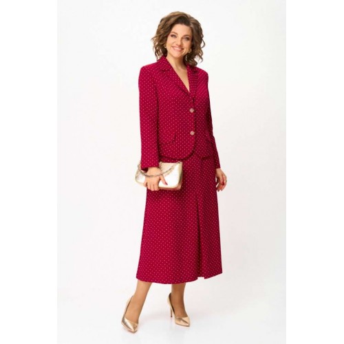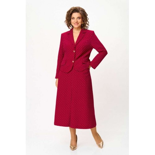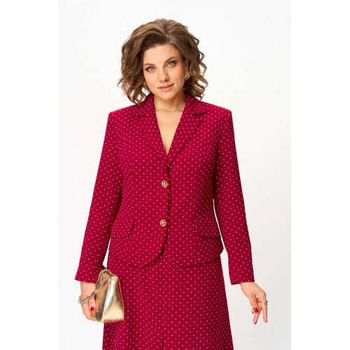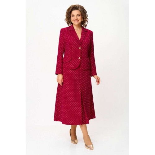Костюм женский двухпредметный состоящий из жакета и юбки. Жакет полуприлегающего силуэта с втачным рукавом. Застежка центральная на петли и пуговицы. Воротник отложной с лацканами. По переду рельефы от проймы и прорезные карманы с клапаном. Спинка со средним швом и рельефами от проймы. Спинка со средним швом и рельефами от проймы. Рукав длинный двухшовный, по низу декоративная шлица с пуговицами. Юбка женская расширенная к низу, на притачном поясе. Застежка молния по спинке, на петлю и пуговицу на поясе. Переднее полотнище со средним швом посередине и встречной складкой по низу. Для удобства посадки резинка по бокам в поясе. Длина юбки ниже середины икры. Изделие на подкладке. Фурнитура может меняться от наличия. Длина по спинке: 56 см Длина рукава: 62 см Длина юбки: 87 см