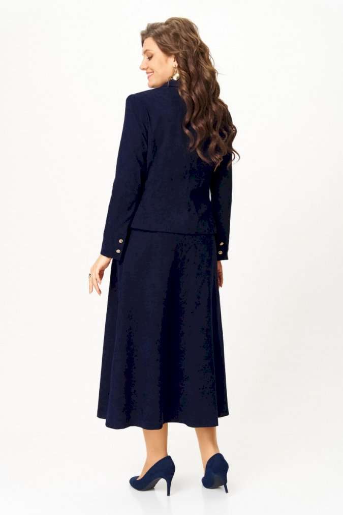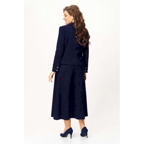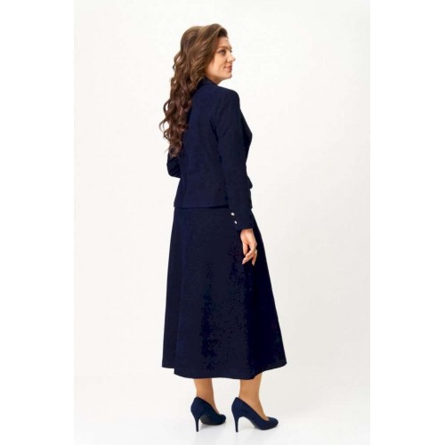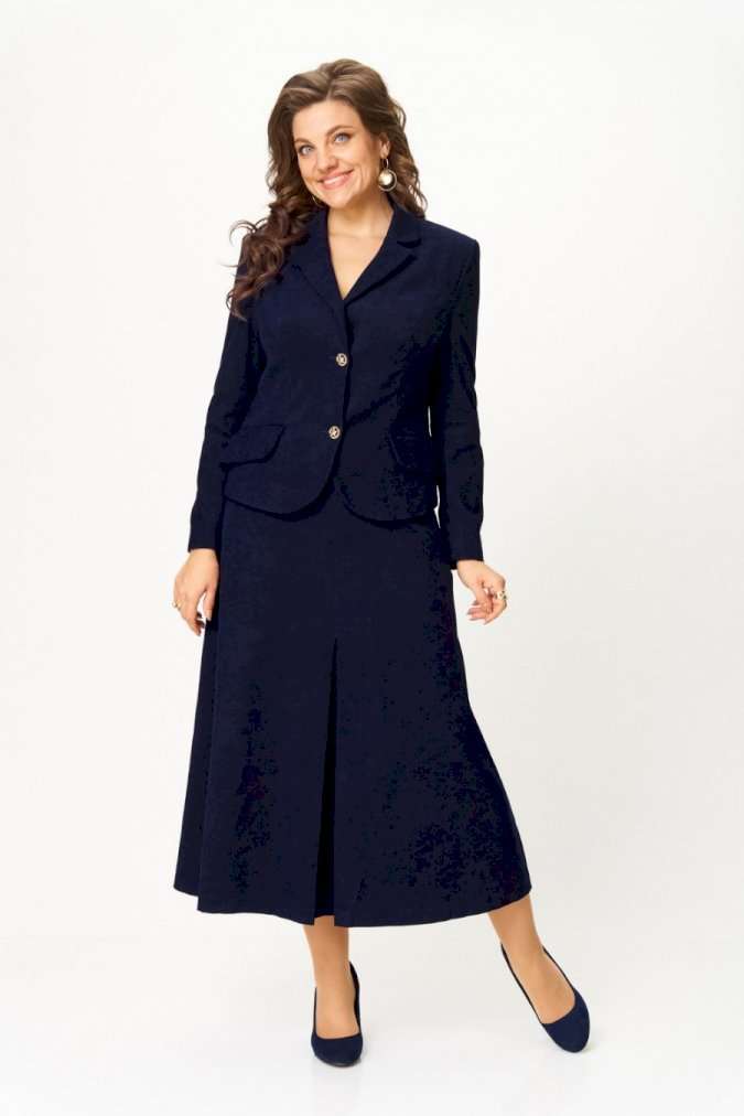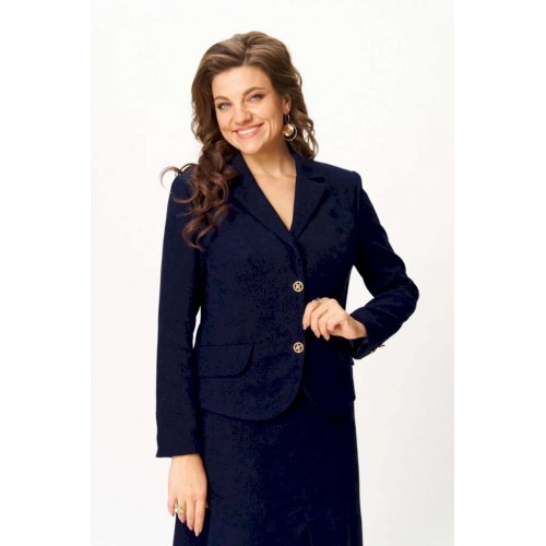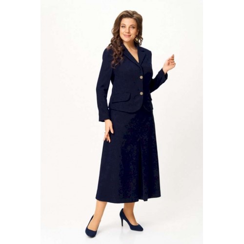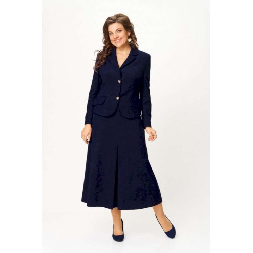 Костюм женский двухпредметный состоящий из жакета и юбки. Жакет полуприлегающего силуэта с втачным рукавом. Застежка центральная на петли и пуговицы. Воротник отложной с лацканами. По переду рельефы от проймы и прорезные карманы с клапаном. Спинка со средним швом и рельефами от проймы. Спинка со средним швом и рельефами от проймы. Рукав длинный двухшовный, по низу декоративная шлица с пуговицами. Юбка женская расширенная к низу, на притачном поясе. Застежка молния по спинке, на петлю и пуговицу на поясе. Переднее полотнище со средним швом посередине и встречной складкой по низу. Для удобства посадки резинка по бокам в поясе. Длина юбки ниже середины икры. Изделие на подкладке. Фурнитура может меняться от наличия. Длина по спинке: 56 см Длина рукава: 62 см Длина юбки: 87 см