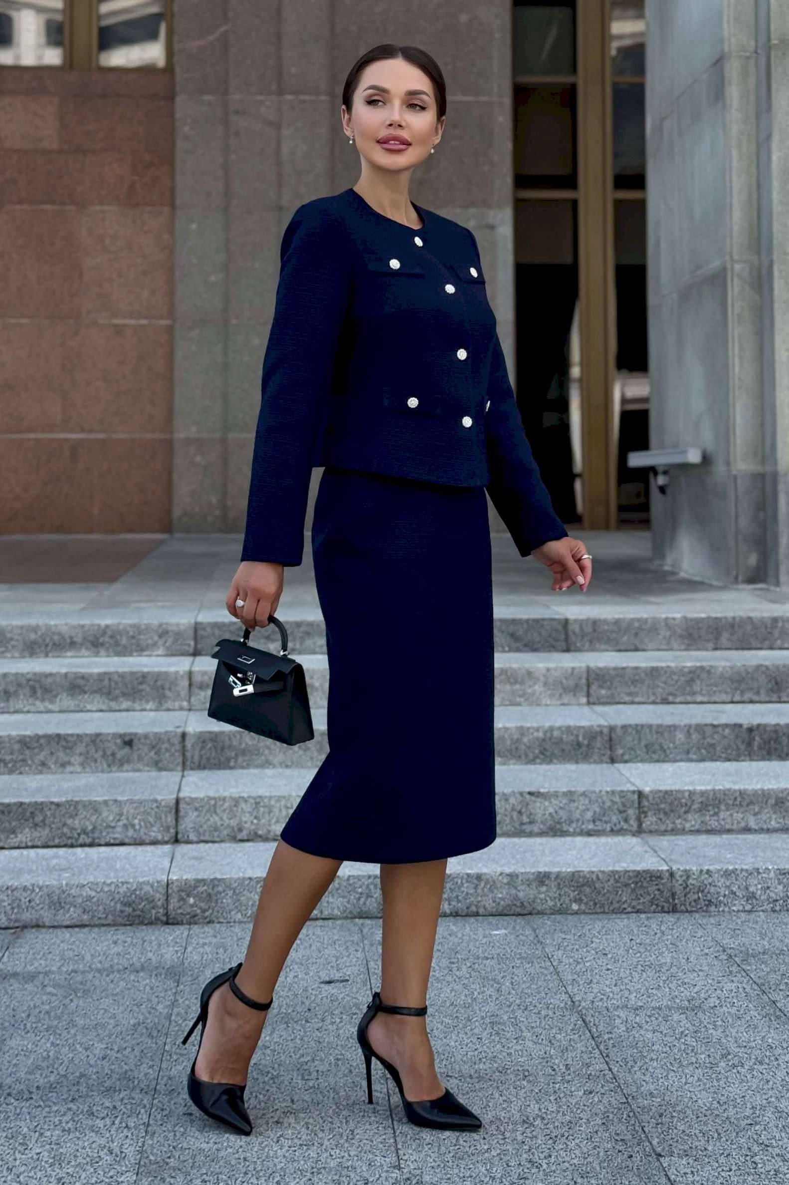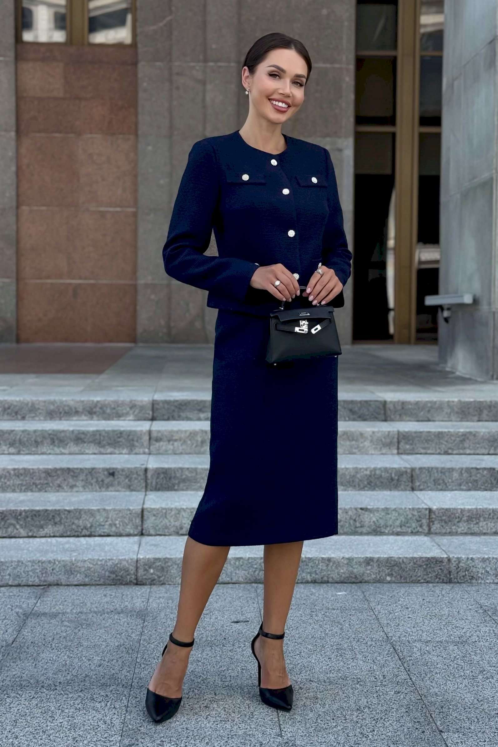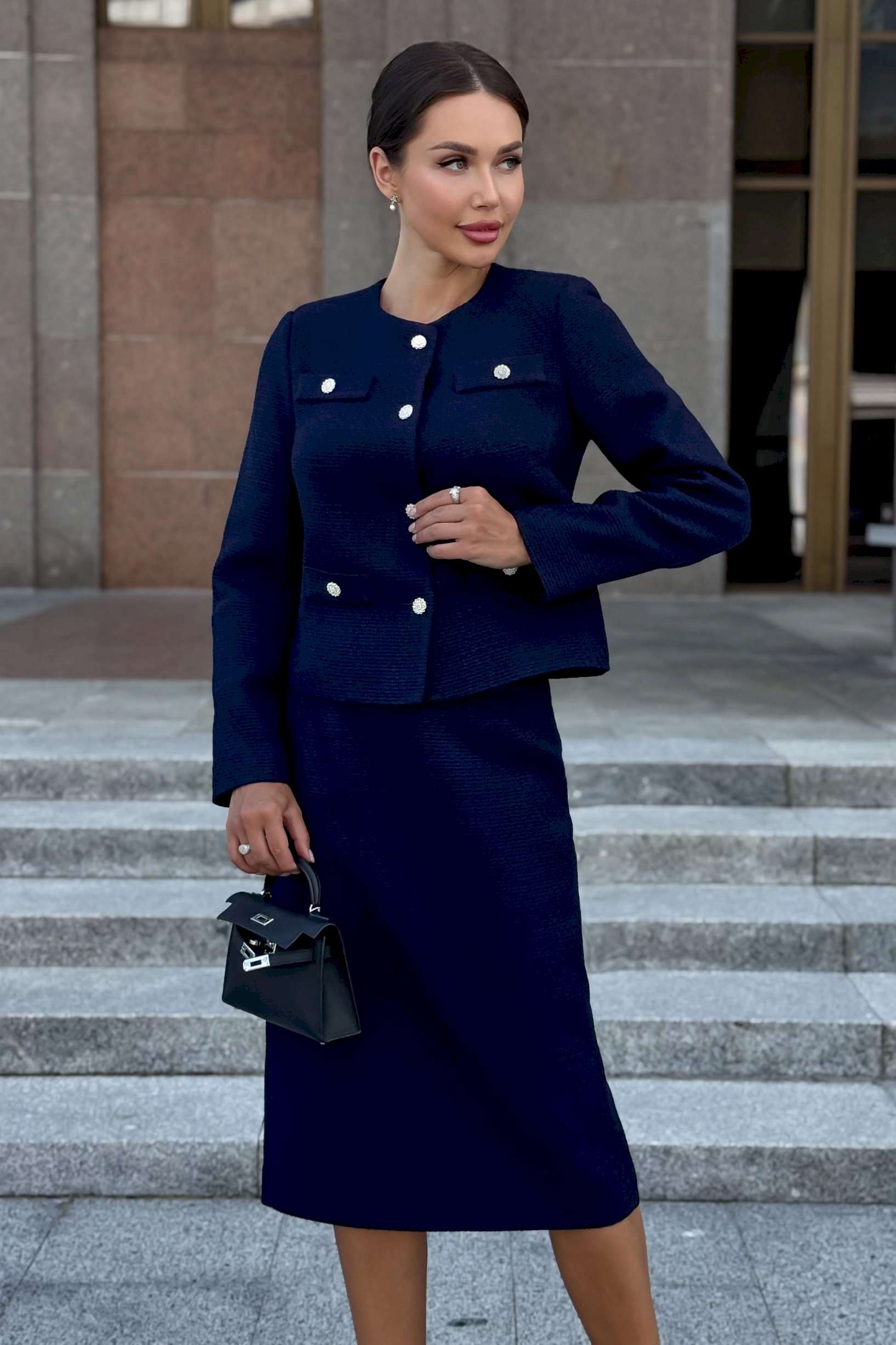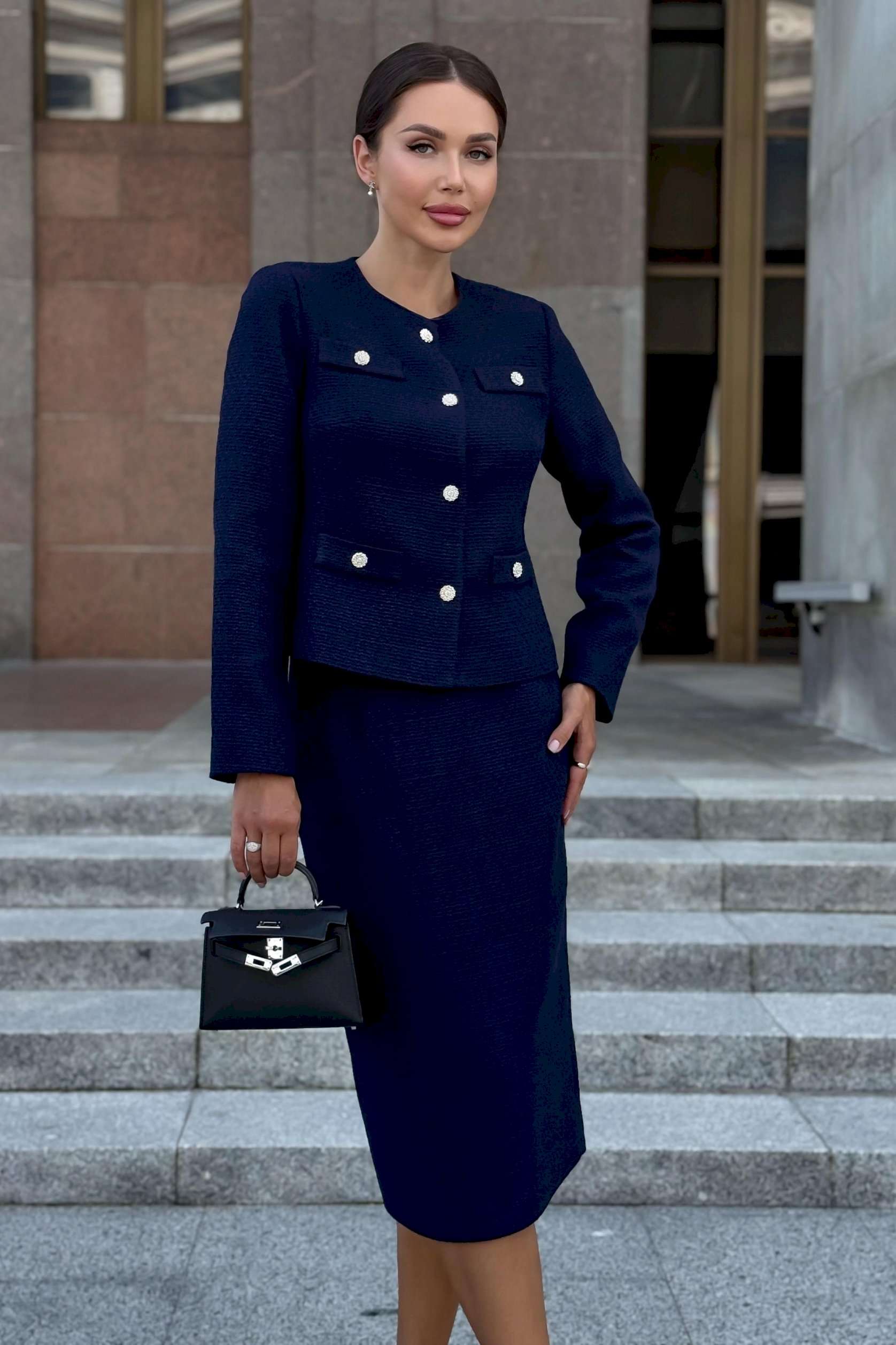 Элегантный твидовый костюм URS женский с юбкой миди — это гармоничное сочетание классики и современного стиля. Комплект состоит из жакета полуприлегающего силуэта и юбки-карандаш, выполненных в изысканном синем цвете. Такой ансамбль подчеркивает женственность и подходит для строгого дресс-кода, деловых встреч и торжественных событий. Костюм женский 2-х предметный, состоящий из жакета и юбки, выполненных из костюмной ткани \"\"рогожка\"\". Костюм может быть как нарядный, так и для повседневной носки. Жакет полуприлегающего силуэта, на подкладке, с центральной бортовой застежкой до верха на 4 петли и 4 пуговицы (размер и цвет фурнитуры может незначительно отличаться от фото). Перед с отрезными бочками, с нагрудными вытачками, идущими от бочков, в верхних и нижних частях с настрочными листочками, имитирующими прорезные карманы. На листочки пришиты декоративные пуговицы. Спинка со средним швом, с рельефными швами, идущими от пройм вниз. Рукава втачные, двухшовные, длинные. Горловина переда и спинки обтачная, округлой формы. Жакет с плечевыми накладками. В размерах 44,46,48,50 - юбка-карандаш с завышенной линией талии, зауженная к низу, на притачной по низу подкладке. Верхний край юбки обработан обтачкой. Переднее полотнище с талиевыми вытачками. Заднее полотнище с талиевыми вытачками, со средним швом, в верхней части которого обработана застежка на потайную тесьму-молнию, в нижней – шлица. В размерах 52,54 - юбка-карандаш на притачном поясе, застегивающемся на 1 петлю и 1 пуговицу, с резинками по боковым, зауженная к низу на притачной по низу подкладке. Переднее полотнище с рельефными швами, идущими от верха до низу. Заднее полотнище с талиевыми вытачками, со средним швом, в верхней части которого обработана застежка на потайную тесьму-молнию, в нижней – шлица.
