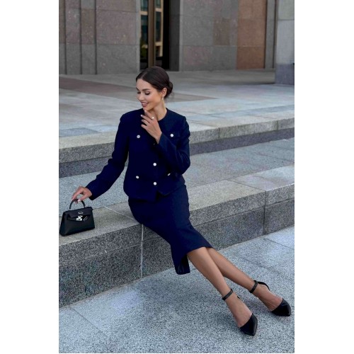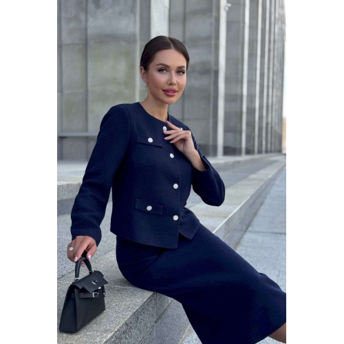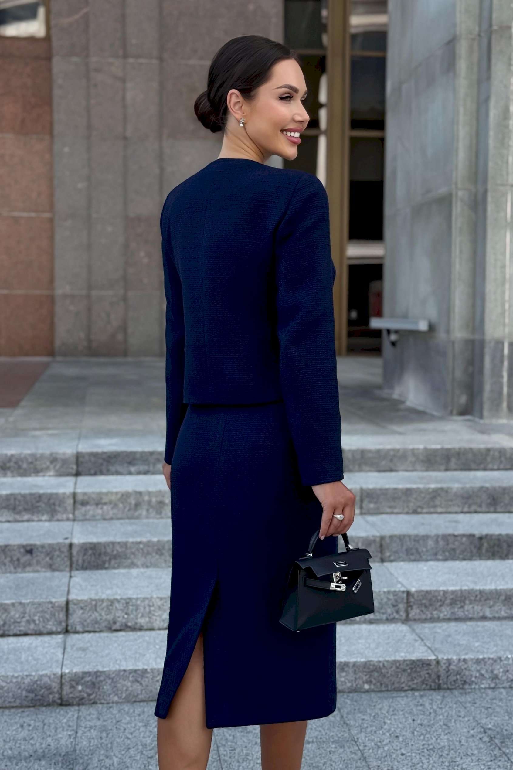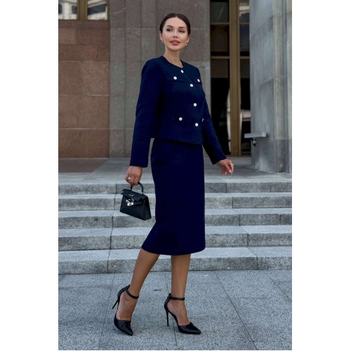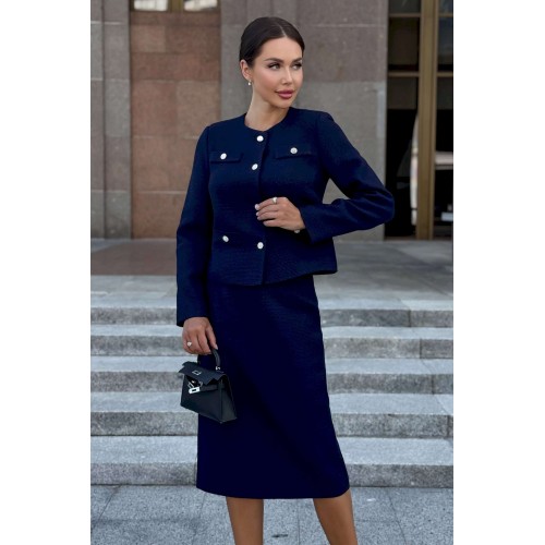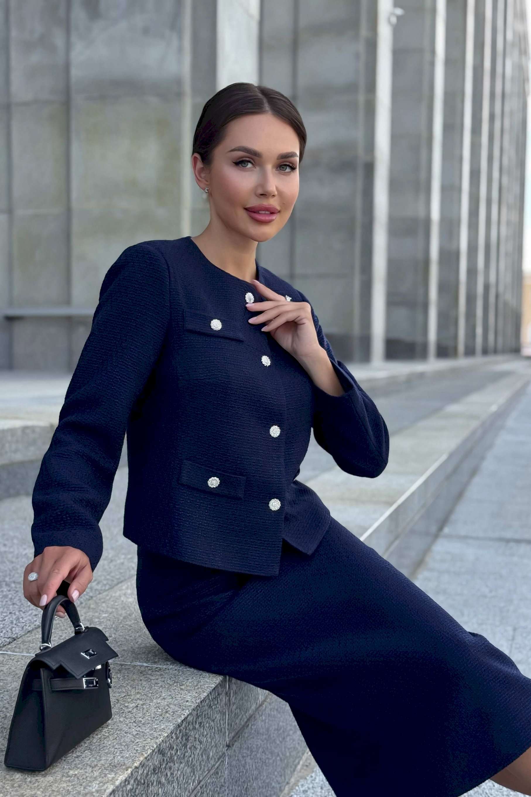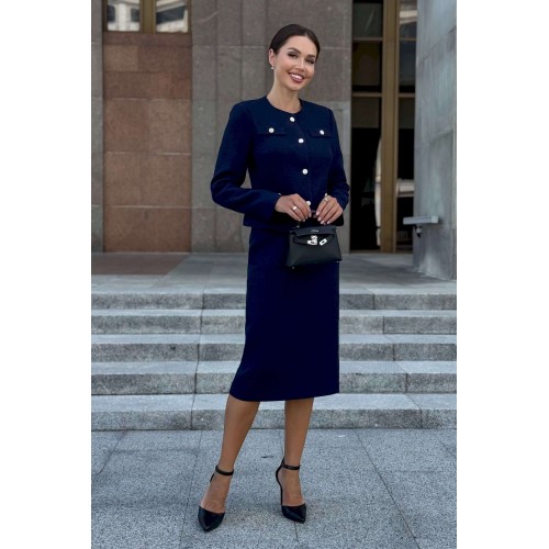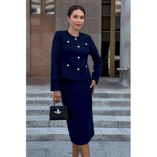 Элегантный твидовый костюм URS женский с юбкой миди — это гармоничное сочетание классики и современного стиля. Комплект состоит из жакета полуприлегающего силуэта и юбки-карандаш, выполненных в изысканном синем цвете. Такой ансамбль подчеркивает женственность и подходит для строгого дресс-кода, деловых встреч и торжественных событий. Костюм женский 2-х предметный, состоящий из жакета и юбки, выполненных из костюмной ткани \"\"рогожка\"\". Костюм может быть как нарядный, так и для повседневной носки. Жакет полуприлегающего силуэта, на подкладке, с центральной бортовой застежкой до верха на 4 петли и 4 пуговицы (размер и цвет фурнитуры может незначительно отличаться от фото). Перед с отрезными бочками, с нагрудными вытачками, идущими от бочков, в верхних и нижних частях с настрочными листочками, имитирующими прорезные карманы. На листочки пришиты декоративные пуговицы. Спинка со средним швом, с рельефными швами, идущими от пройм вниз. Рукава втачные, двухшовные, длинные. Горловина переда и спинки обтачная, округлой формы. Жакет с плечевыми накладками. В размерах 44,46,48,50 - юбка-карандаш с завышенной линией талии, зауженная к низу, на притачной по низу подкладке. Верхний край юбки обработан обтачкой. Переднее полотнище с талиевыми вытачками. Заднее полотнище с талиевыми вытачками, со средним швом, в верхней части которого обработана застежка на потайную тесьму-молнию, в нижней – шлица. В размерах 52,54 - юбка-карандаш на притачном поясе, застегивающемся на 1 петлю и 1 пуговицу, с резинками по боковым, зауженная к низу на притачной по низу подкладке. Переднее полотнище с рельефными швами, идущими от верха до низу. Заднее полотнище с талиевыми вытачками, со средним швом, в верхней части которого обработана застежка на потайную тесьму-молнию, в нижней – шлица.