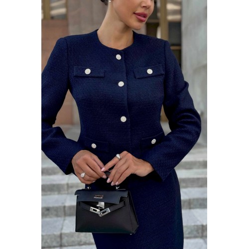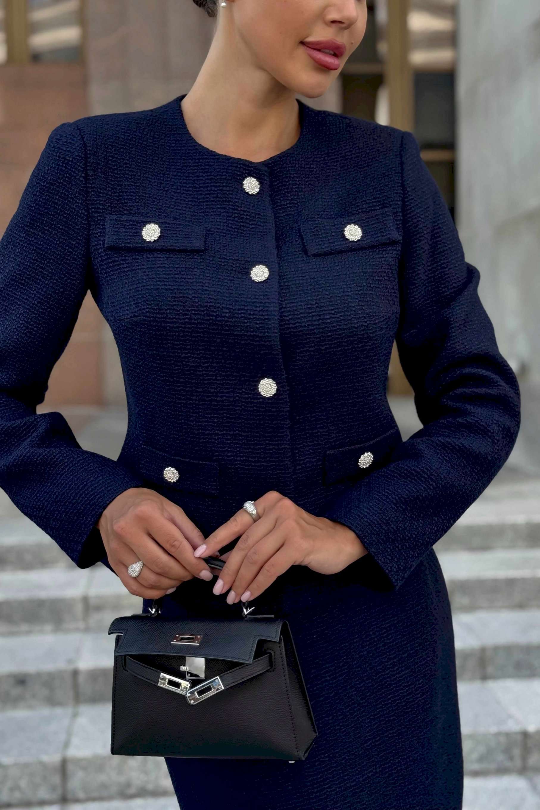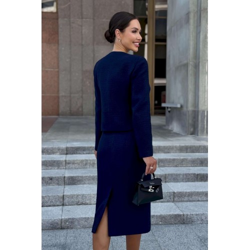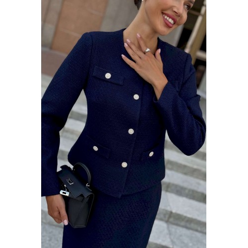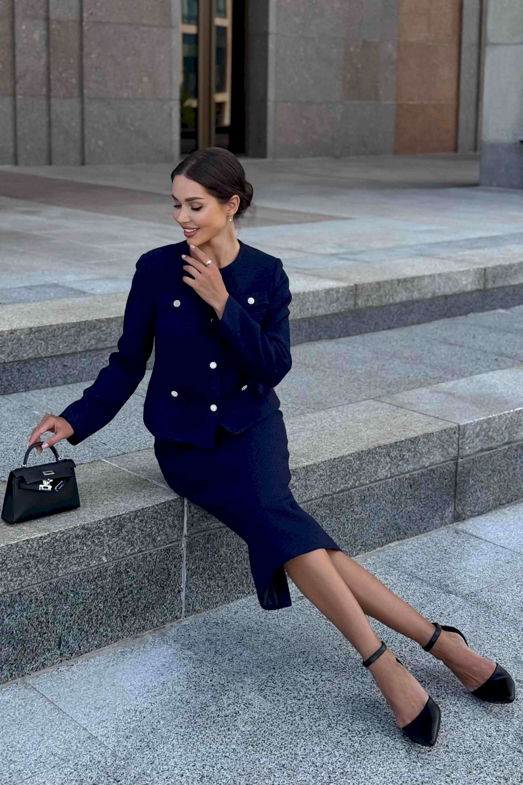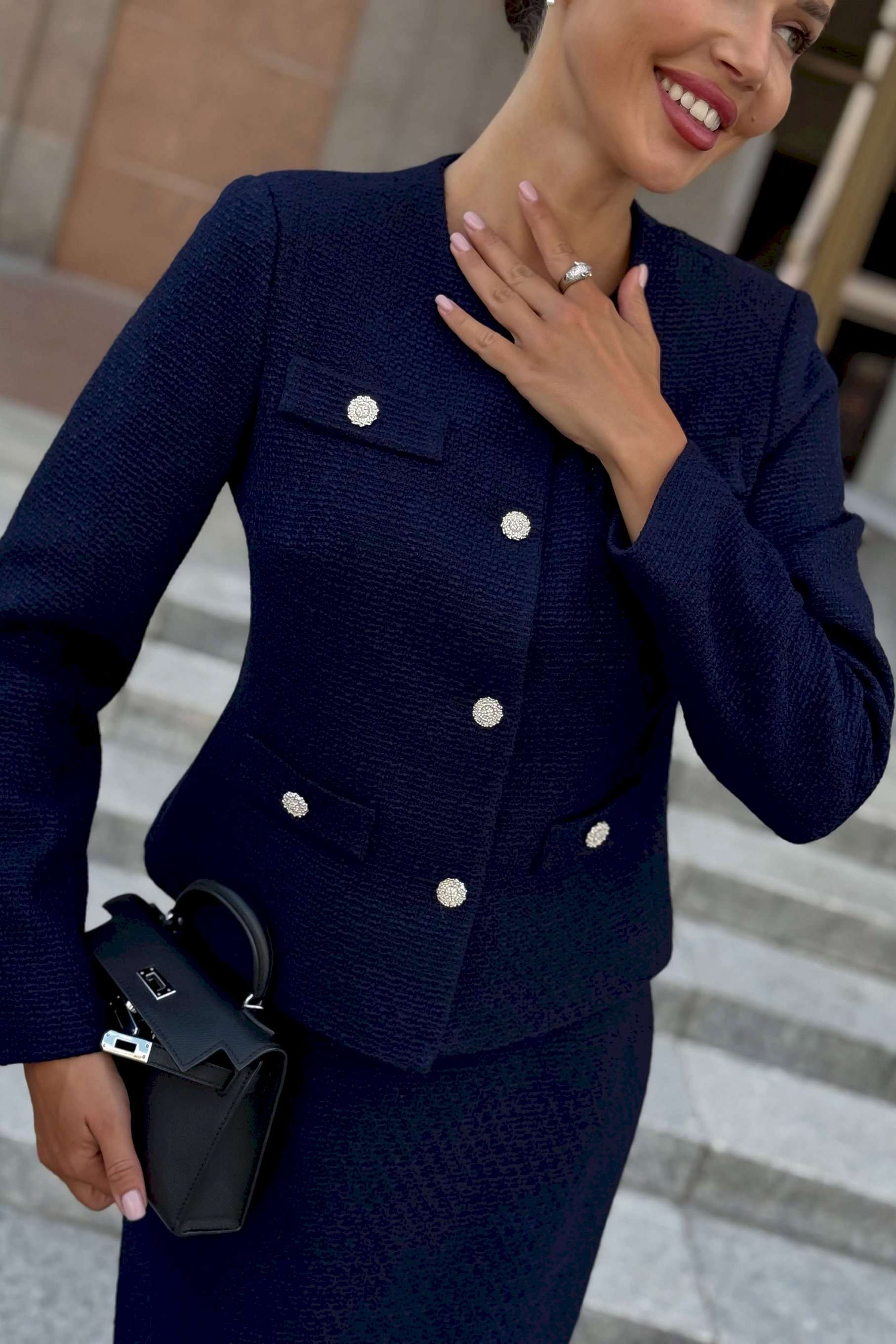 Элегантный твидовый костюм URS женский с юбкой миди — это гармоничное сочетание классики и современного стиля. Комплект состоит из жакета полуприлегающего силуэта и юбки-карандаш, выполненных в изысканном синем цвете. Такой ансамбль подчеркивает женственность и подходит для строгого дресс-кода, деловых встреч и торжественных событий. Костюм женский 2-х предметный, состоящий из жакета и юбки, выполненных из костюмной ткани \"\"рогожка\"\". Костюм может быть как нарядный, так и для повседневной носки. Жакет полуприлегающего силуэта, на подкладке, с центральной бортовой застежкой до верха на 4 петли и 4 пуговицы (размер и цвет фурнитуры может незначительно отличаться от фото). Перед с отрезными бочками, с нагрудными вытачками, идущими от бочков, в верхних и нижних частях с настрочными листочками, имитирующими прорезные карманы. На листочки пришиты декоративные пуговицы. Спинка со средним швом, с рельефными швами, идущими от пройм вниз. Рукава втачные, двухшовные, длинные. Горловина переда и спинки обтачная, округлой формы. Жакет с плечевыми накладками. В размерах 44,46,48,50 - юбка-карандаш с завышенной линией талии, зауженная к низу, на притачной по низу подкладке. Верхний край юбки обработан обтачкой. Переднее полотнище с талиевыми вытачками. Заднее полотнище с талиевыми вытачками, со средним швом, в верхней части которого обработана застежка на потайную тесьму-молнию, в нижней – шлица. В размерах 52,54 - юбка-карандаш на притачном поясе, застегивающемся на 1 петлю и 1 пуговицу, с резинками по боковым, зауженная к низу на притачной по низу подкладке. Переднее полотнище с рельефными швами, идущими от верха до низу. Заднее полотнище с талиевыми вытачками, со средним швом, в верхней части которого обработана застежка на потайную тесьму-молнию, в нижней – шлица.