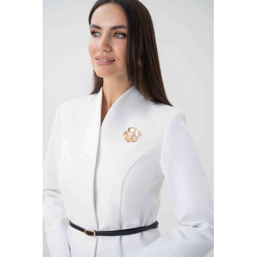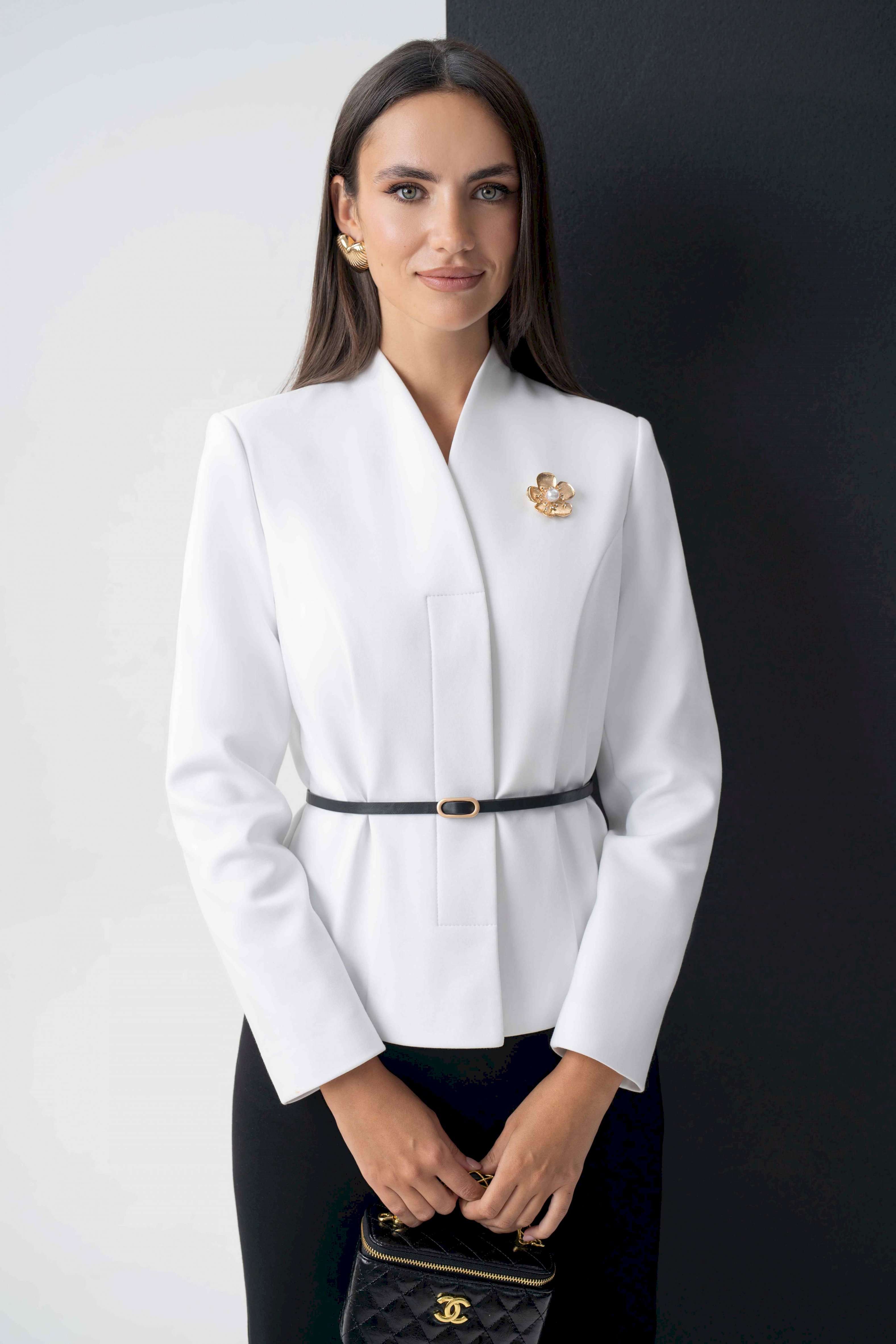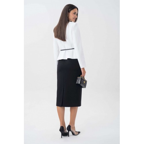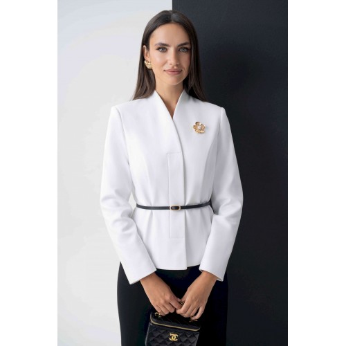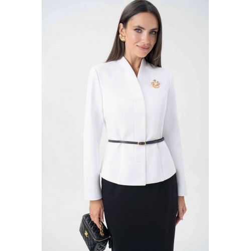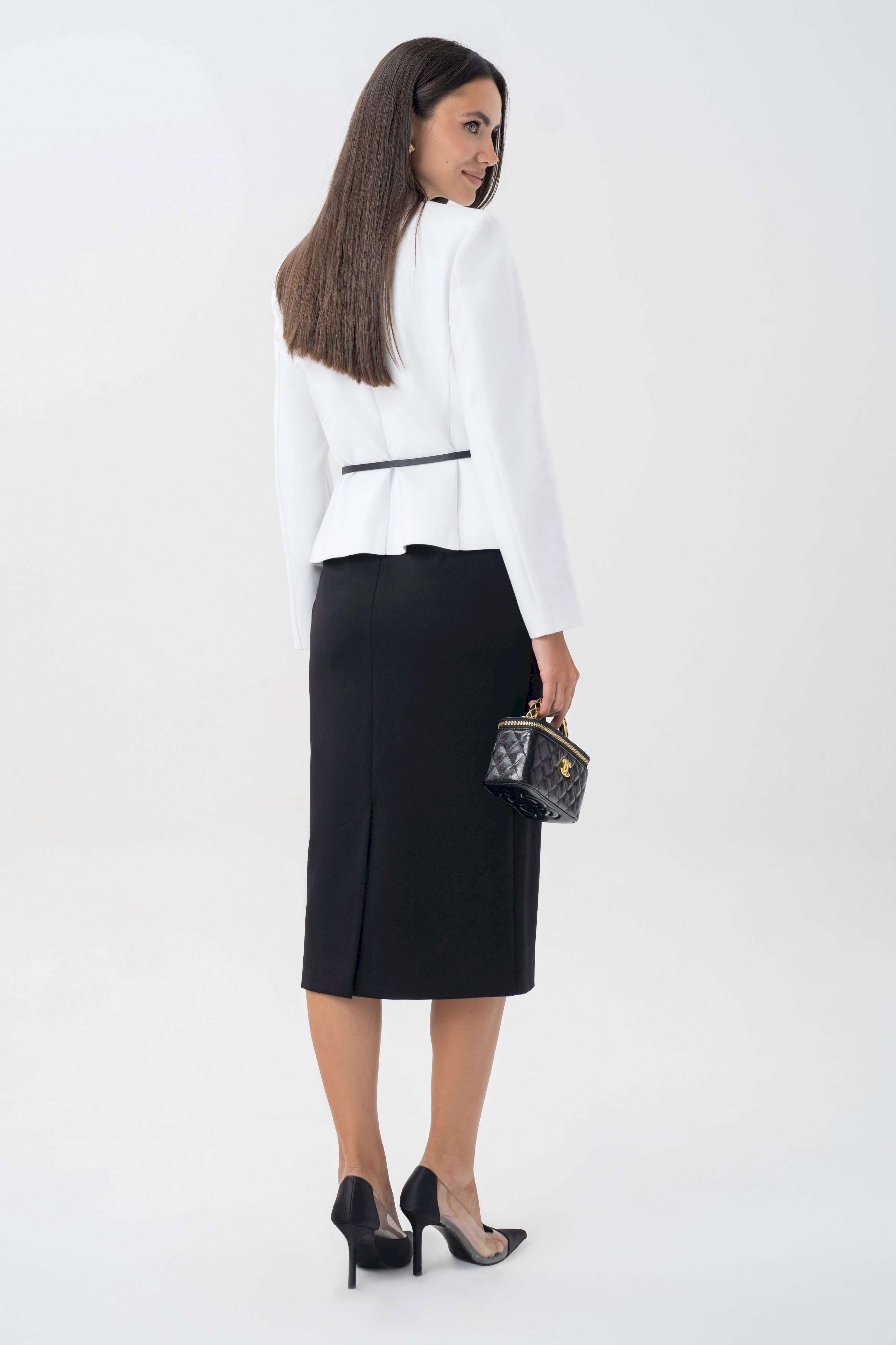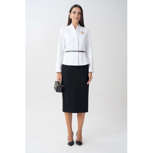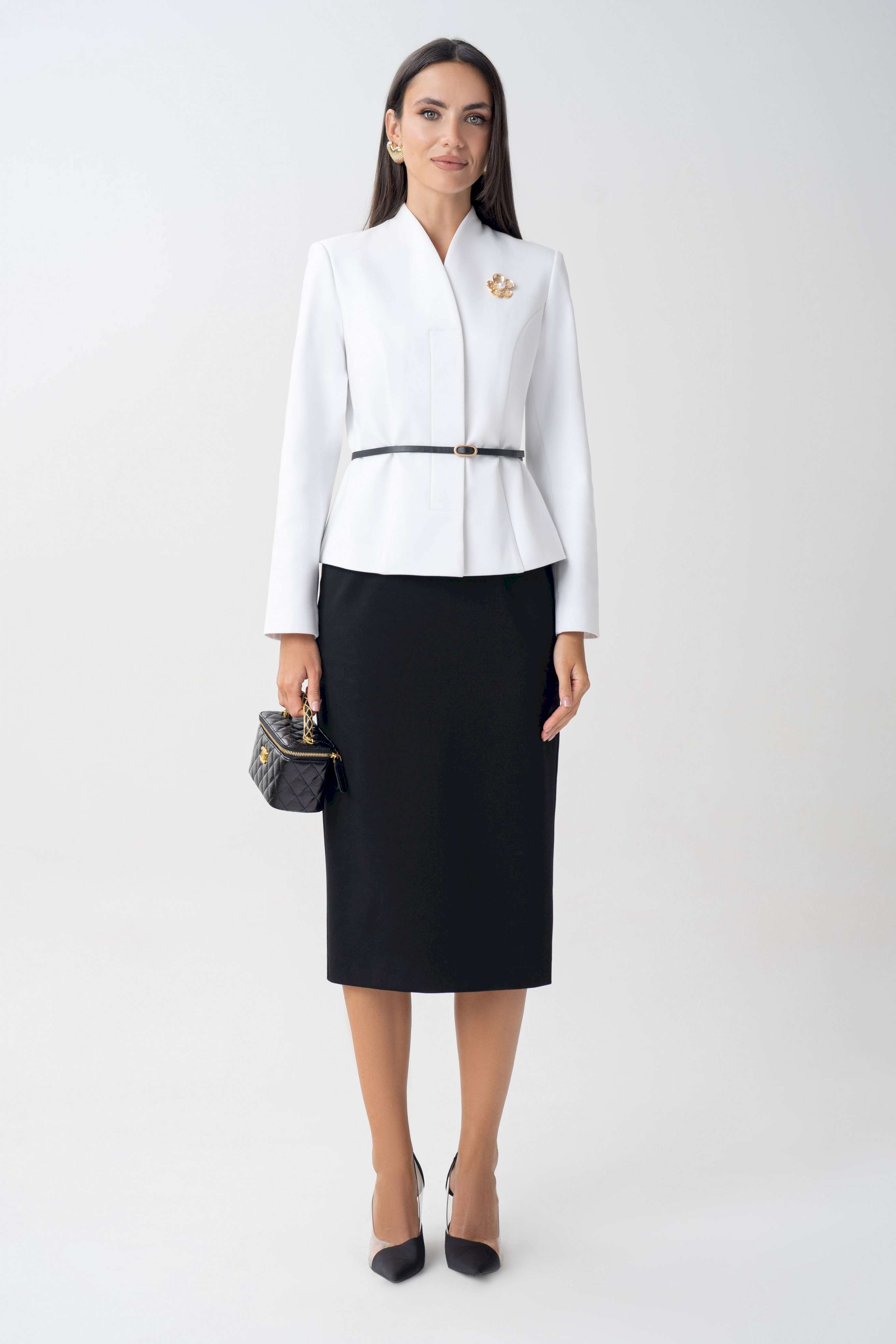 Женский костюм с юбкой URS — это воплощение элегантности, утончённого вкуса и уверенности в себе. Такой деловой костюм с юбкой подойдёт для офиса, переговоров, деловых встреч, конференций, официальных мероприятий. Он сочетает в себе строгость классического силуэта и женственность мягких линий. Костюм женский ЮРС, 2-х предметный, состоящий из жакета и юбки, выполнен из трикотажного полотна, со съемным декоративным поясом, нарядный. Жакет женский полуприлегающего силуэта, на подкладке, с центральной бортовой потайной застежкой на 2 петли и пуговицы (размер и цвет фурнитуры может незначительно отличаться от фото). Перед с рельефными швами. Спинка со средним и рельефными швами. Рукава втачные, двухшовные, длинные. Горловина ˅- образная, переходящая в воротник - стойку по спинке. Жакет с плечевыми накладками. Юбка прямого силуэта, зауженная к низу, на притачном поясе, застегивающимся на 1 петлю и пуговицу. Переднее и заднееполотнища с талиевыми вытачками. Заднее полотнище со средним швом, в верхней части которого обработана застежка на потайную тесьму - молнию, в нижней – шлица. Юбка на отлетной по низу подкладке. С 50 размера в поясе, на уровне боковых швов предусмотрены резинки для лучшего прилегания по талии. Состав ткани Тип ткани трикотажное полотно.