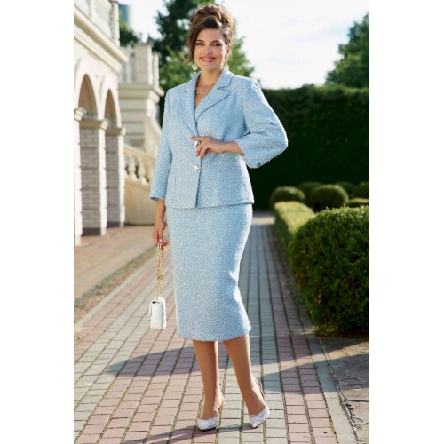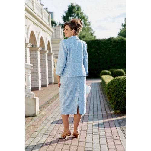 Костюм женский, состоящий из жакета и юбки. Жакет полуприлегающий, однобортный с акцентом на ровную линию плеч, с цельнокроеными лацканами и застёжкой на декоративные пуговицы по краю борта. По переду жакета талиевые вытачки и накладные карманы фигурной формы. Рукав втачной, двухшовный, длиной 3/4 с отлетной шлицей в шве и отделкой в виде декоративных пуговиц. Спинка со средним швом и талиевыми вытачками. Жакет на подкладке.Юбка-карандаш идеально дополняет жакет, обрисовывая стройные линии. Юбка прямого силуэта, заужена к низу, с притачным поясом со вставкой эластичной тесьмы в боках пояса, что обеспечивает удобную посадку на фигуру. В среднем шве юбки застёжка на тесьму молнию, от низа отлетная шлица. Юбка на подкладке. Обращаем Ваше внимание, что фурнитура может незначительно отличаться от фото. Длина жакета по спинке 60 см (р 52-56), 60,5 см (р 58-62), длина рукава 51 см. Длина юбки 76 см.