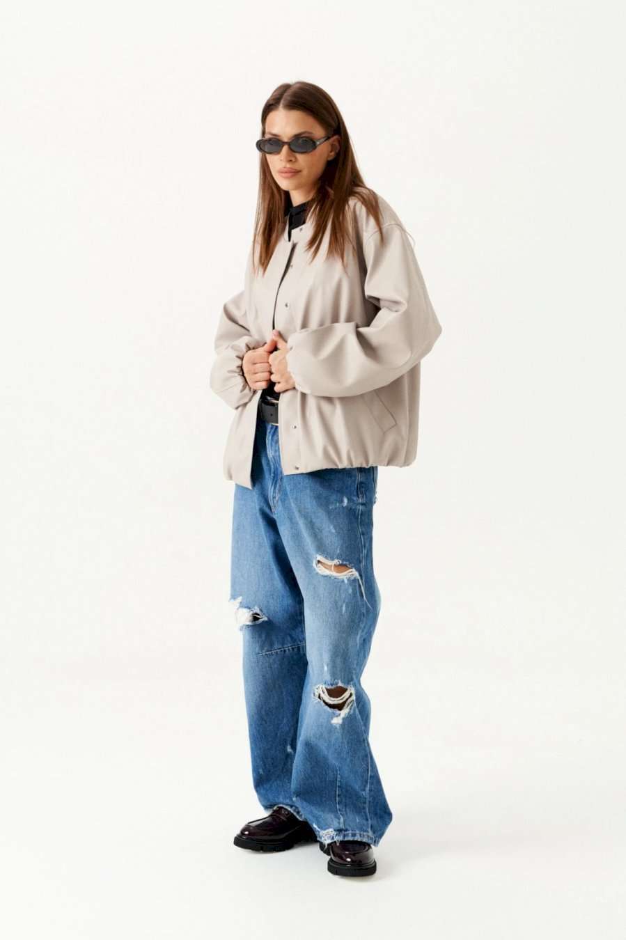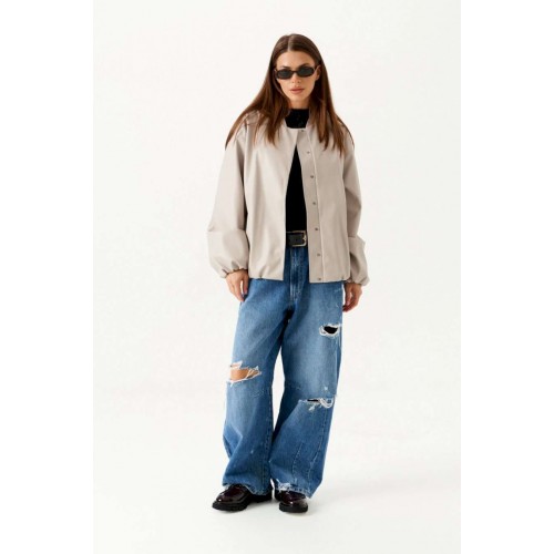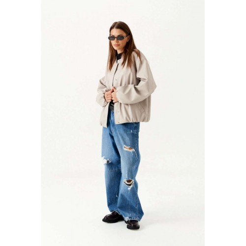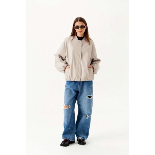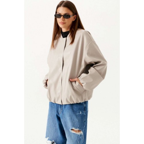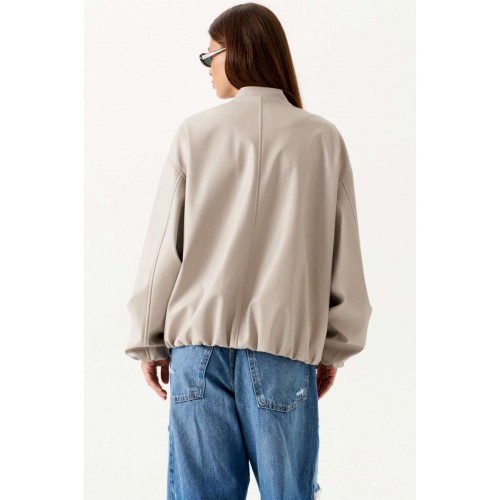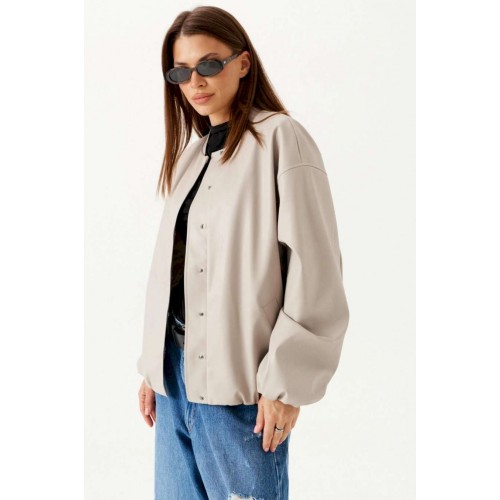 Бомбер из искусственной кожи, свободный, со спущенной линией плеча, с центральной застежкой на потайные кнопки, на подкладке. Горловина округлой формы с воротником-стойкой. Детали переда с прорезными карманами с листочкой. Спинка со средним швом. Рукав втачной, двухшовный.