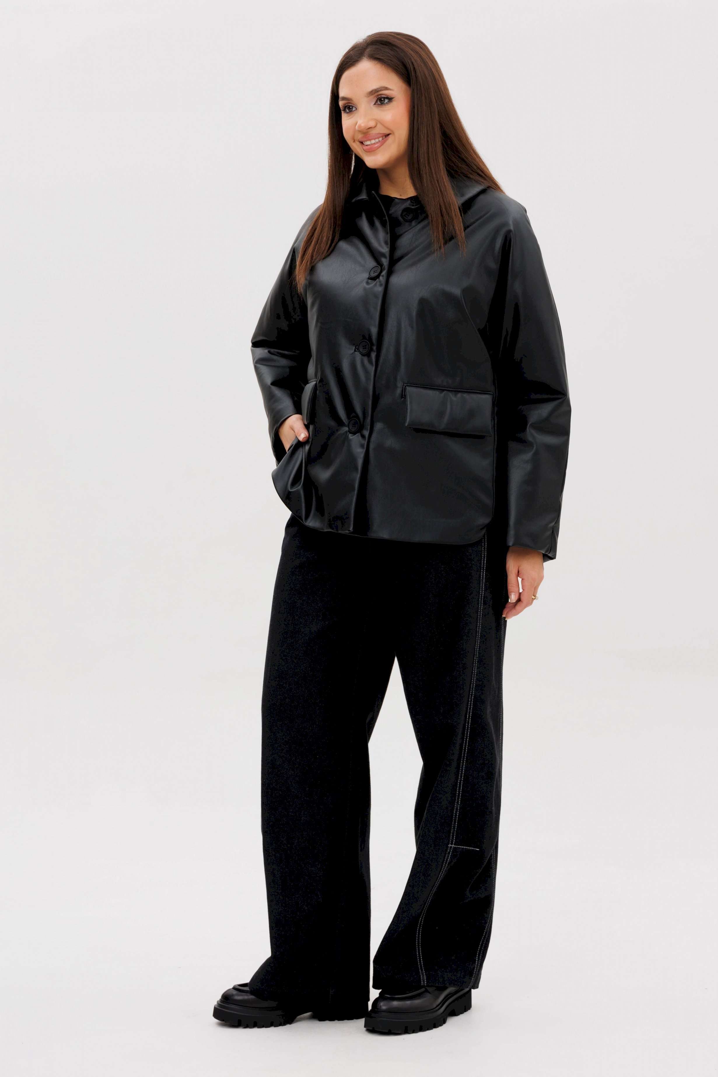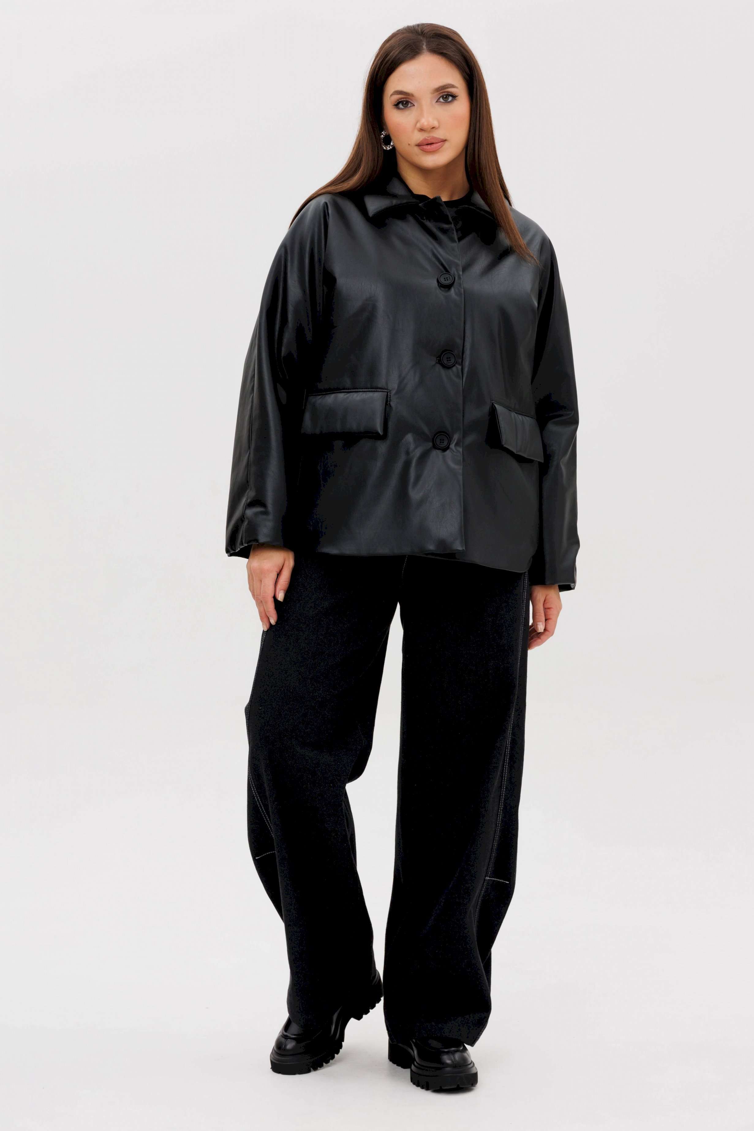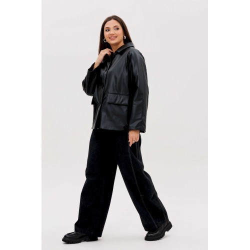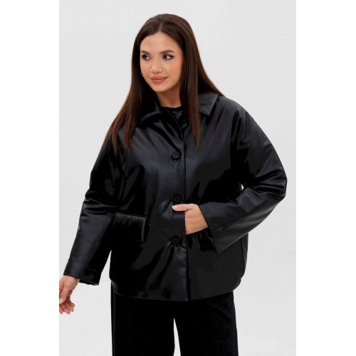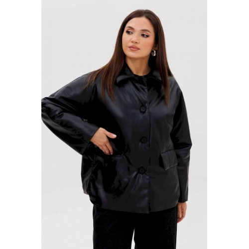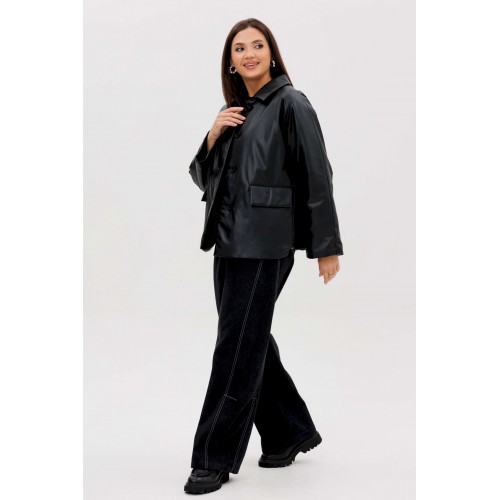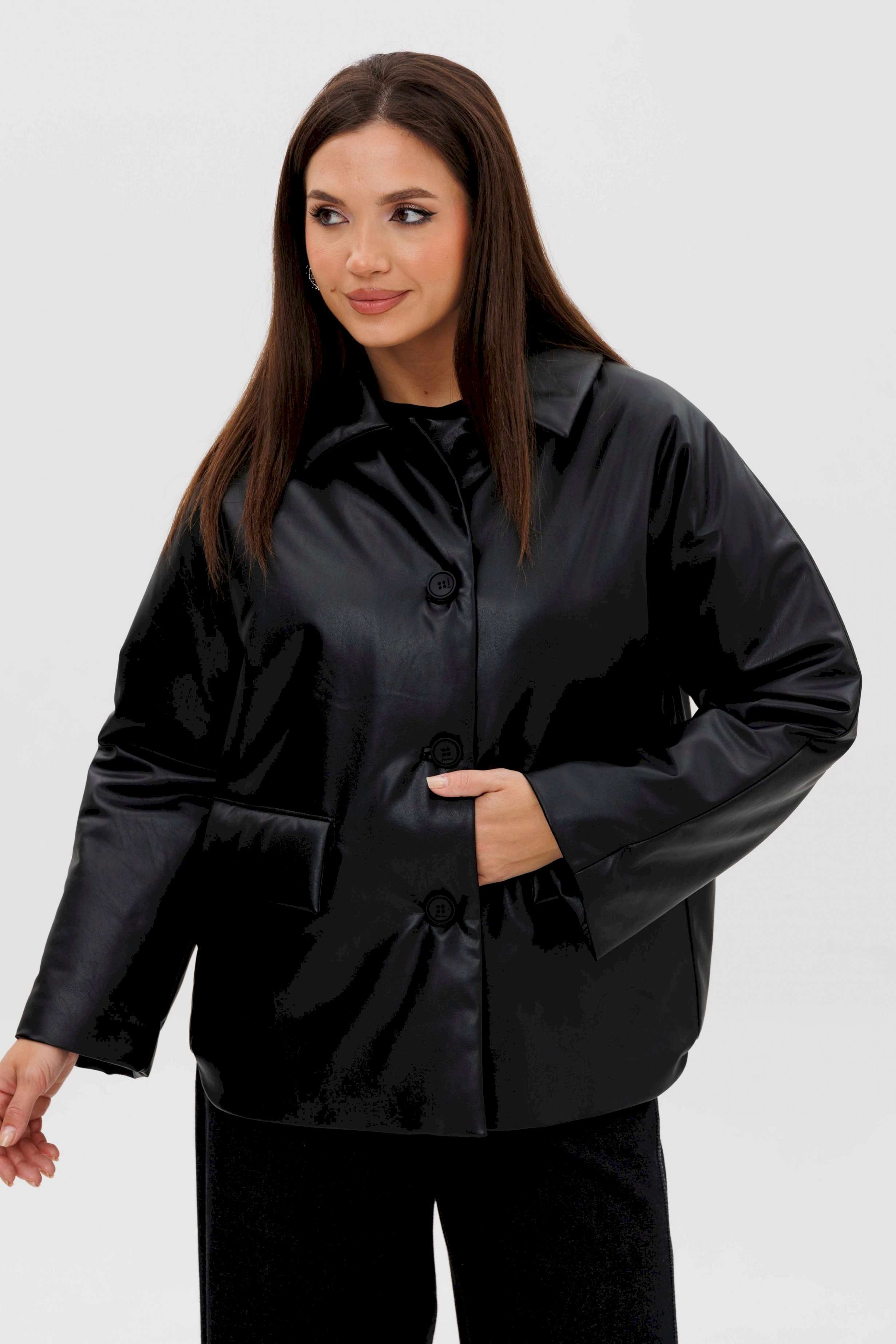 Стильная женская куртка из мягкой экокожи — это современное решение для прохладного сезона. Комбинированный покрой и лаконичный дизайн делают модель универсальной: она легко сочетается как с повседневными, так и с более строгими образами. Утеплённая подкладка на синтепоне дарит комфорт и тепло в межсезонье. Конструктивные особенности: Прямой силуэт, удобный для повседневной носки. Изготовлена из высококачественной экокожи с матовым блеском. Комбинированный крой: чёткие линии и аккуратные детали. Застёжка на крупные пуговицы спереди. Отложной воротник классической формы. Длинные рукава прямого кроя. Утеплённая подкладка на синтепоне, сохраняющая тепло. Боковые карманы с клапанами для удобства. Длина — до линии бёдер, универсальная для любого типа фигуры. Преимущества: Практичный чёрный цвет — легко сочетается с базовыми элементами гардероба. Стильный дизайн для города и активного дня. Тёплая, но лёгкая — отличный вариант для осени и ранней зимы. Утеплитель: синтепон 120 г/м2 Длина куртки около 70 см. Длина рукава с плечом около 75 см.