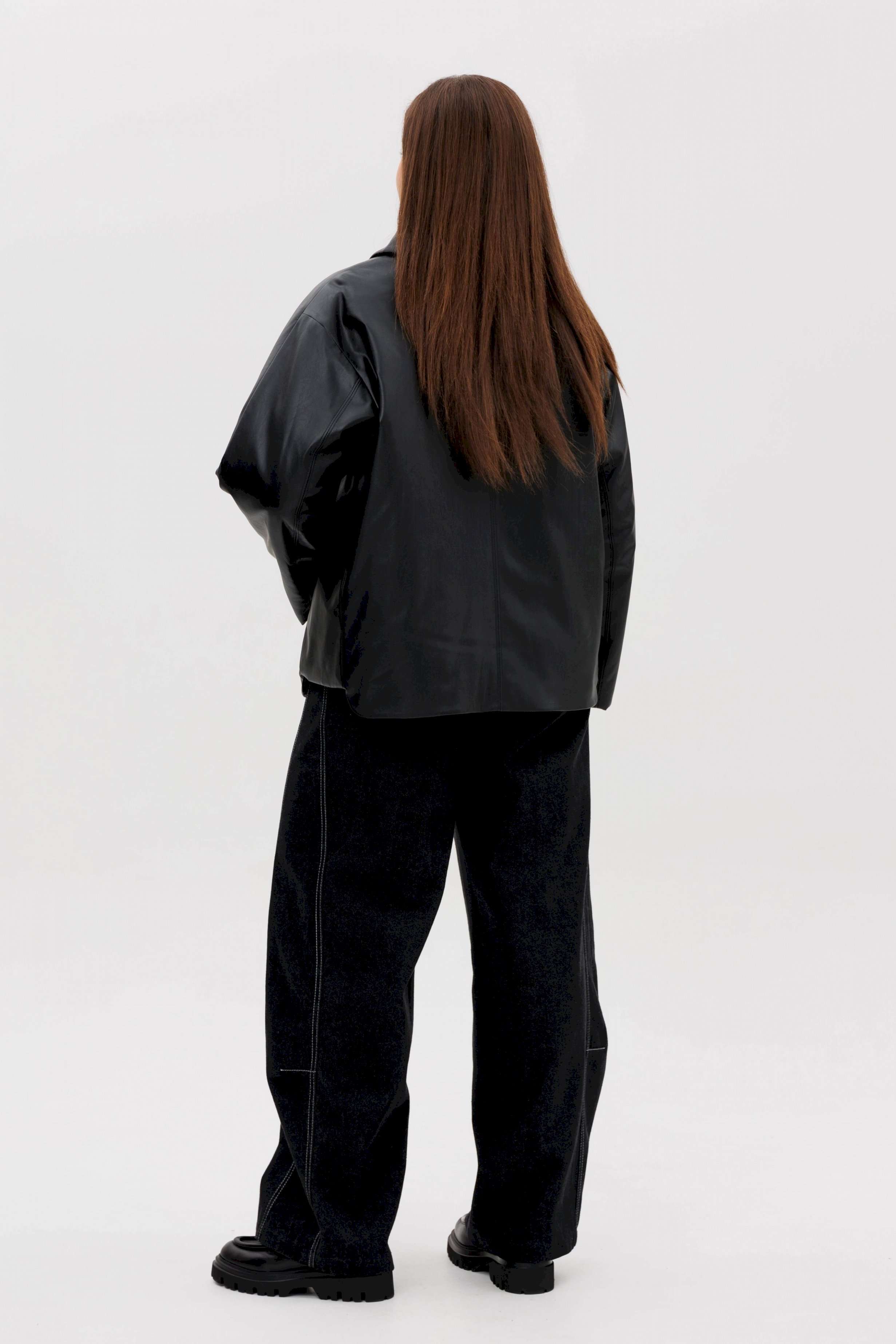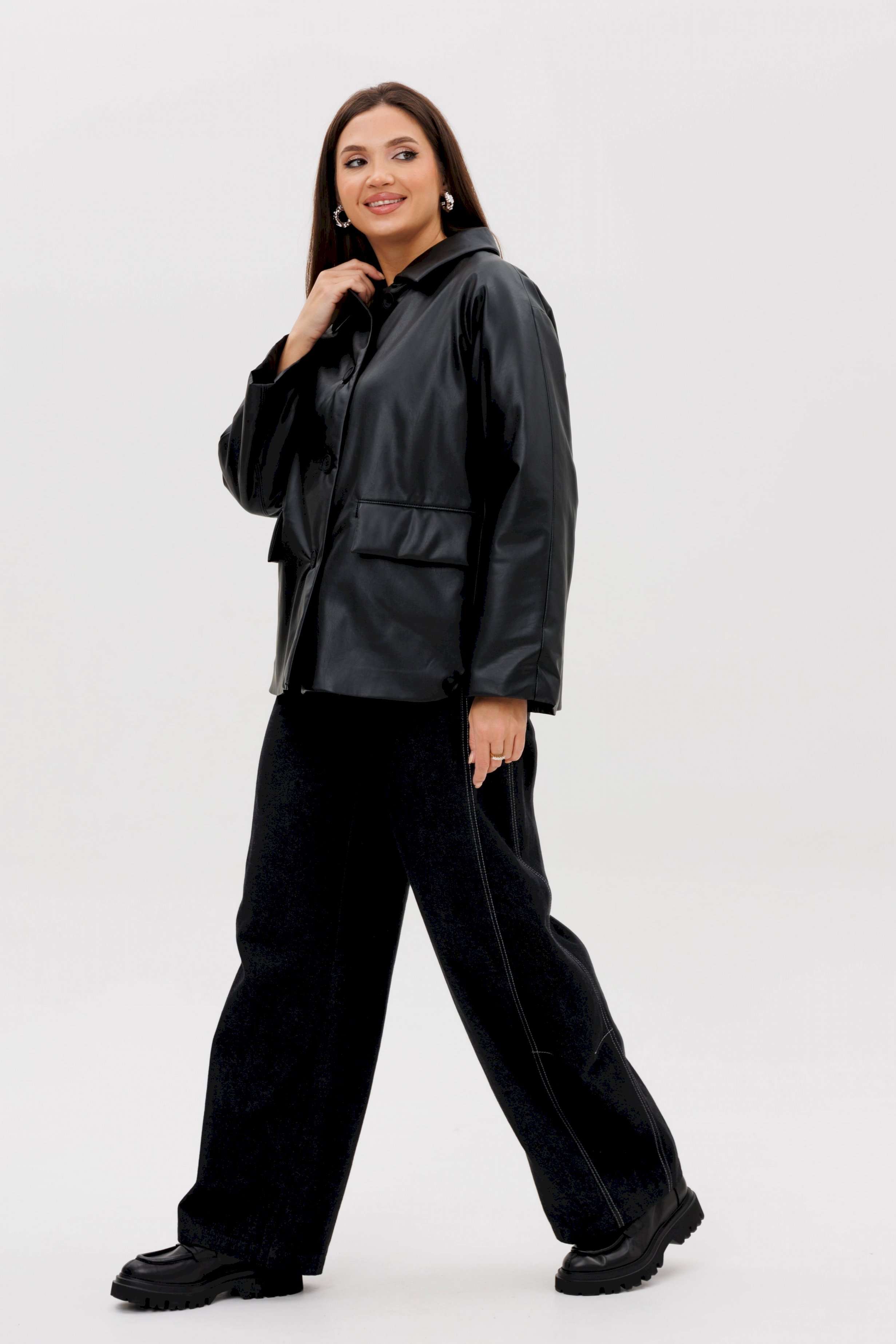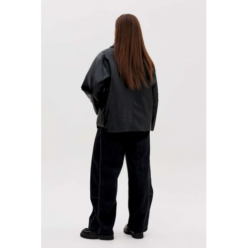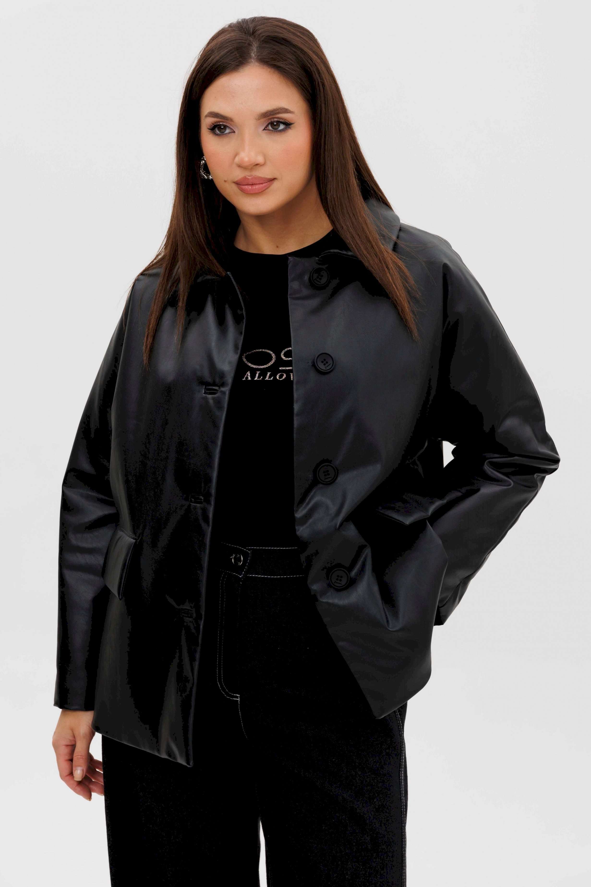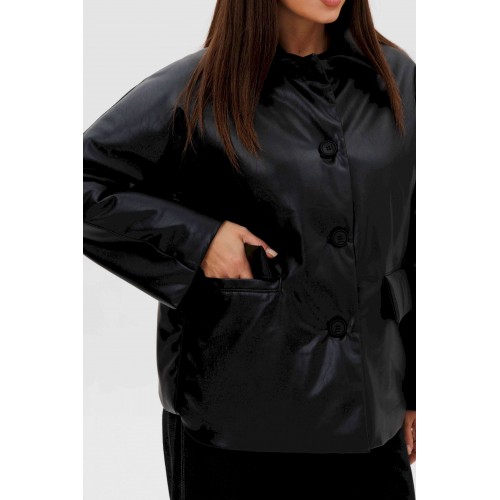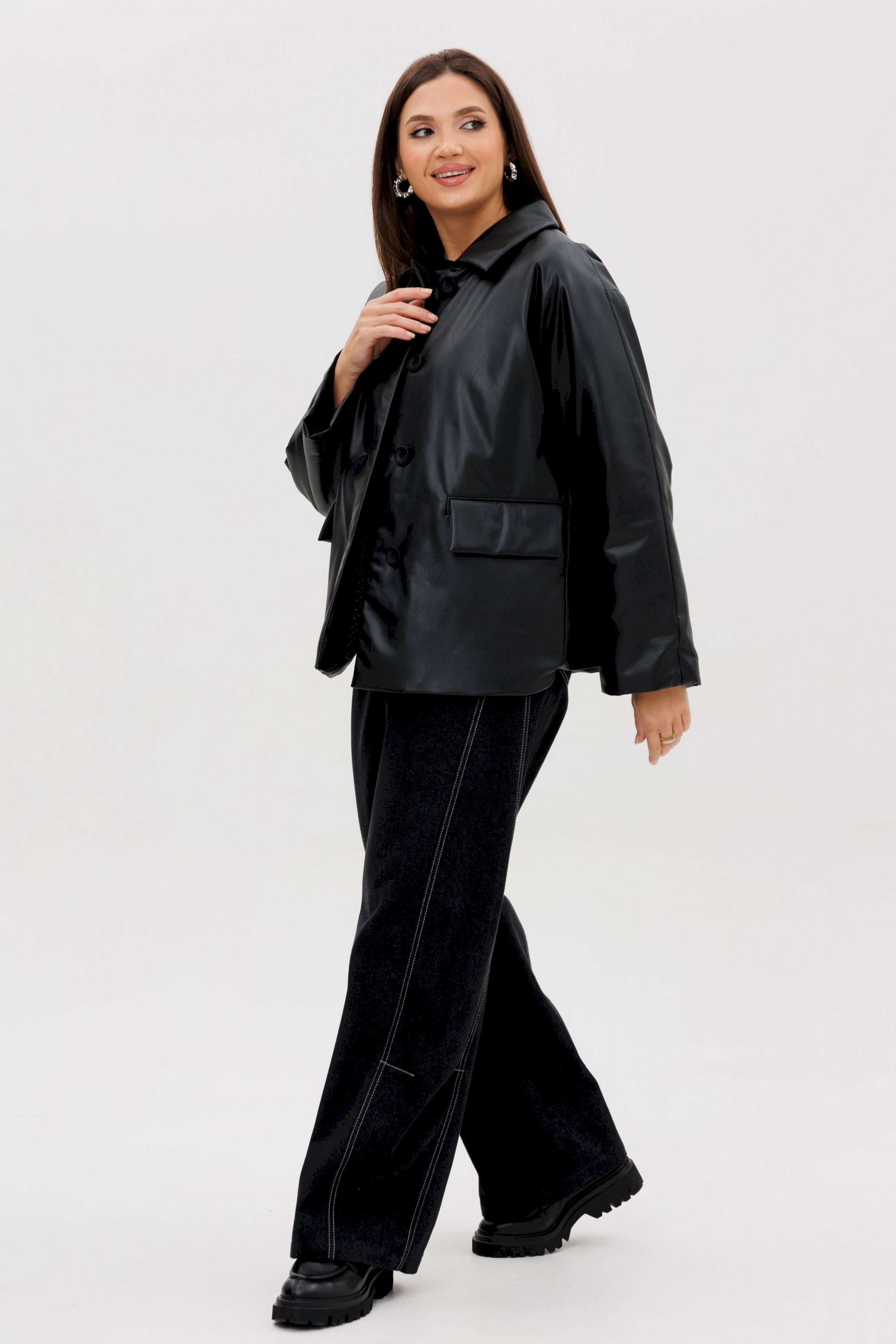 Стильная женская куртка из мягкой экокожи — это современное решение для прохладного сезона. Комбинированный покрой и лаконичный дизайн делают модель универсальной: она легко сочетается как с повседневными, так и с более строгими образами. Утеплённая подкладка на синтепоне дарит комфорт и тепло в межсезонье. Конструктивные особенности: Прямой силуэт, удобный для повседневной носки. Изготовлена из высококачественной экокожи с матовым блеском. Комбинированный крой: чёткие линии и аккуратные детали. Застёжка на крупные пуговицы спереди. Отложной воротник классической формы. Длинные рукава прямого кроя. Утеплённая подкладка на синтепоне, сохраняющая тепло. Боковые карманы с клапанами для удобства. Длина — до линии бёдер, универсальная для любого типа фигуры. Преимущества: Практичный чёрный цвет — легко сочетается с базовыми элементами гардероба. Стильный дизайн для города и активного дня. Тёплая, но лёгкая — отличный вариант для осени и ранней зимы. Утеплитель: синтепон 120 г/м2 Длина куртки около 70 см. Длина рукава с плечом около 75 см.