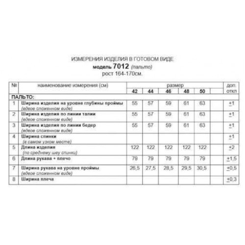 Демисезонное пальто прямого силуэта для тех, кто любит комфорт и лаконичность. Это сочетание стиля, современных материалов и безупречного кроя. Лёгкое, удобное и уютное пальто подходит для любого случая выхода. Пальто выполнено из шерстяной ткани, которая обеспечивает теплоизоляцию и защиту от ветра и влаги, подходит для межсезонья и теплой зимы. Двубортное, на подкладке. Изделие рассчитано на температурный режим от +10 до -5 градусов. Модель прямого силуэта актуального покроя «летучая мышь»; предназначена для повседневного использования. Передняя часть цельнокроеная с двумя функциональными прорезными карманами с листочкой. Спинка с центральным швом. Для удобства динамики внизу изделия расположена высокая шлица. Рукав длинный двухшовный тип «летучая мышь». Внизу рукава расположена пата, фиксируемая кнопкой. Воротник – стойка. Застёжка до верха, смещенная, на три видимые петли с декоративными пуговицами и на одну потайную петлю с пуговицей, а также на дополнительную петлю с пуговицей на воротнике, Низ изделия ровный. Подкладка гладкая. К изделию прилагается пояс-завязка. Длина (по среднему шву спинки) = 122 см. (+1см.) Длина рукава (+плечо) = 79 см. (+1см.)