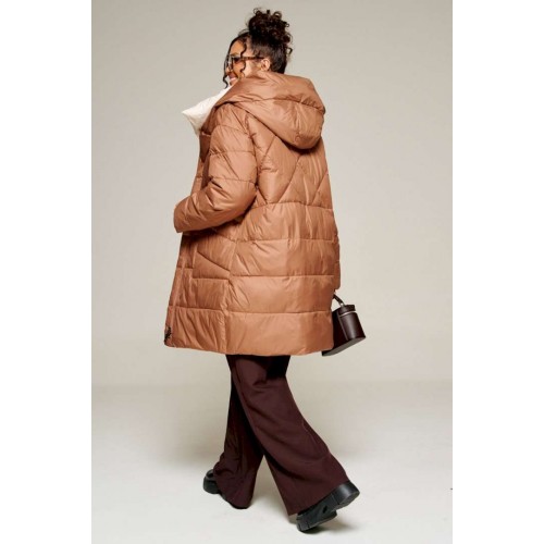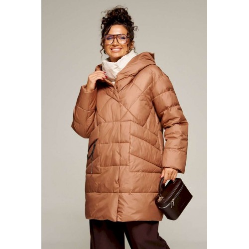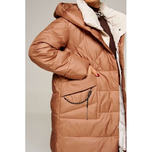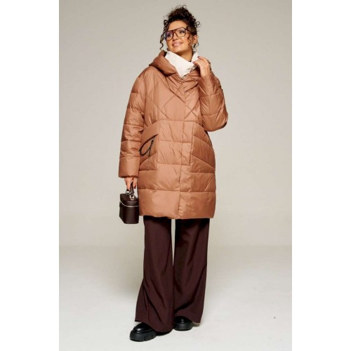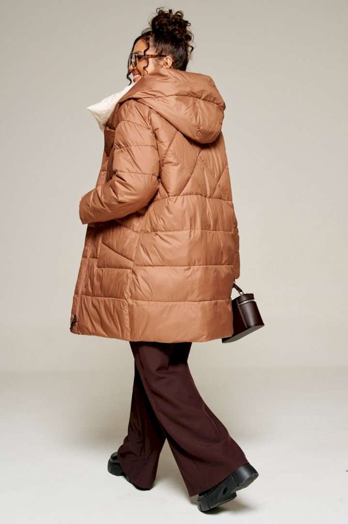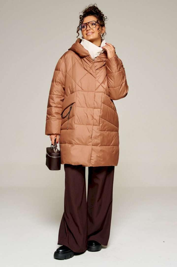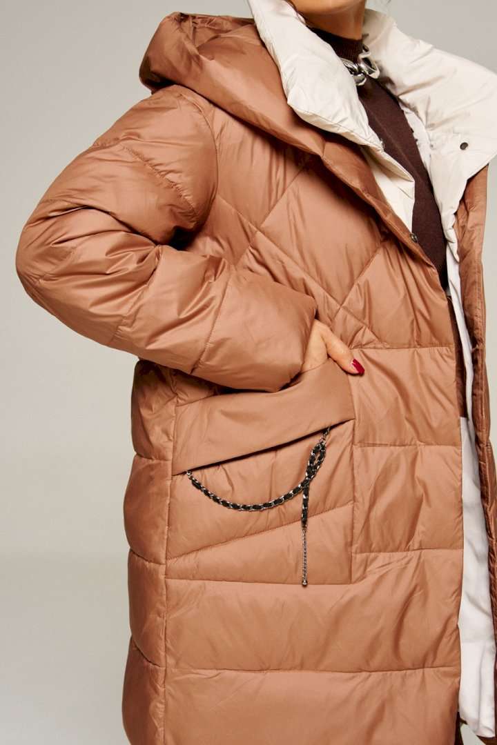 Это пальто станет акцентным элементом вашего гардероба. Современный объёмный крой и спущенная линия плеч создают расслабленный актуальный силуэт. А широкий воротник играет роль дизайнерского акцента. Пальто выполнено из прочной, влагостойкой и приятной на ощупь полиэстерной ткани; на синтетической подкладке. Утеплитель холлофайбер 200 г/м. кв. предназначен для использования изделия при температурном режиме от -10 до -20 градусов. Модель прямого силуэта, с удлиненной линией плеча; предназначена для повседневной носки. Перед с кокеткой на уровне талии и с асимметричными боковыми карманами, фиксируемые на кнопку, от нее. Правый карман с широкой обтачкой и декоративным элементом в виде металлической цепочки. Спинка с кокеткой чуть выше линии груди. Рукав длинный втачной двухшовный. По низу внутри рукава предусмотрена дополнительная вставка в виде притачной трикотажной манжеты. Воротник стойка в виде отделочной детали контрастного цвета с возможностью застегивания до верха с помощью вшитых магнитов. Капюшон цельнокроеный с передом умеренного объема. Застежка центральная на двустороннюю молнию от уровня груди до низа и кнопки. Низ изделия ровный. Подкладка гладкая с наличием внутреннего кармана слева. Длина (по среднему шву спинки) ~ 90 см. (+2 см.) Длина рукава (с плечом) ~ 77 см. (+1.5 см.) С учетом плюсовых прибавок подходит на рост 170 см.