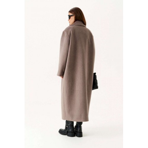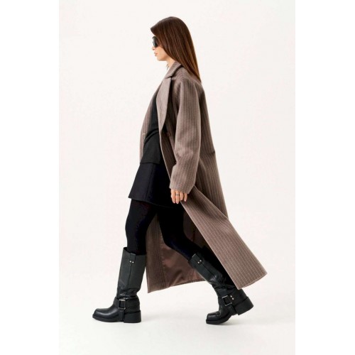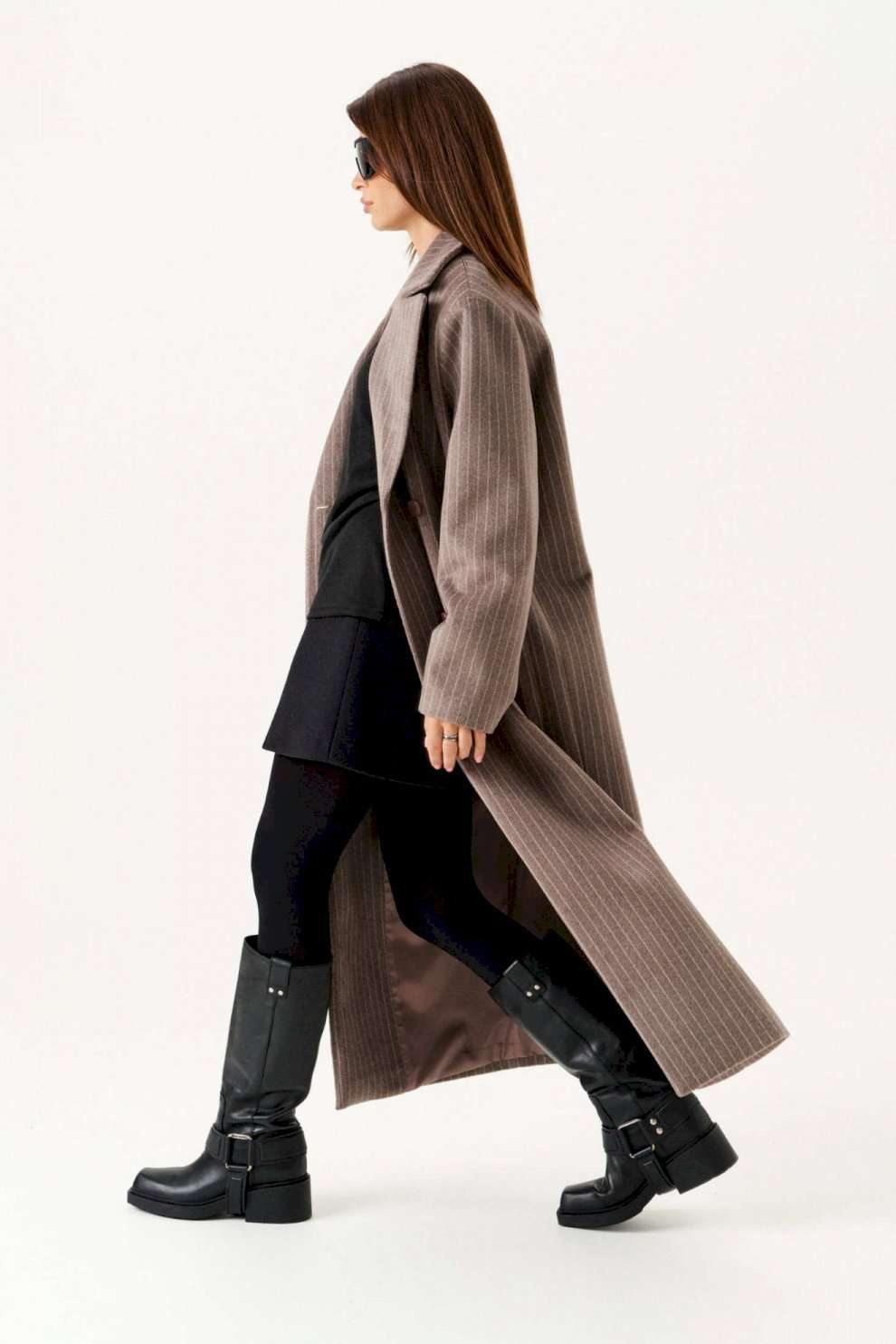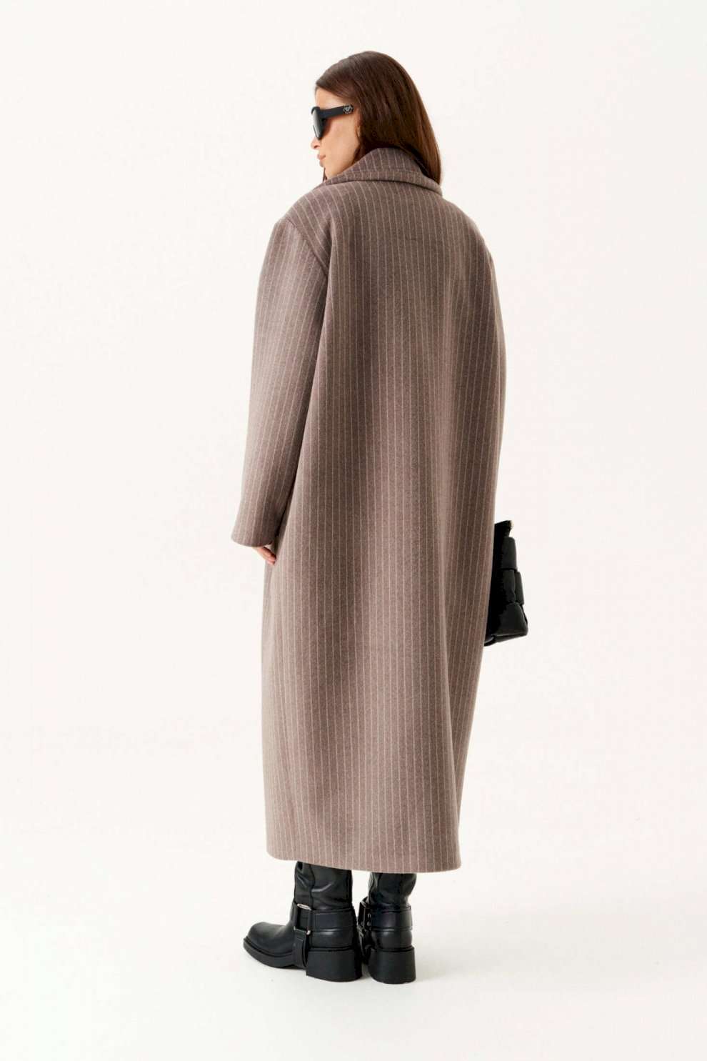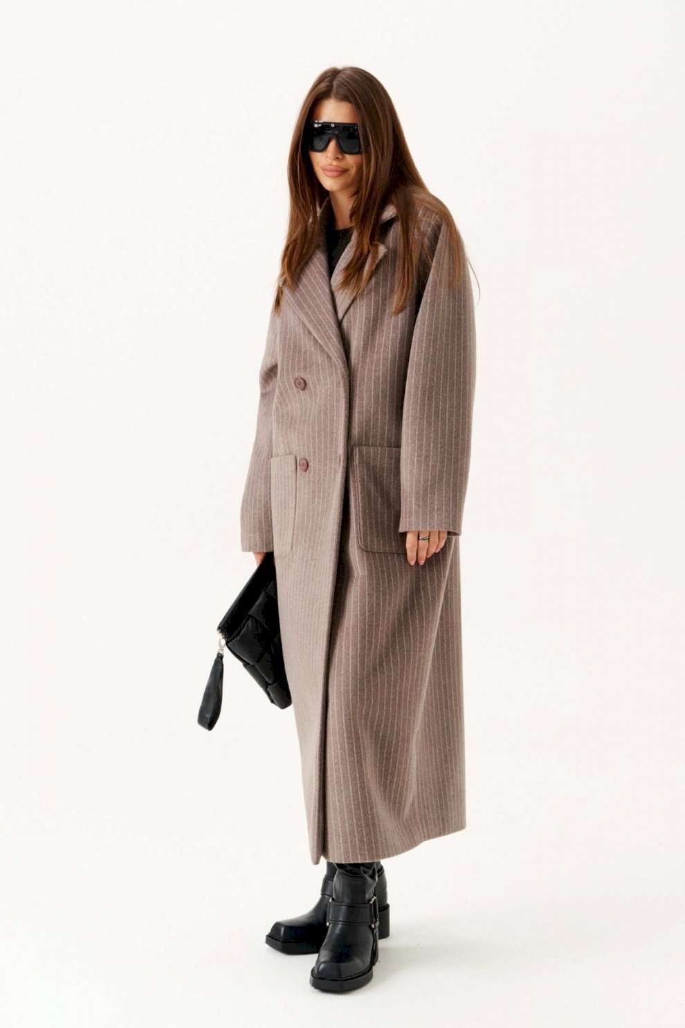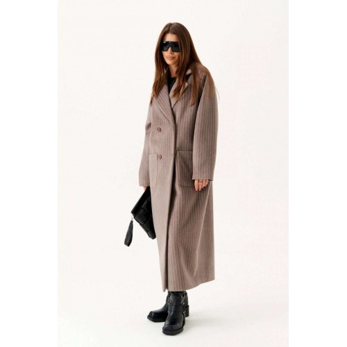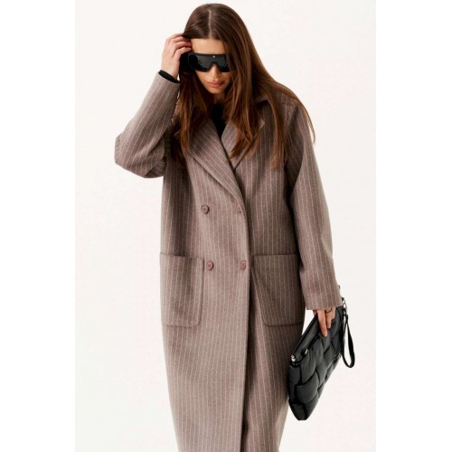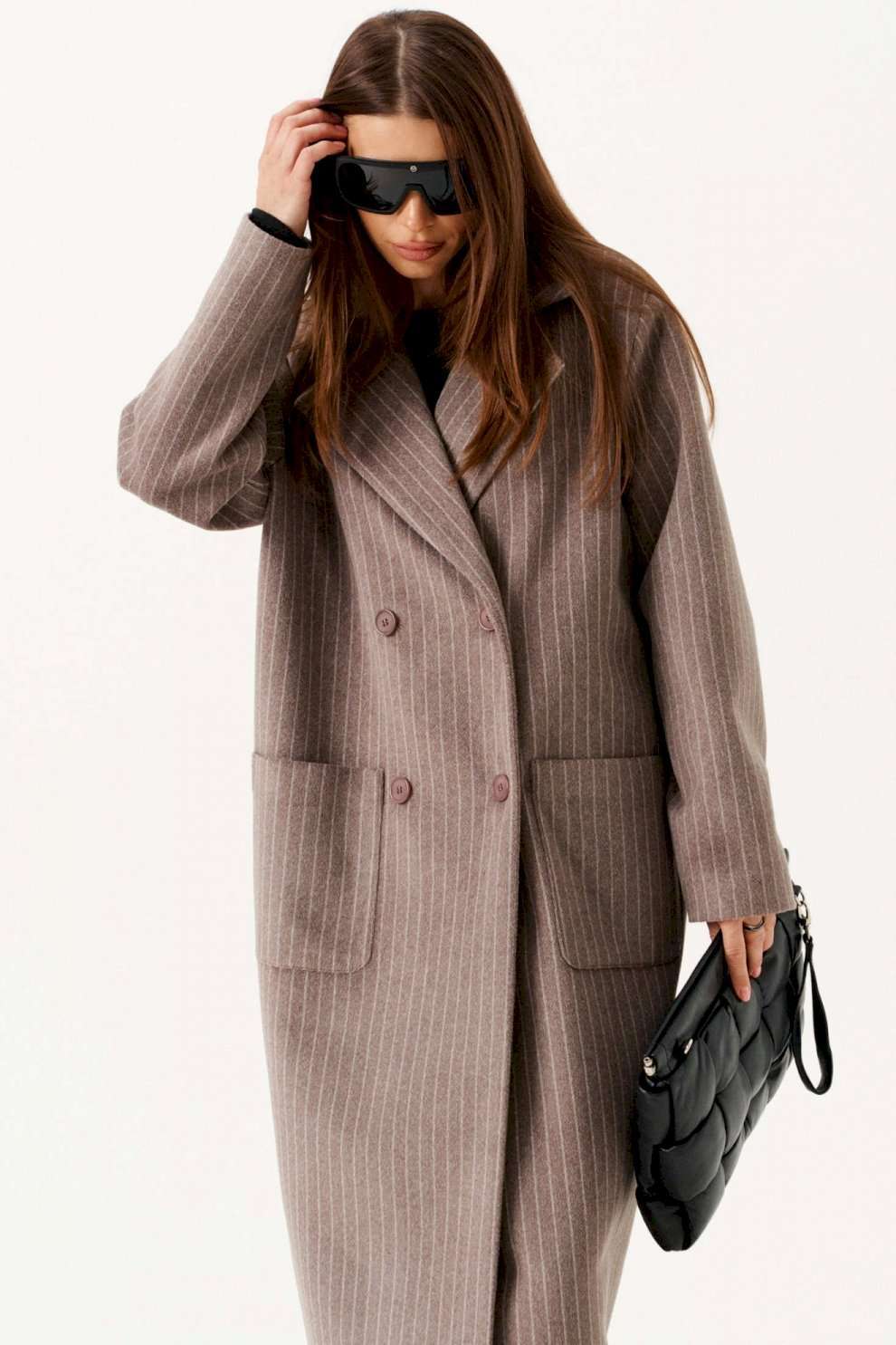 Пальто из трикотажного полотна, прямого силуэта, свободное, с центральной двубортной застежкой на петли и пуговицы, отложным воротником и лацканами пиджачного типа, на подкладке. Полочки с накладными карманами. Спинка цельная. Рукав втачной, длинный,одношовный.