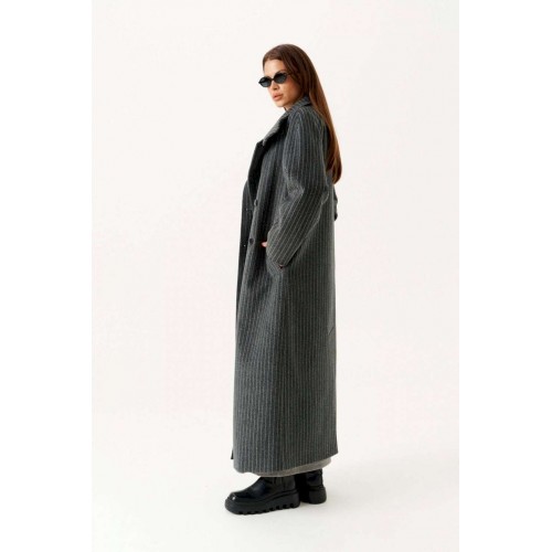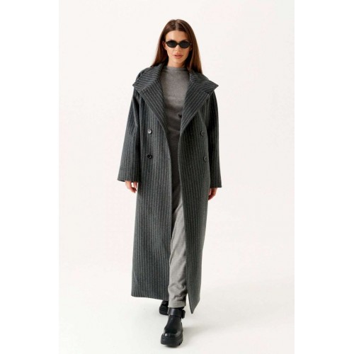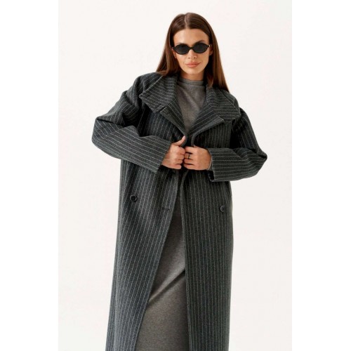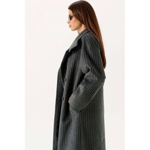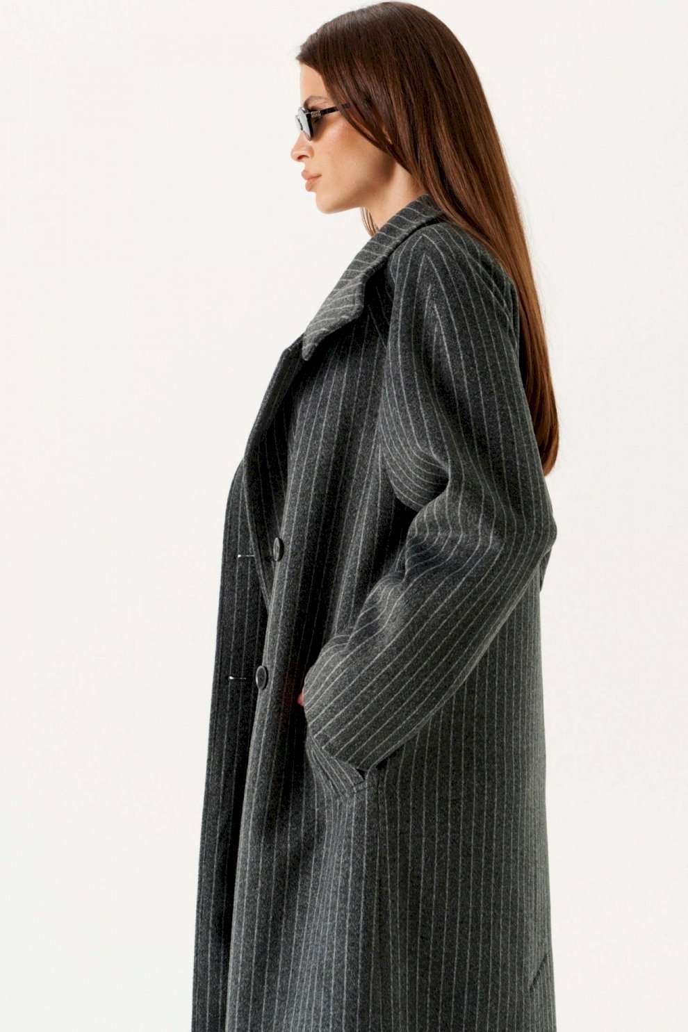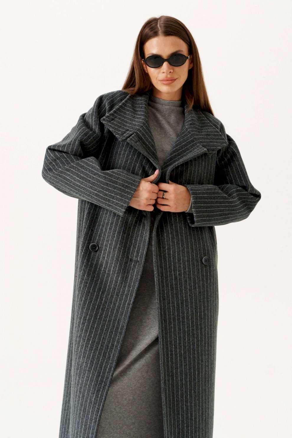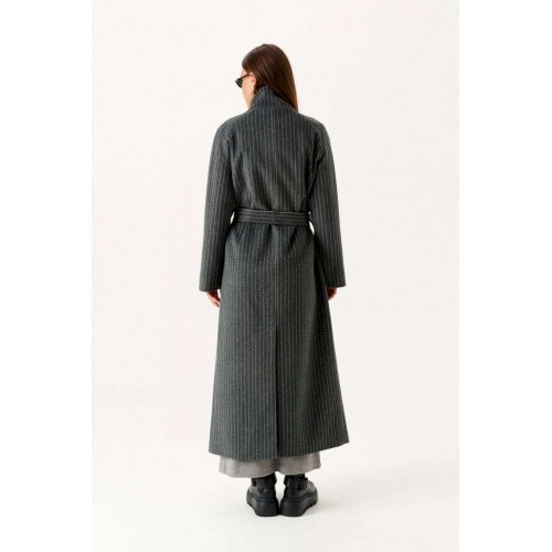 Пальто из трикотажного полотна прямого силуэта, с центральной двубортной застежкой на петли и пуговицы, на подкладке. Воротник – стойка с застежкой на петли и пуговицы. Полочки с прорезными карманами с листочкой. Спинка со средним швом и шлицей. Рукав – реглан. В комплекте пояс из основной ткани.