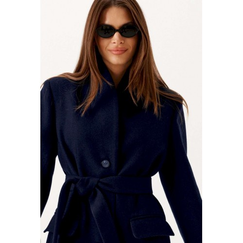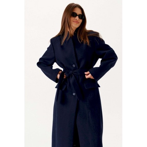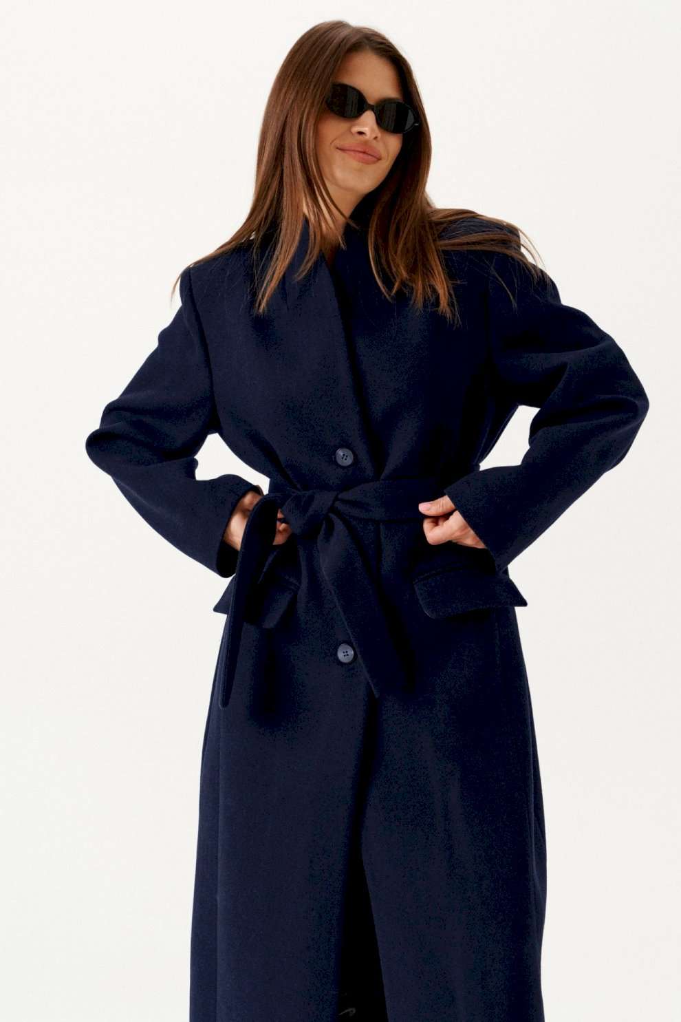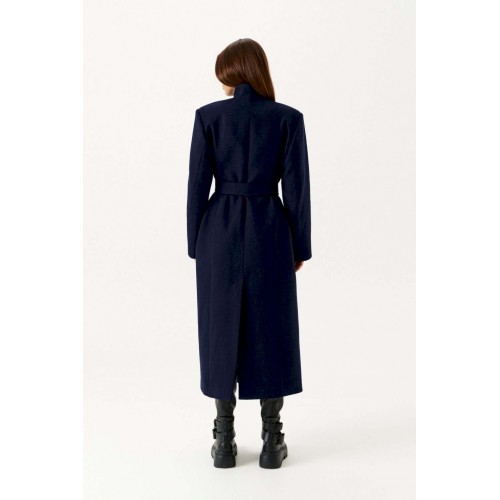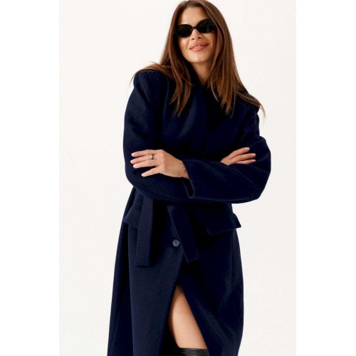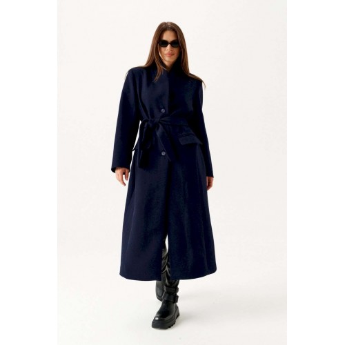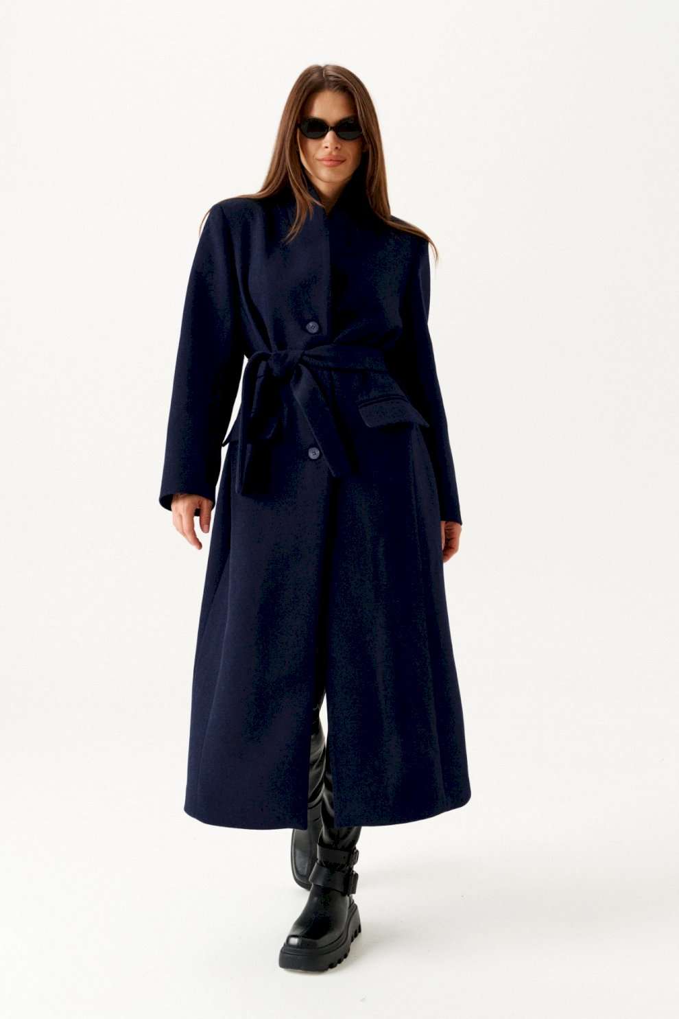 Пальто из пальтовой ткани, прямого силуэта, свободное, с центральной застежкой на петли и пуговицы, на подкладке. Воротник – цельнокроеная стойка. Полочки с отрезными бочками и прорезными карманами с клапаном и двумя обтачками. Спинка с отрезными бочками, со средним швом и шлицей. Рукав втачной, двухшовный, длинный. В комплекте пояс из основной ткани.