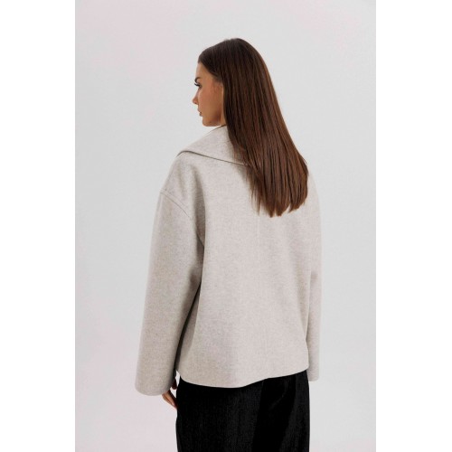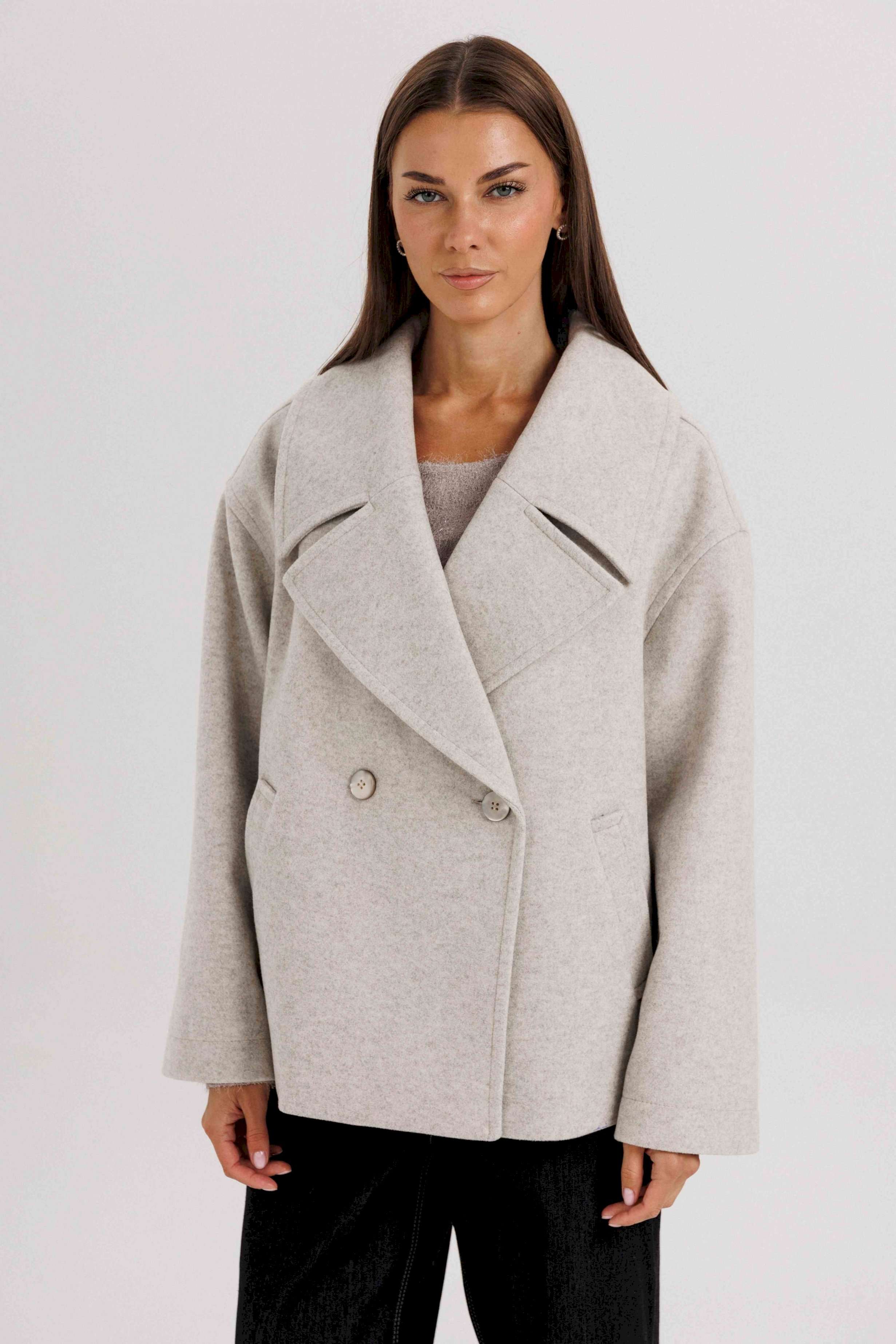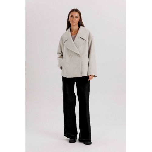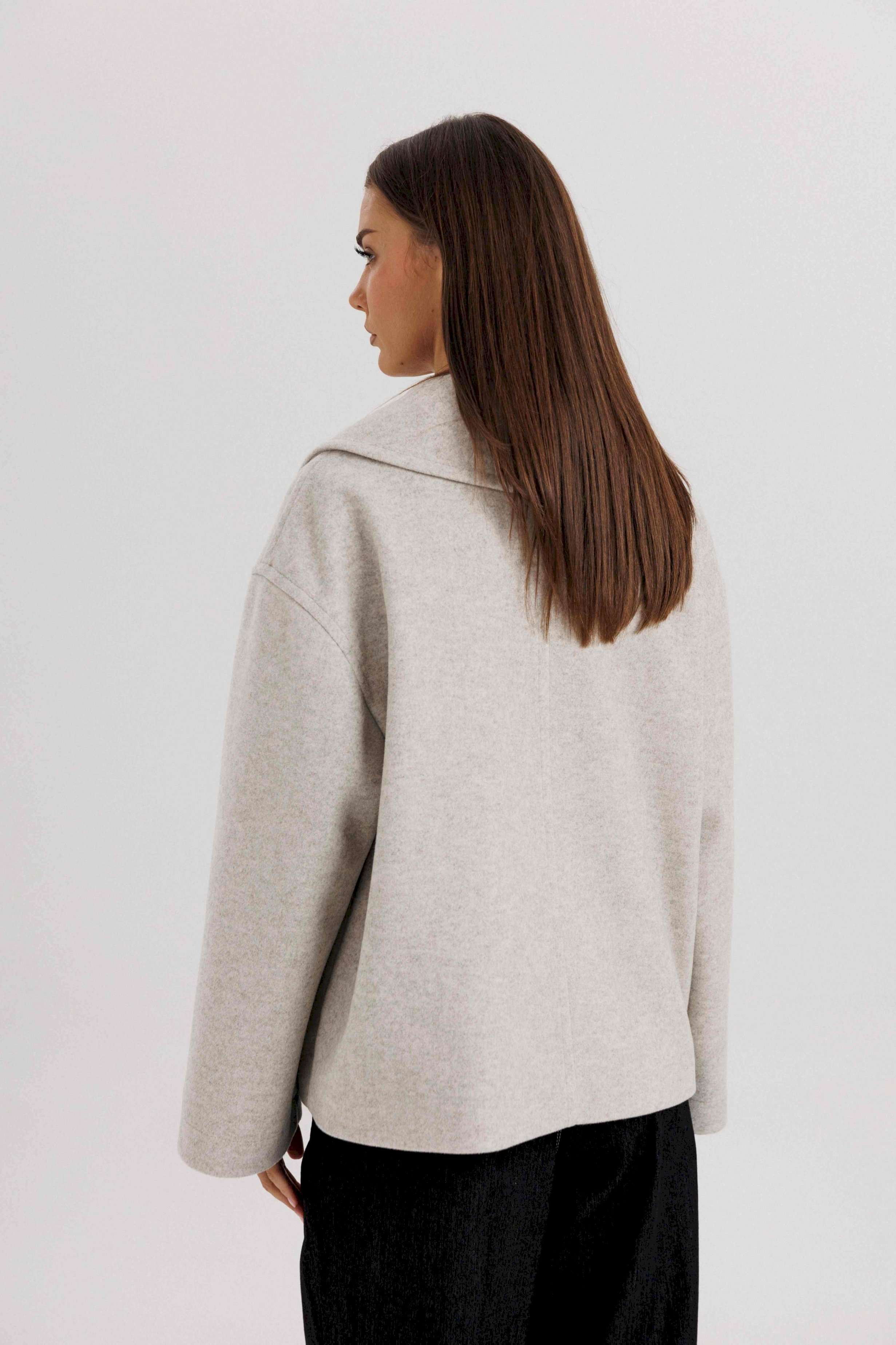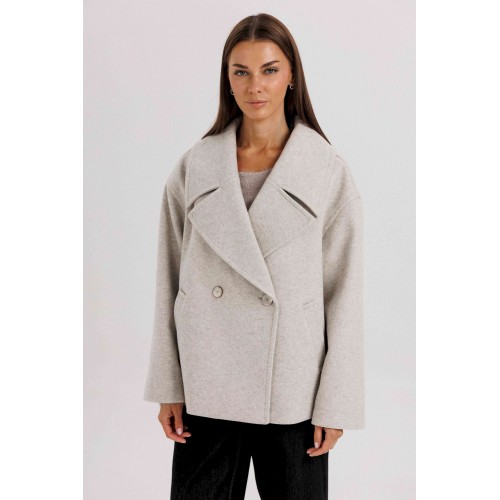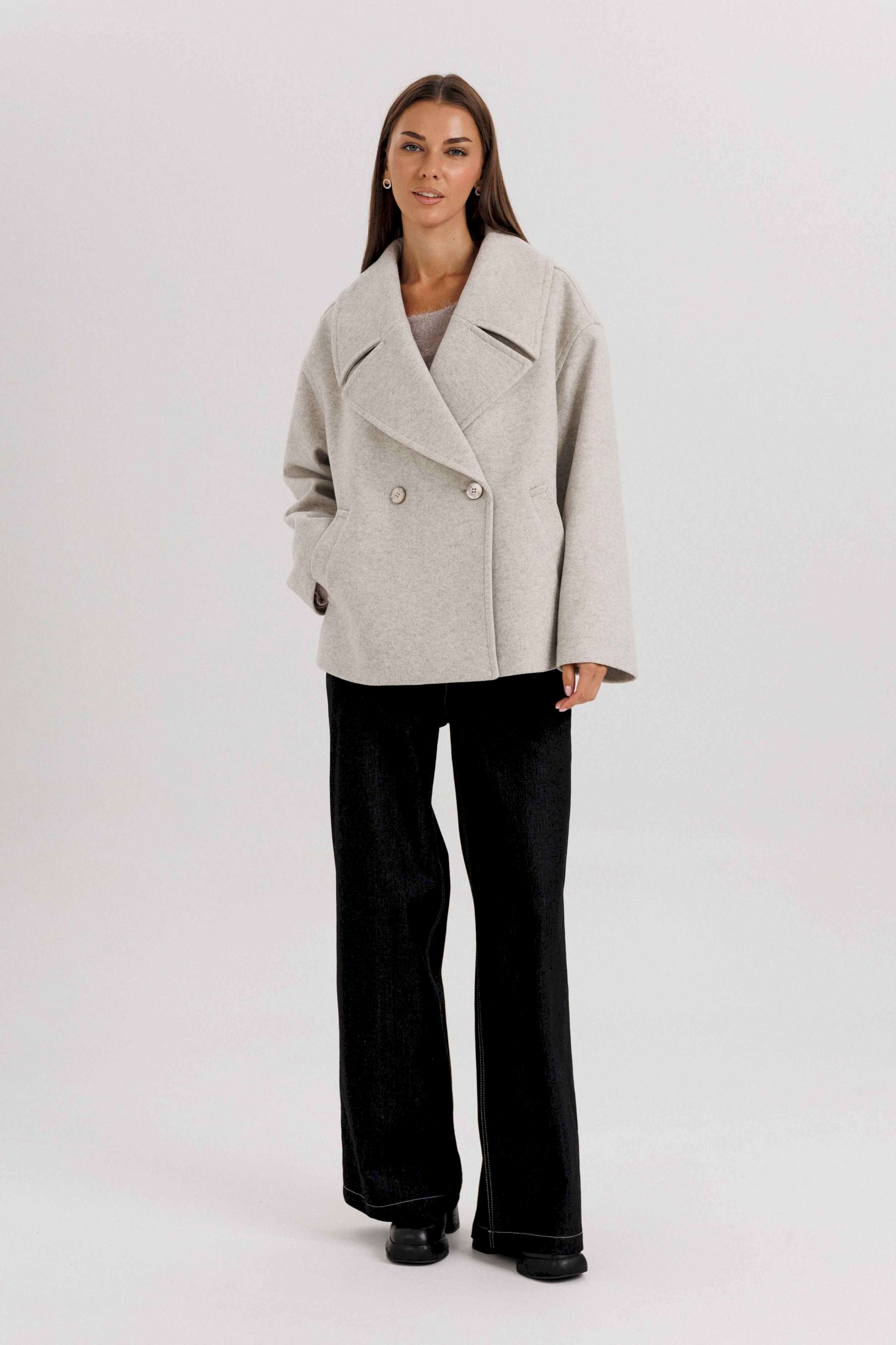 Стильное женское двубортное пальто в современном минималистичном дизайне. Лаконичный крой и нейтральный оттенок делают модель универсальной базой для любого гардероба. Пальто легко комбинируется с классическими и повседневными образами, подчеркивая элегантность и вкус своей обладательницы. Конструктивные особенности: Свободный прямой силуэт, комфортная посадка. Двубортная застёжка на крупные пуговицы. Укороченная длина — до линии бедра, что делает модель удобной для динамичного образа жизни. Широкие лацканы создают выразительный акцент. Длинные рукава прямого кроя. Боковые карманы с листочками для удобства. Нейтральный светло-серый оттенок, подходящий под любые сочетания. Особенности образа: Универсальный дизайн — подходит как для офиса, так и для кэжуал образов. Свободный крой не сковывает движений. Идеально смотрится с брюками, джинсами и юбками. Длина изделия около 60 см. Длина рукава с плечом около 75 см. Уход: Химчистка. Хранить на плечиках, чтобы сохранить форму.
