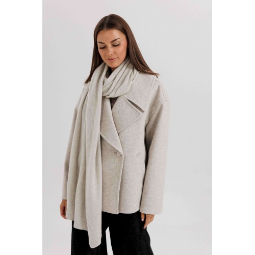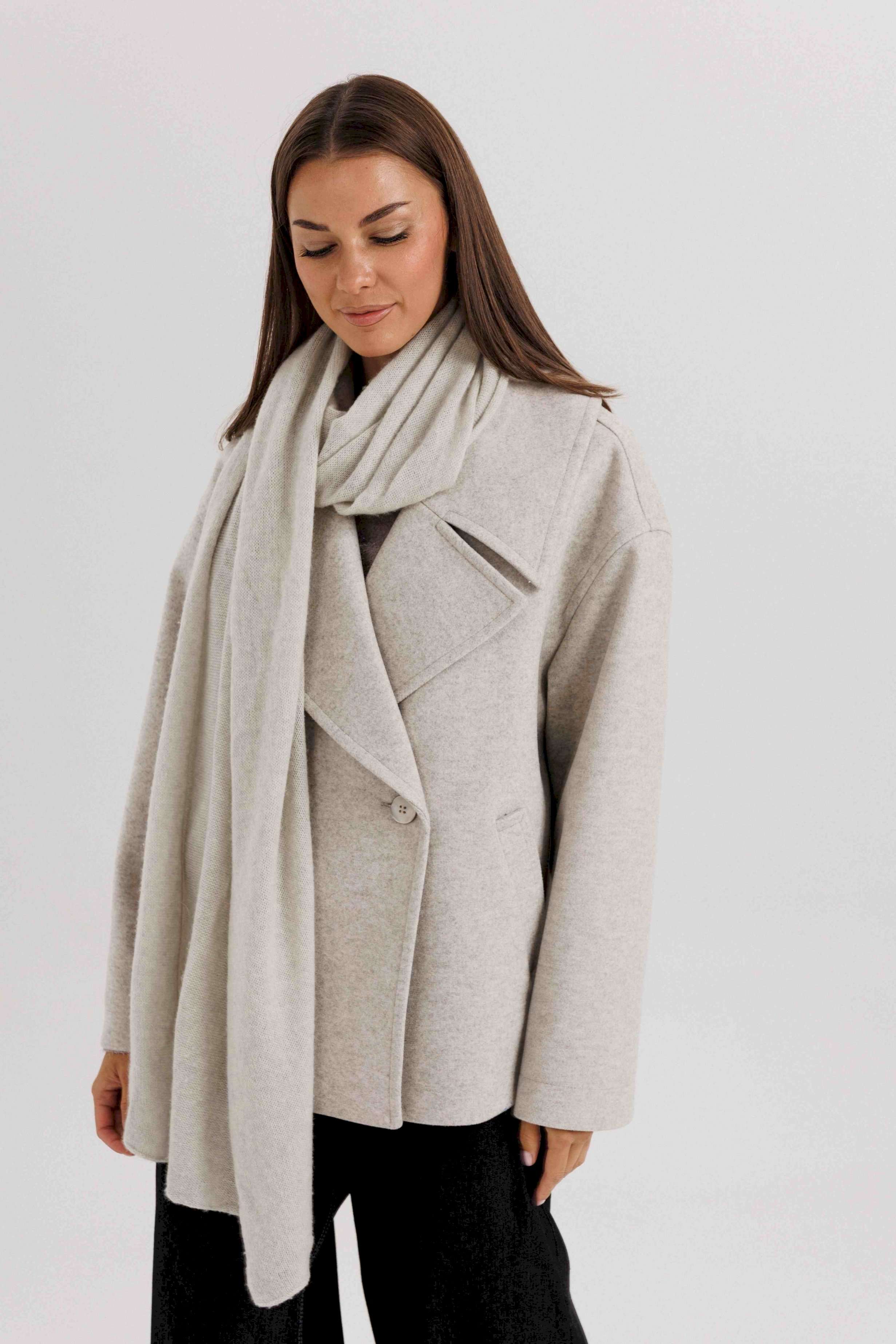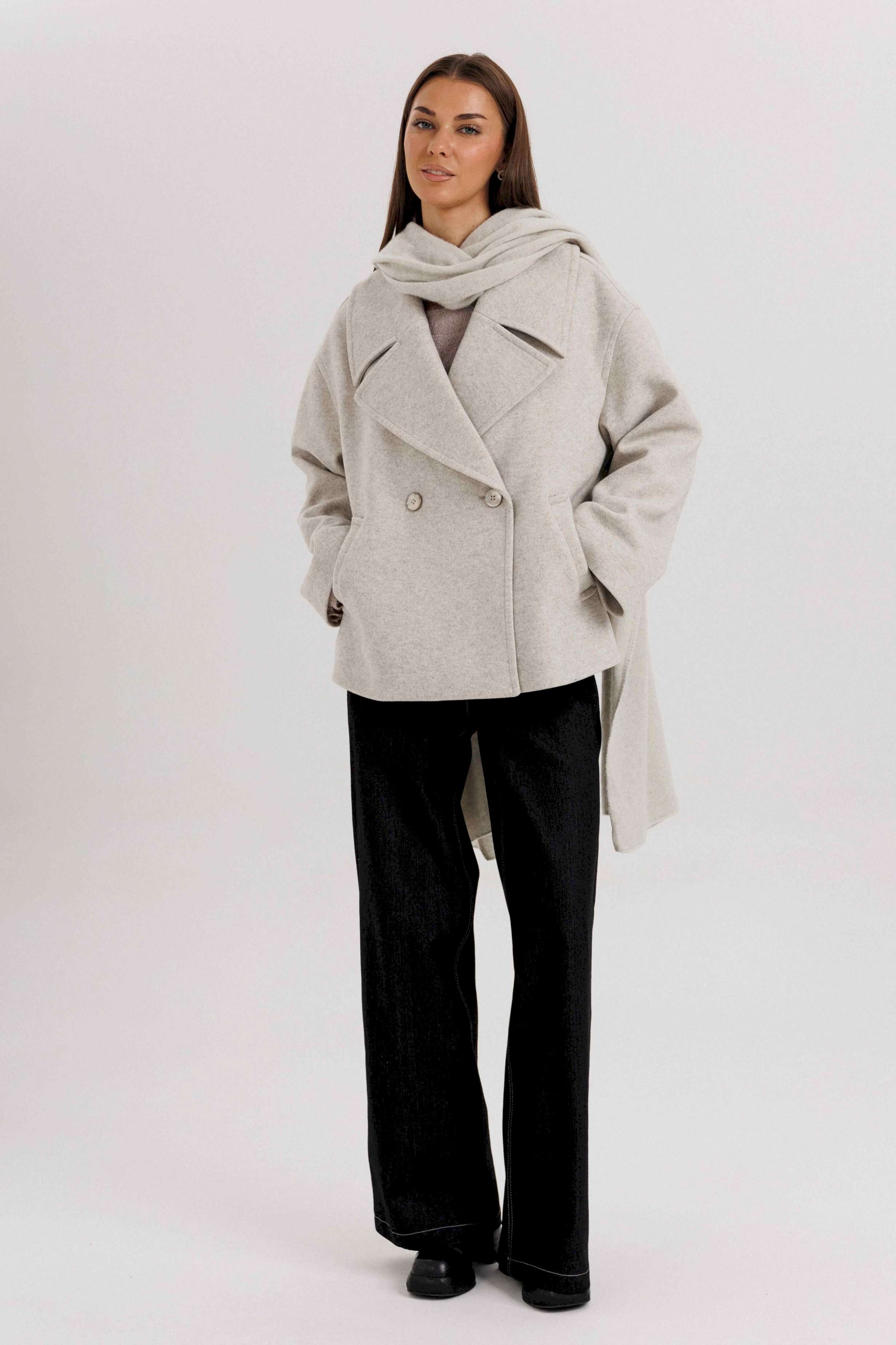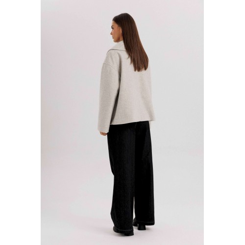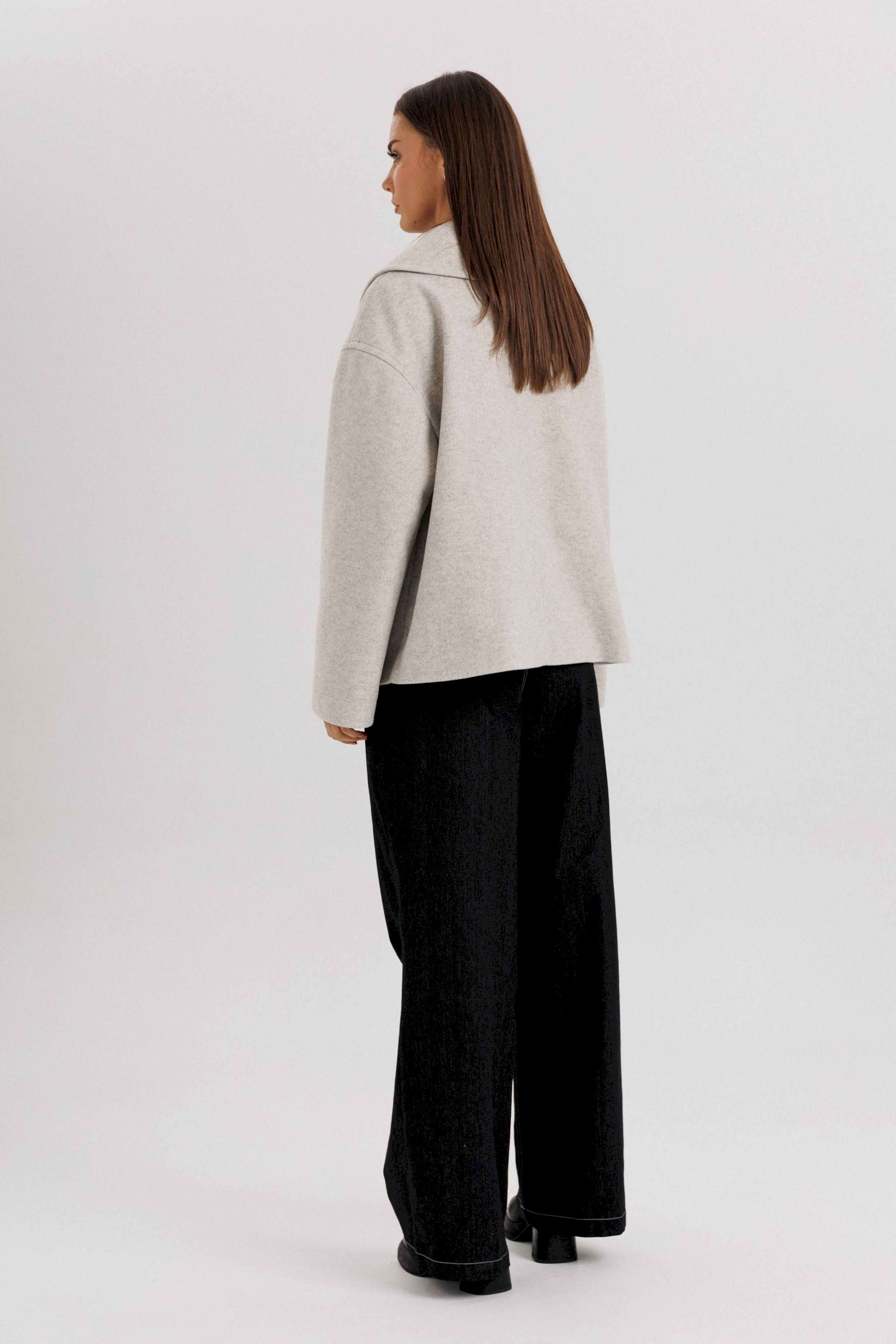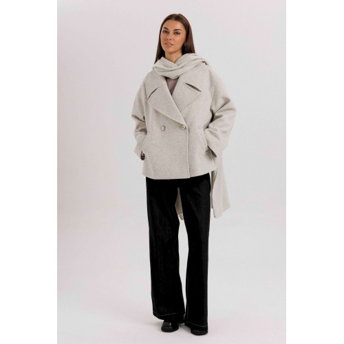 Стильное женское двубортное пальто в современном минималистичном дизайне. Лаконичный крой и нейтральный оттенок делают модель универсальной базой для любого гардероба. Пальто легко комбинируется с классическими и повседневными образами, подчеркивая элегантность и вкус своей обладательницы. Конструктивные особенности: Свободный прямой силуэт, комфортная посадка. Двубортная застёжка на крупные пуговицы. Укороченная длина — до линии бедра, что делает модель удобной для динамичного образа жизни. Широкие лацканы создают выразительный акцент. Длинные рукава прямого кроя. Боковые карманы с листочками для удобства. Нейтральный светло-серый оттенок, подходящий под любые сочетания. Особенности образа: Универсальный дизайн — подходит как для офиса, так и для кэжуал образов. Свободный крой не сковывает движений. Идеально смотрится с брюками, джинсами и юбками. Длина изделия около 60 см. Длина рукава с плечом около 75 см. Уход: Химчистка. Хранить на плечиках, чтобы сохранить форму.