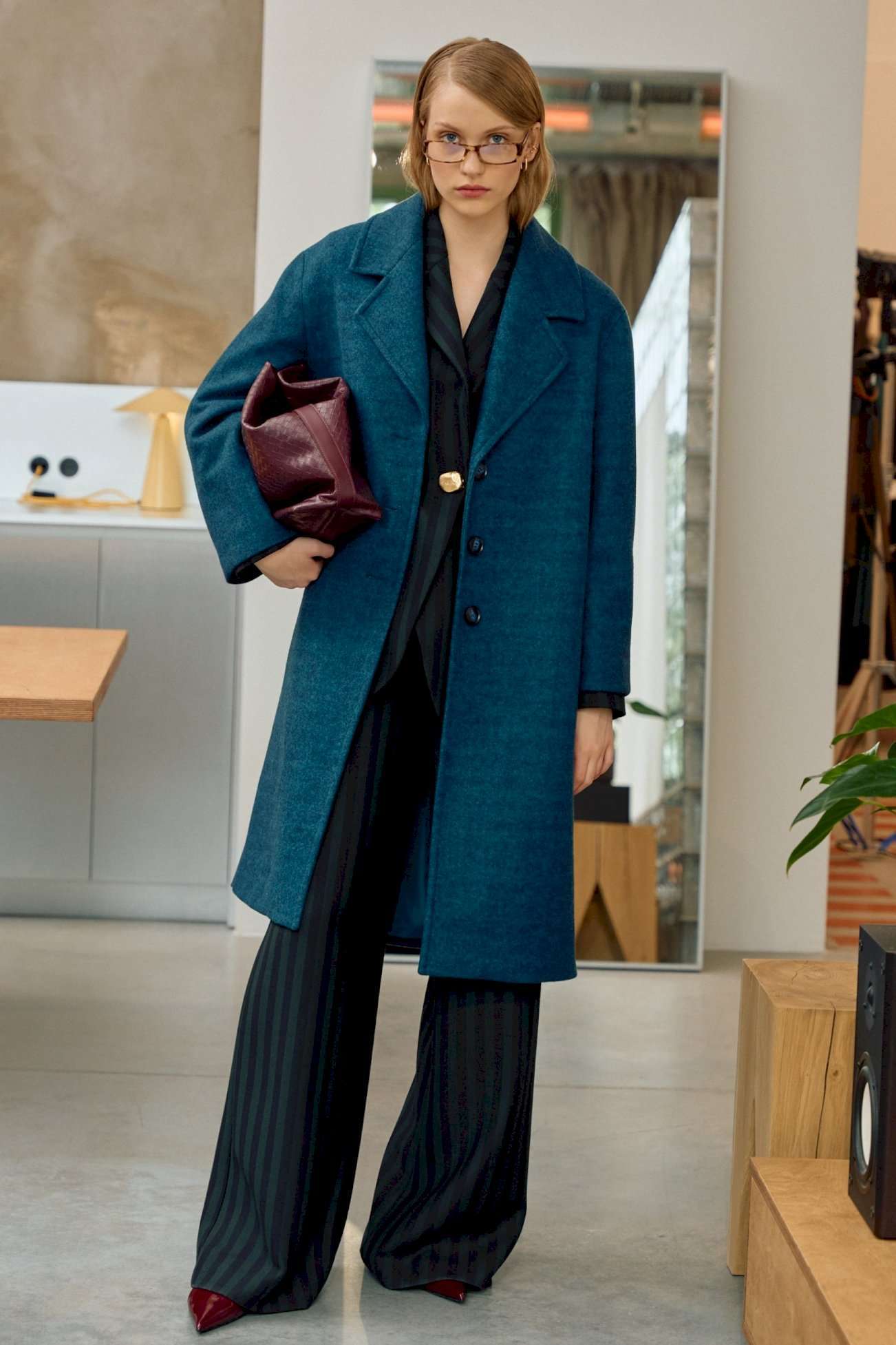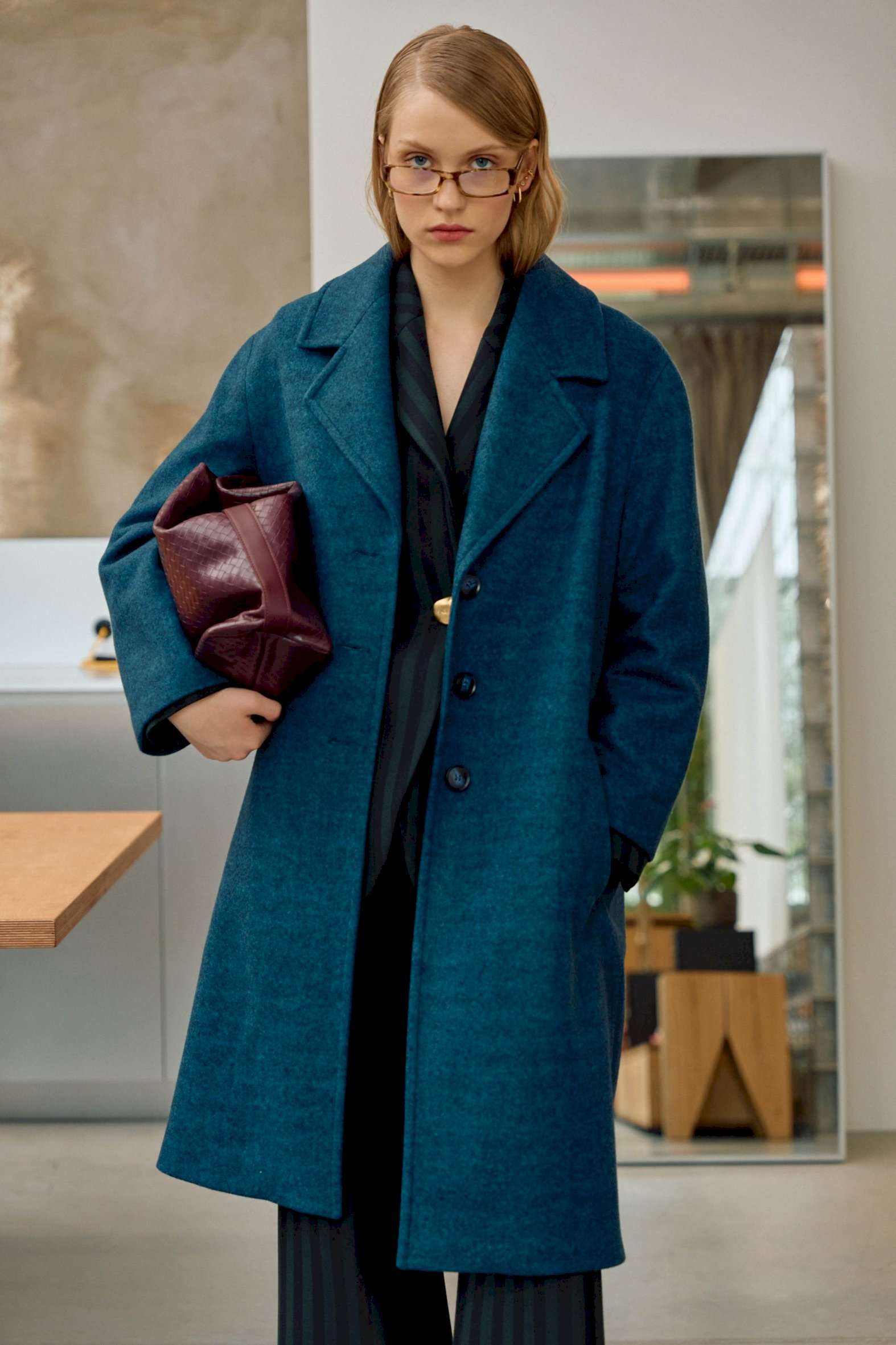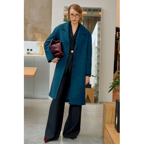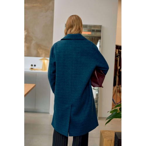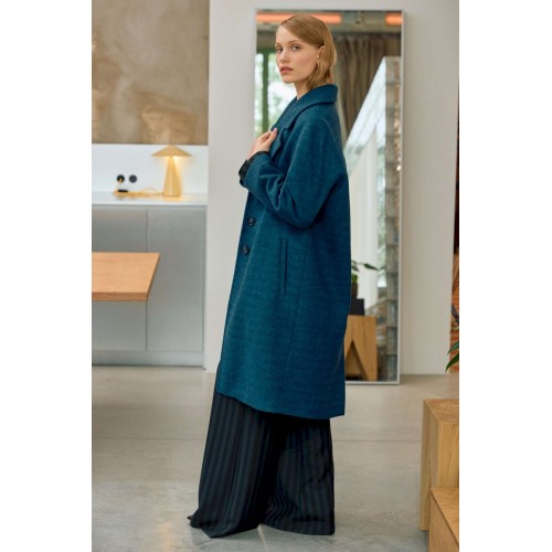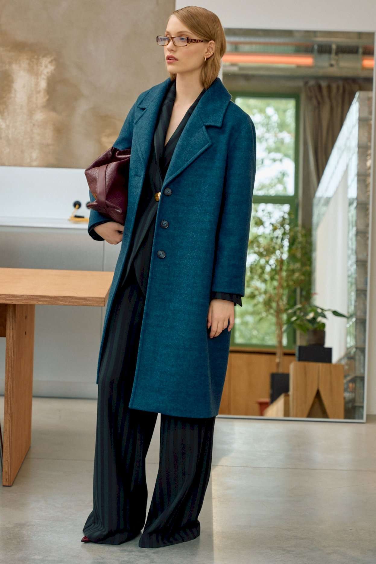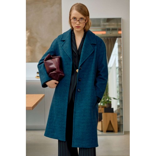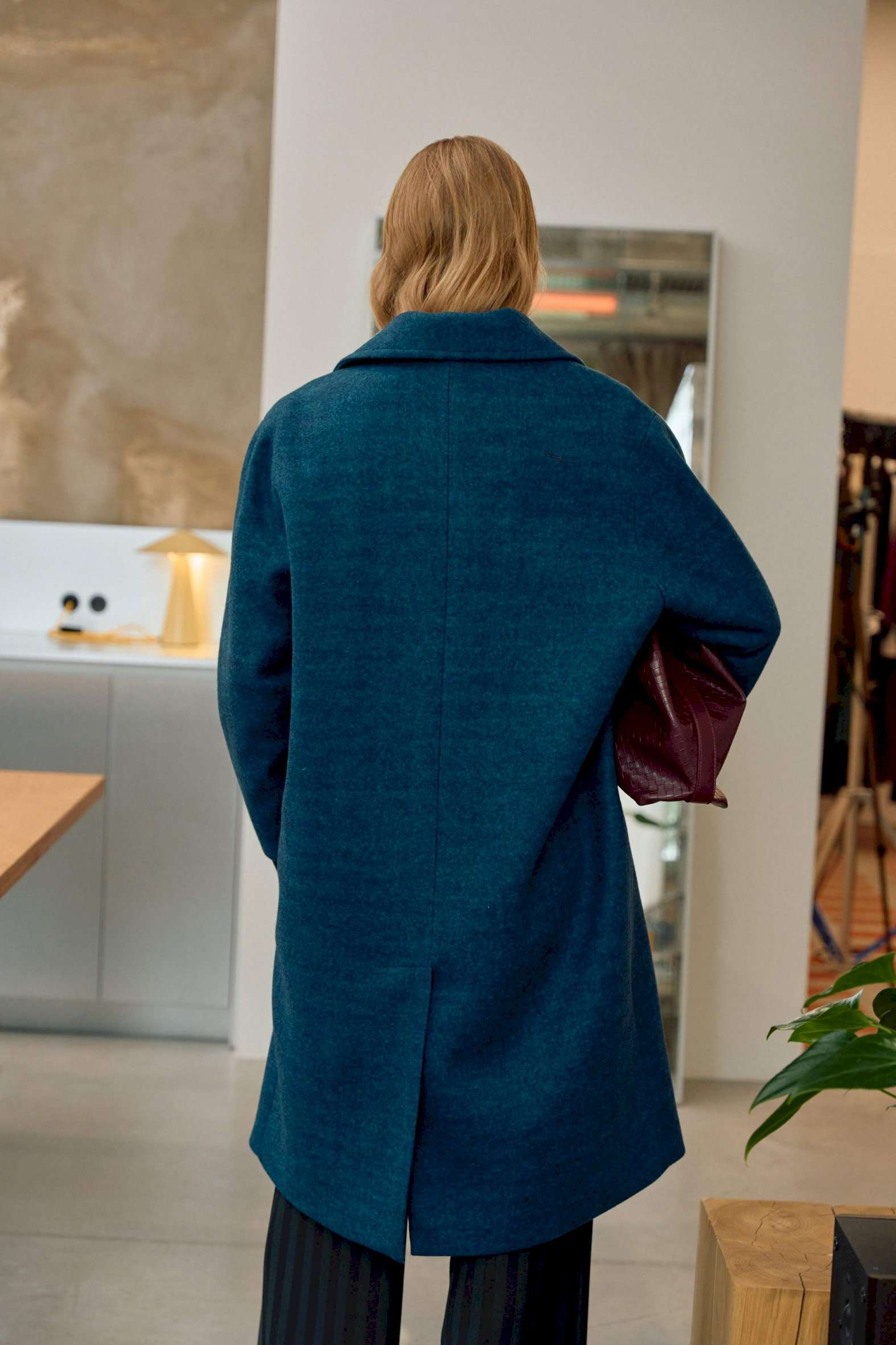 Пальто свободного кроя на подкладке. Линия плеча спущена, рукав длинный. Воротник пиджачного типа, застежка центральная на петли и пуговицы, в боковых швах карманы. Пальто: Длина по спинке от высшей точки горловины: 109 см Длина рукава от горловины: 70 см ОГ: 120-124-128-132-136 см (размер 44-46-48-50-52)