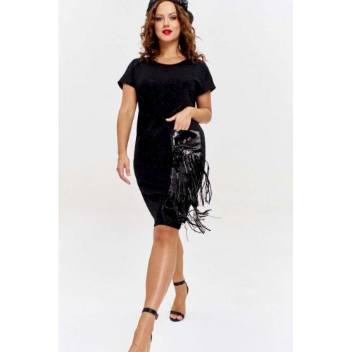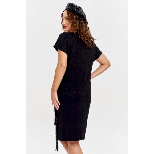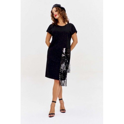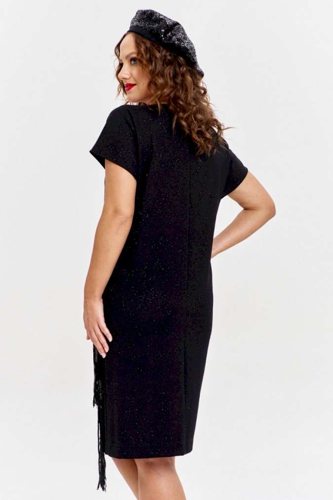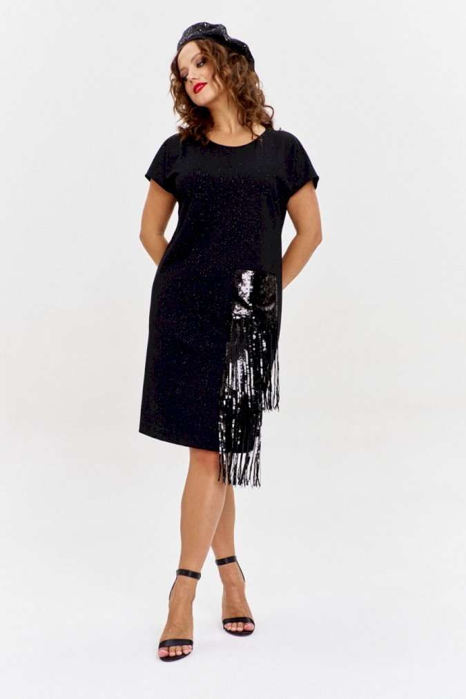 Платье из трикотажного полотна с эффектным мерцанием, прямого силуэта, со спущенным рукавом и круглой горловиной. Перед изделия с накладным карманом из пайеток с бахромой, каскадом спускающимся до низа изделия.