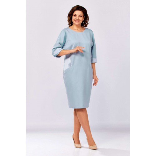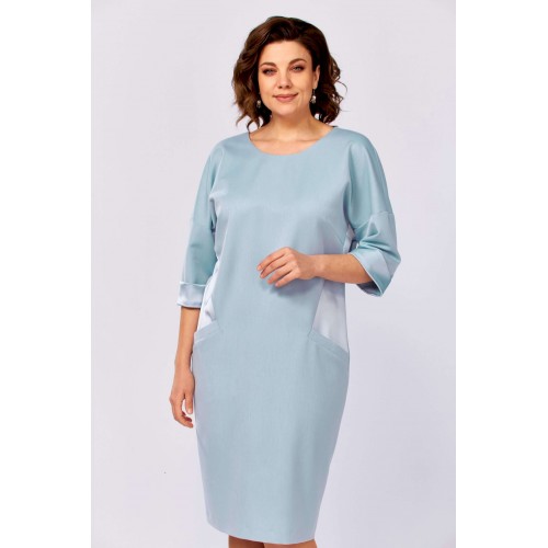 Платье женское, комбинированное из двух видов ткани- однотонной плательной и атласа. Вырез горловины-полукруглый спереди, а по спинке V- образный с планкой до низа изделия и с пуговицами. По бокам переда вставки из атласа и карманы, рукав изделия 3/4 длины с манжетной из атласа. Изделие полуприлегающее без застёжки.