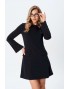 Маленькое черное платье из трикотажной ткани. Платье полуприлегащего силуэта, расширенное к низу, длиной мини. Вырез горловины округлый. Рукава длинные, втачные одношовные. Рукав расширен к низу, снизу в шве разрез длиной 12 см. По полочке нагрудные вытачки, выходящие из проймы. На уровне бедер два кармана в рамку с клапанами. По спинке талиевые вытачки и средний шов, вверху которого застежка на потайную тесьму-молнию. Платье без подкладки.