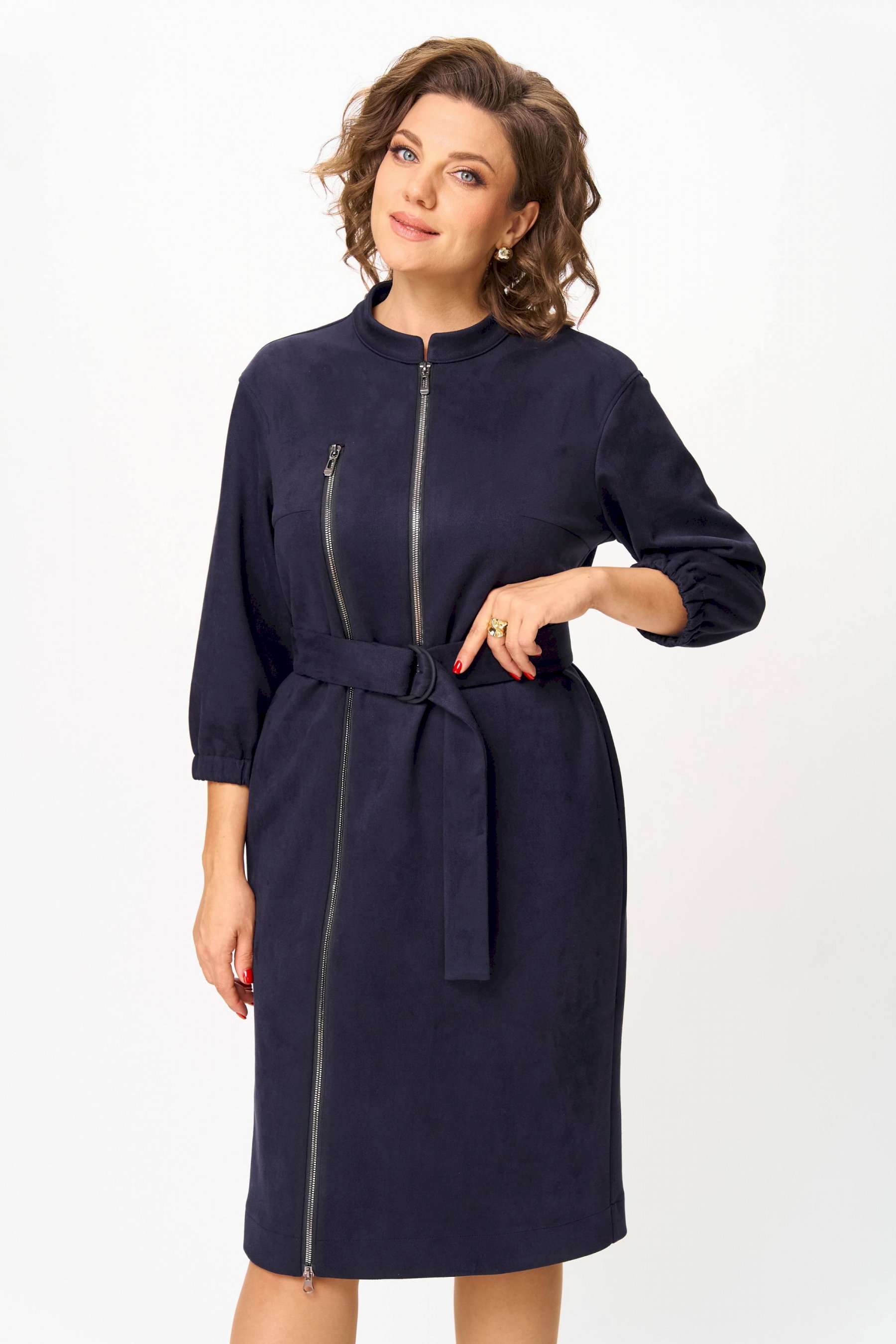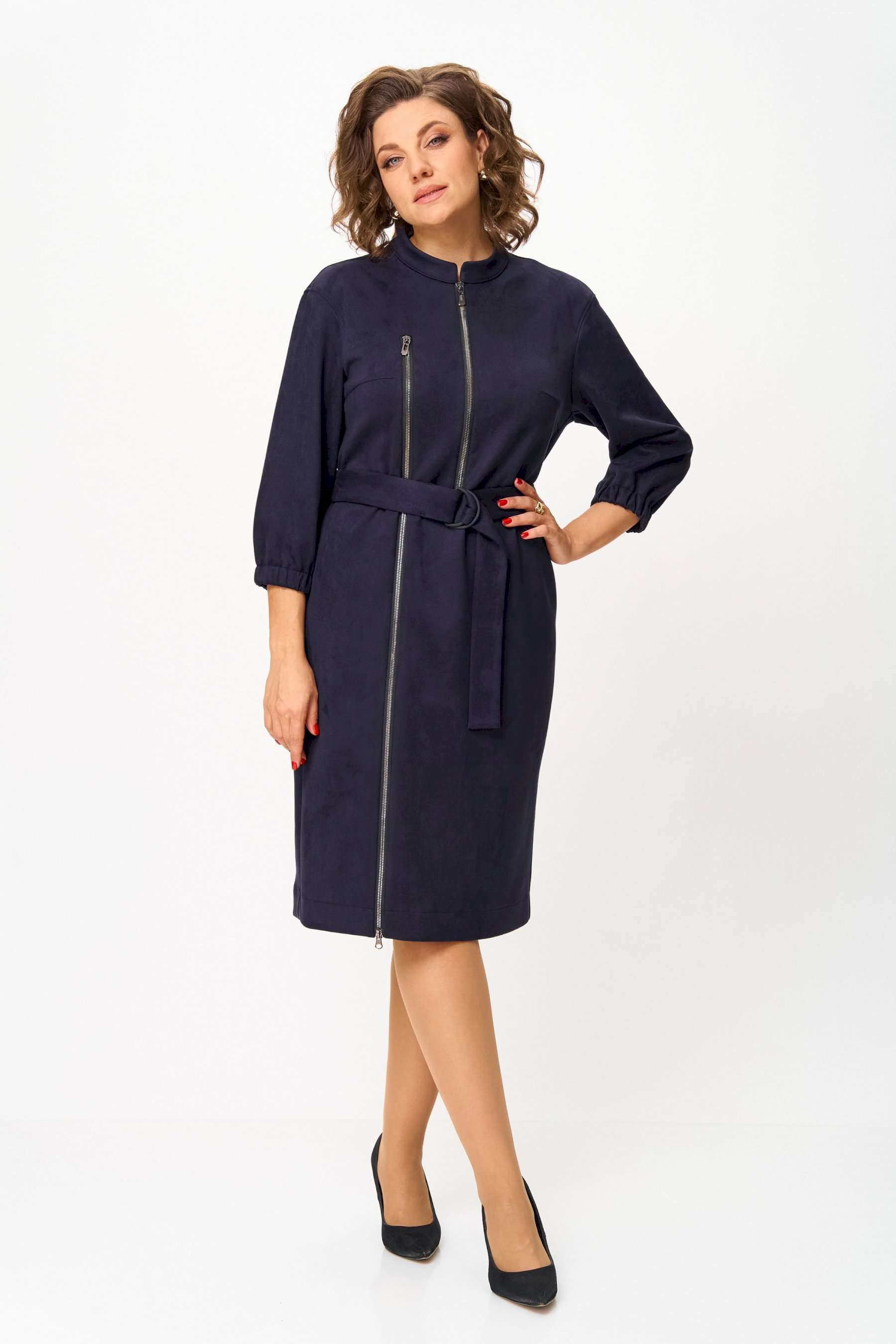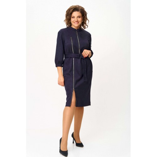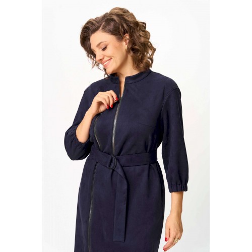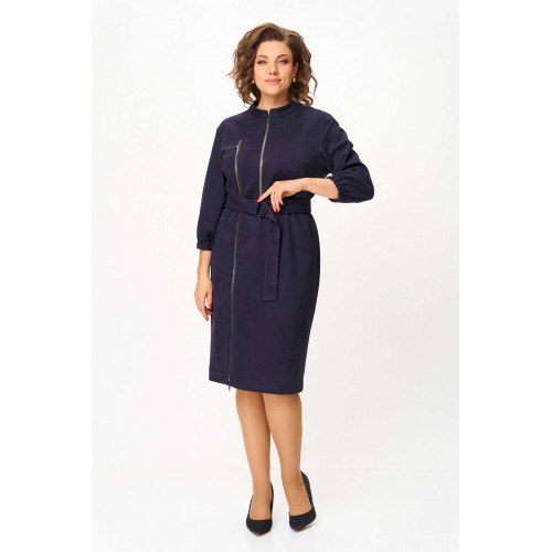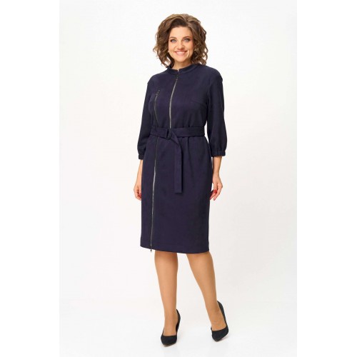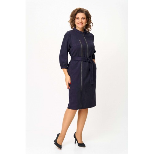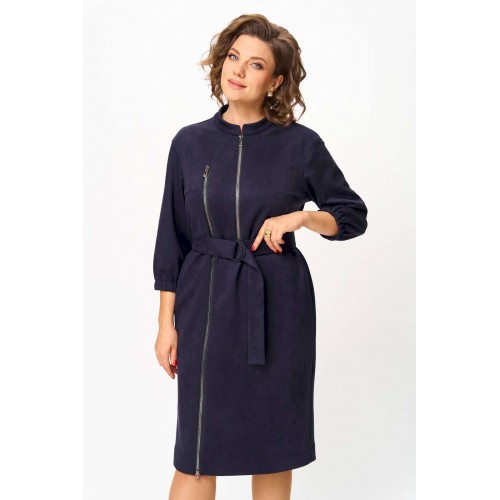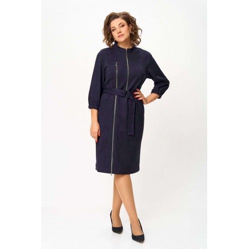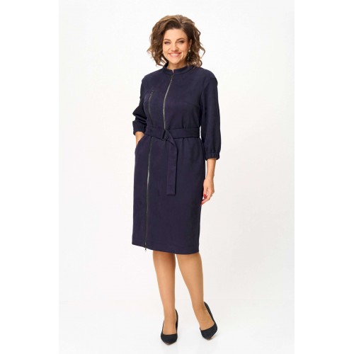 Элегантное женское платье из ткани искусственная замша. Платье полуприлегающего силуэта. По переду платье декорировано двумя рядами молнии. Горловина оформлена воротником стойка, в боковых швах на уровне бедер карманы. Спинка с центральным швом. Линия плеча спущена. Рукава втачные, длина ¾, низ на резинке. Длина платья по спинке – 108 см. Длина рукава – 44 см.