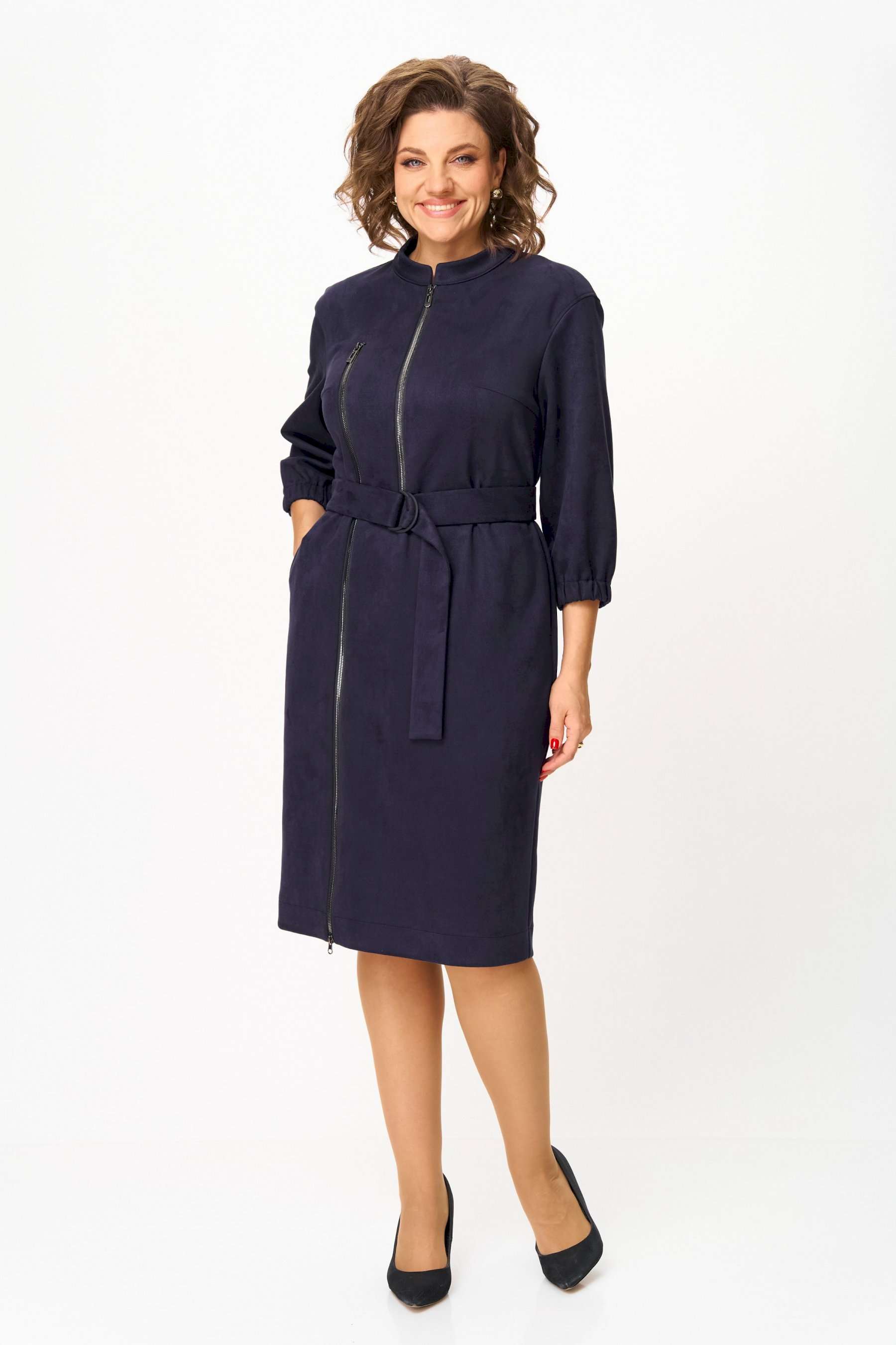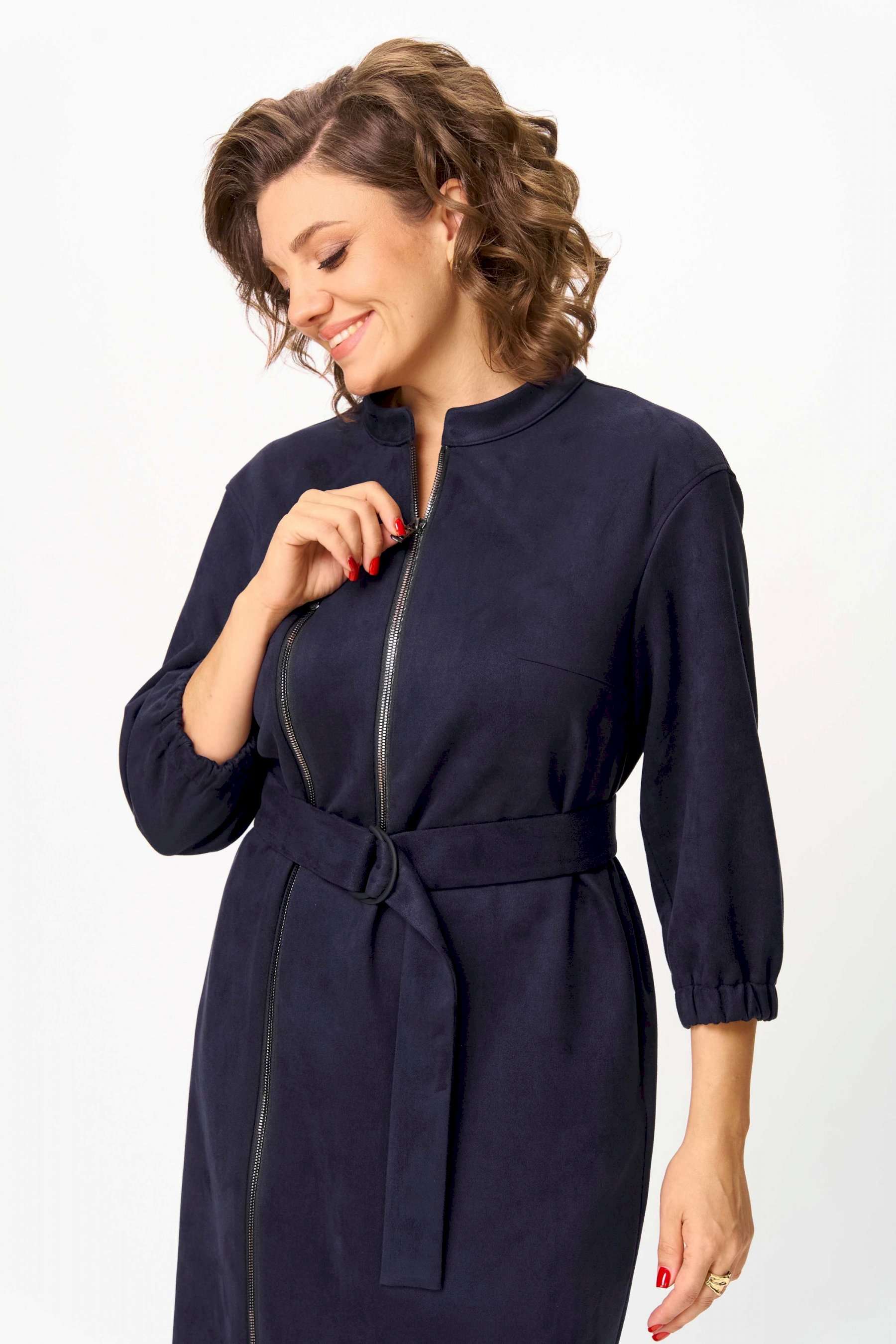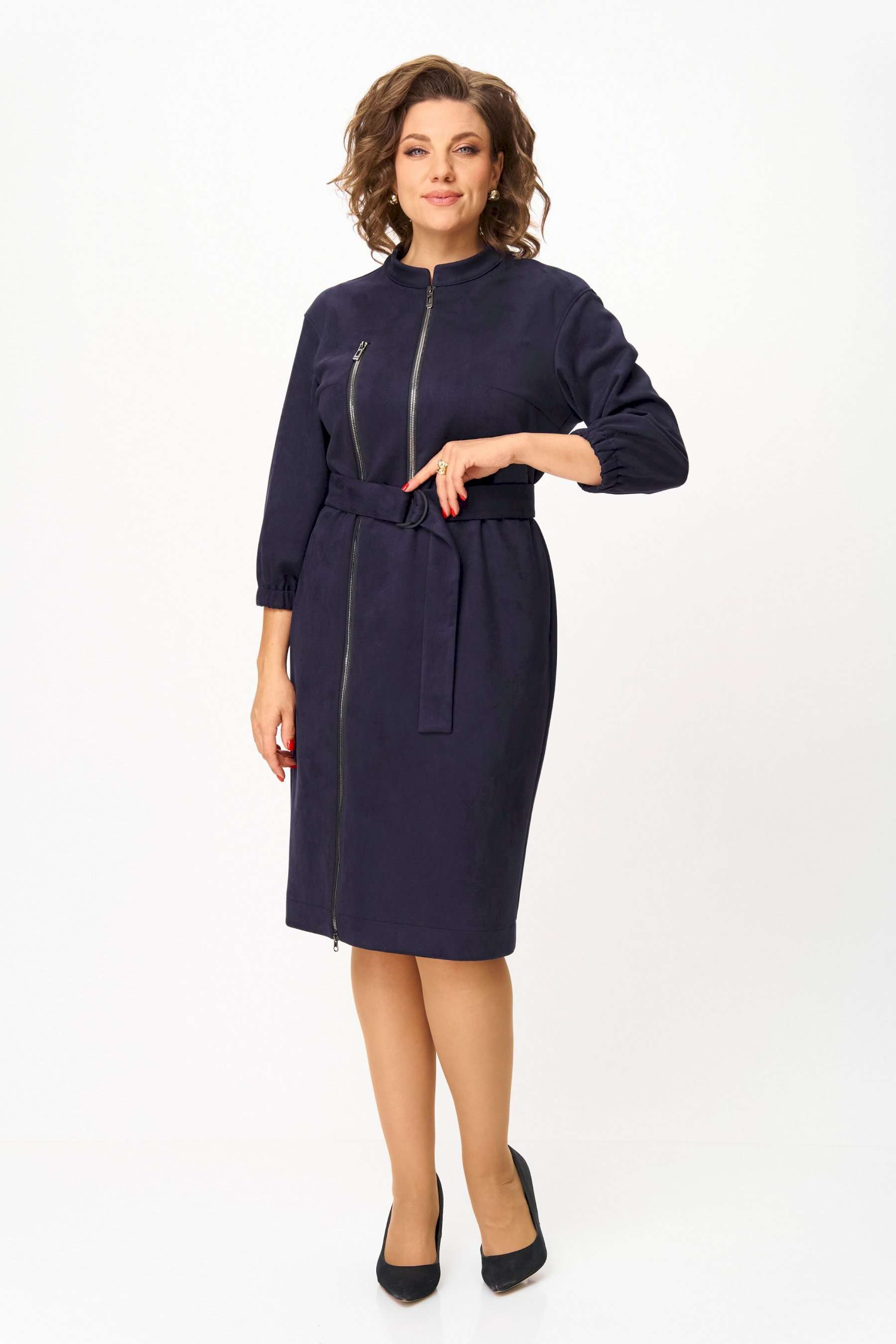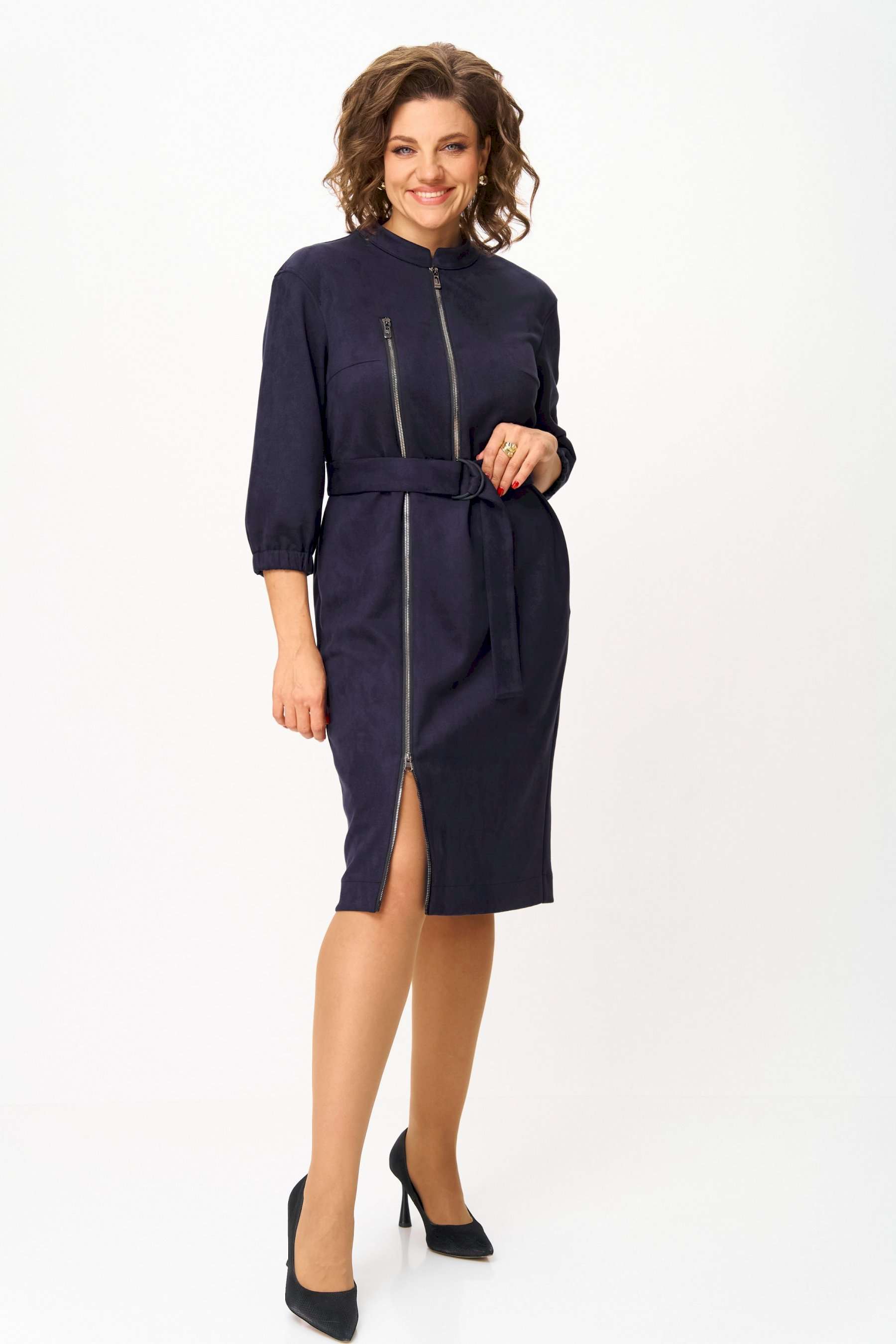 Элегантное женское платье из ткани искусственная замша. Платье полуприлегающего силуэта. По переду платье декорировано двумя рядами молнии. Горловина оформлена воротником стойка, в боковых швах на уровне бедер карманы. Спинка с центральным швом. Линия плеча спущена. Рукава втачные, длина ¾, низ на резинке. Длина платья по спинке – 108 см. Длина рукава – 44 см.