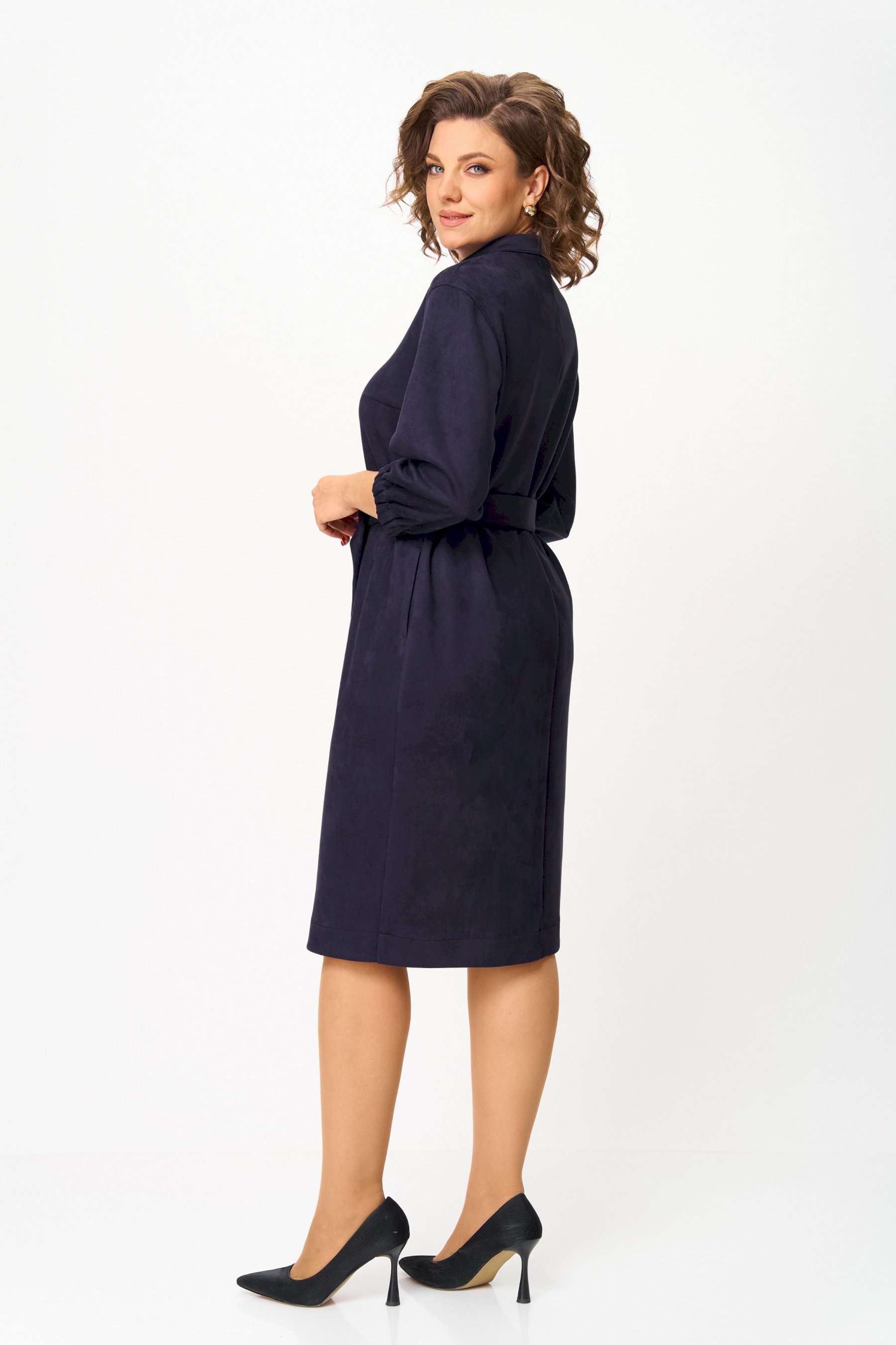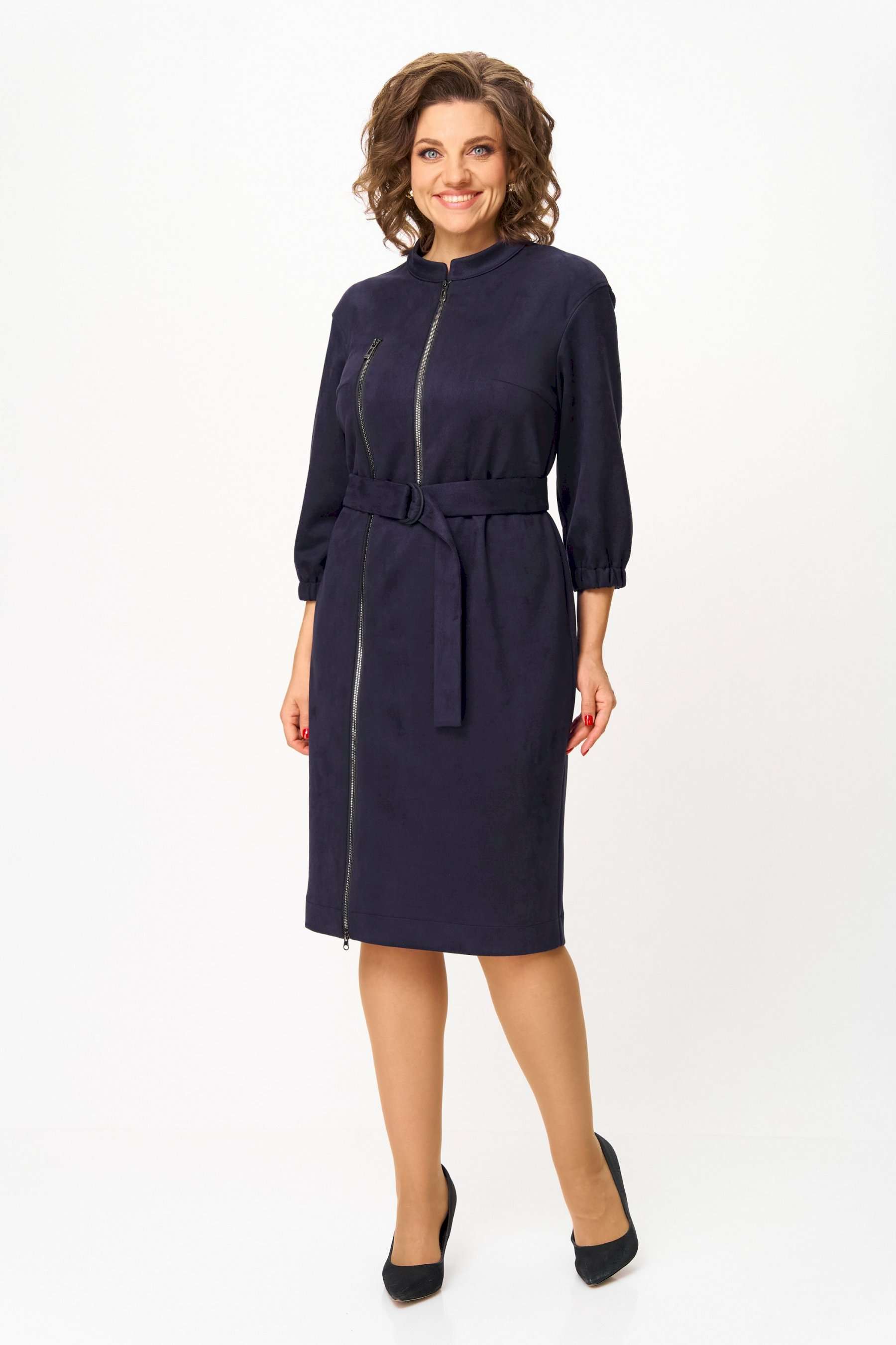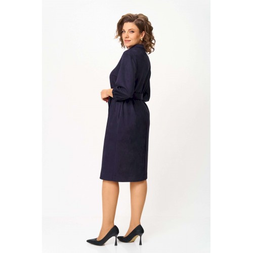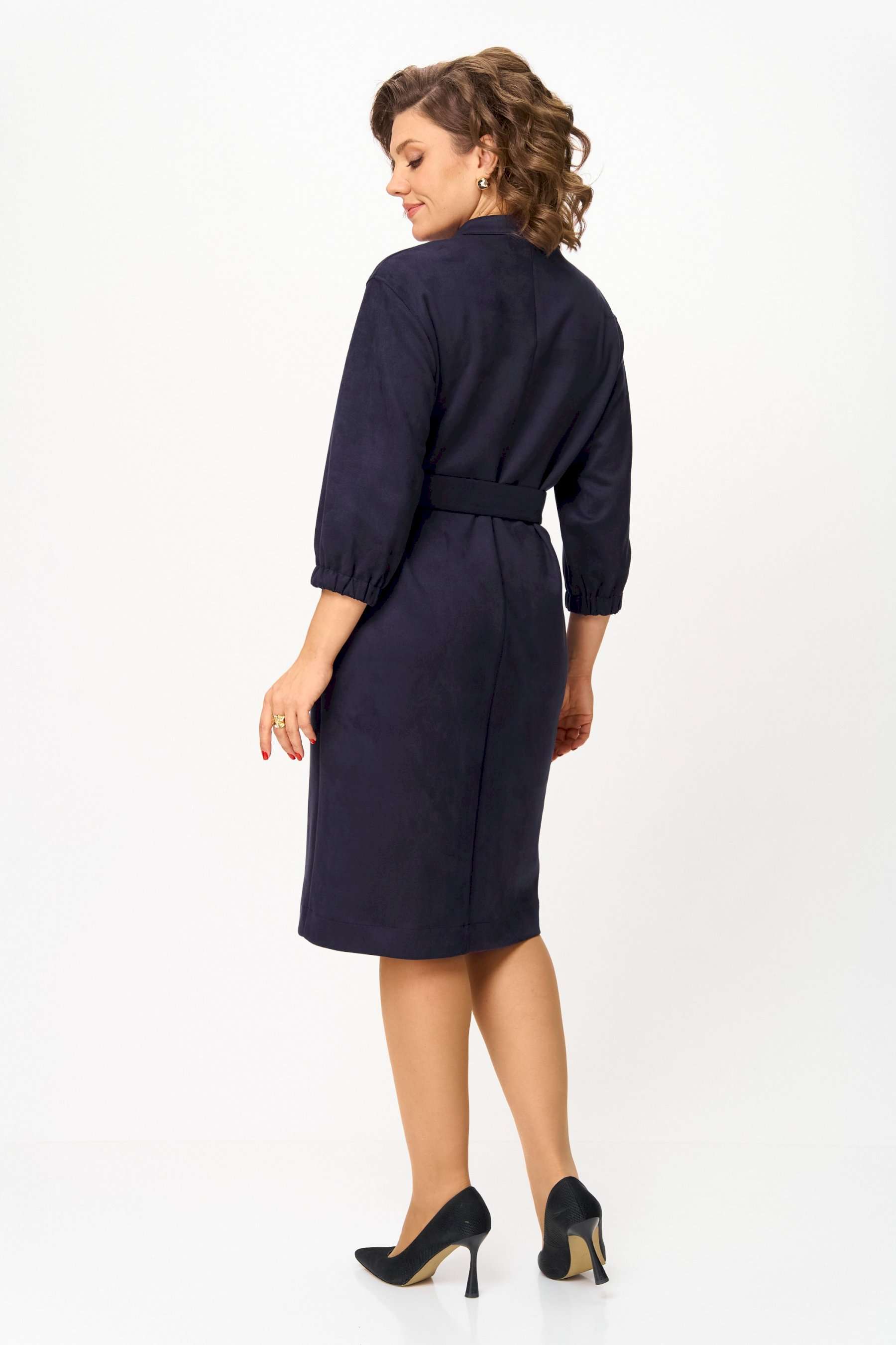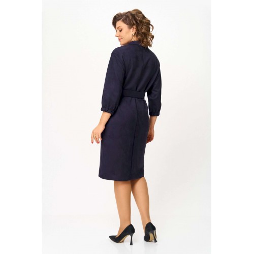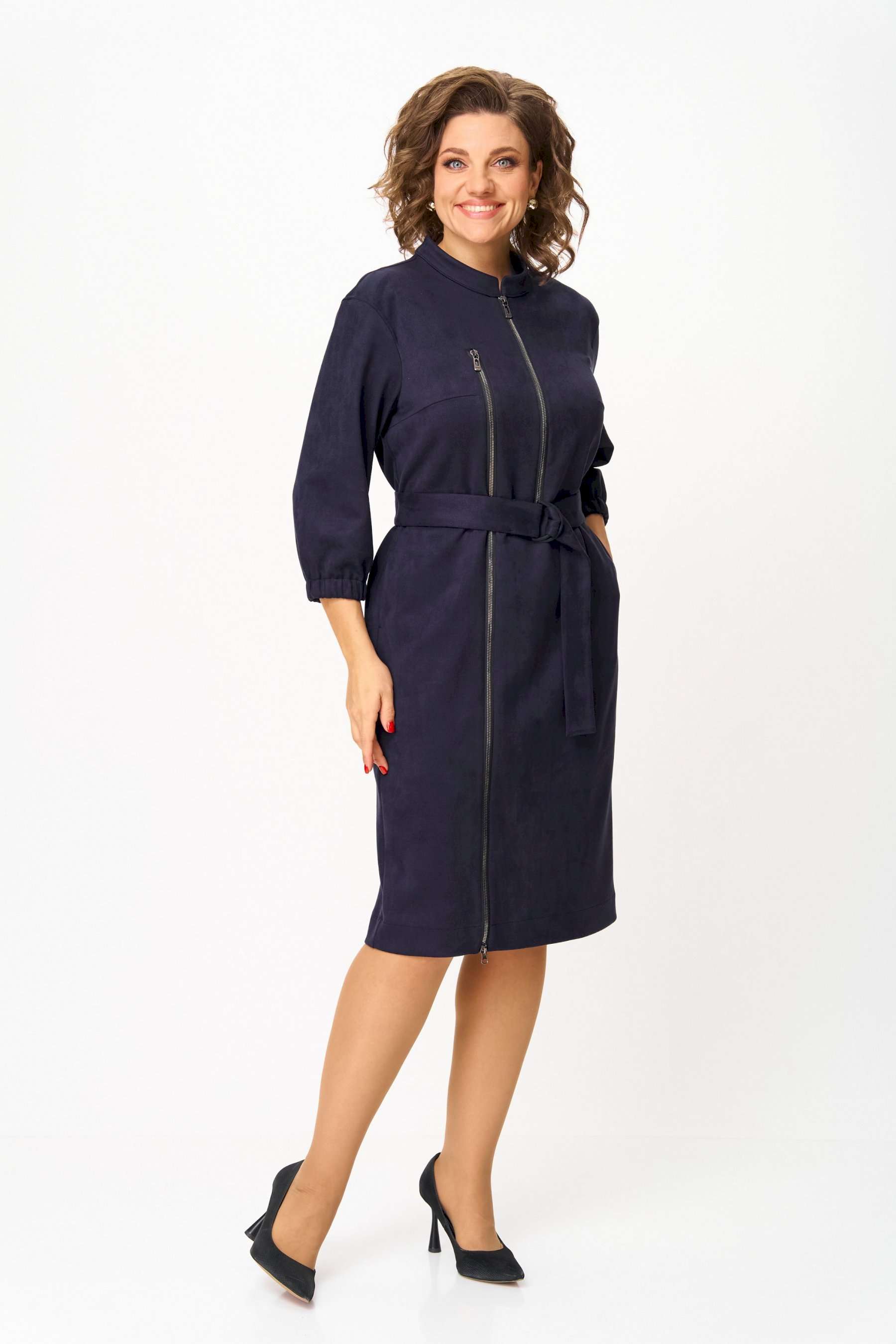 Элегантное женское платье из ткани искусственная замша. Платье полуприлегающего силуэта. По переду платье декорировано двумя рядами молнии. Горловина оформлена воротником стойка, в боковых швах на уровне бедер карманы. Спинка с центральным швом. Линия плеча спущена. Рукава втачные, длина ¾, низ на резинке. Длина платья по спинке – 108 см. Длина рукава – 44 см.