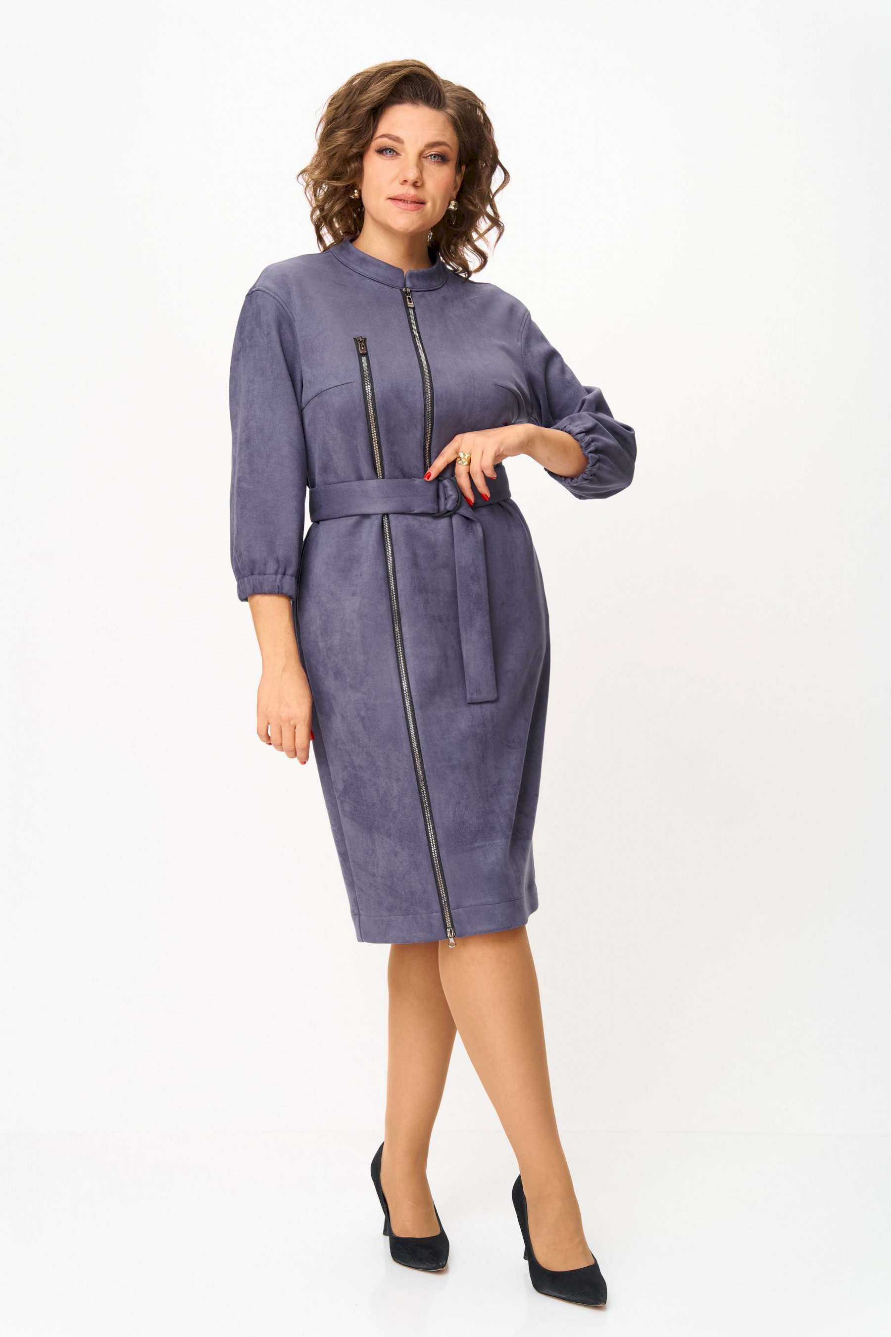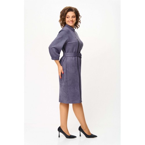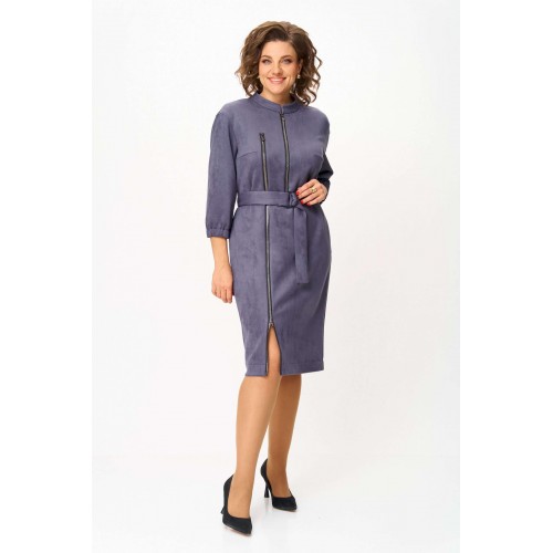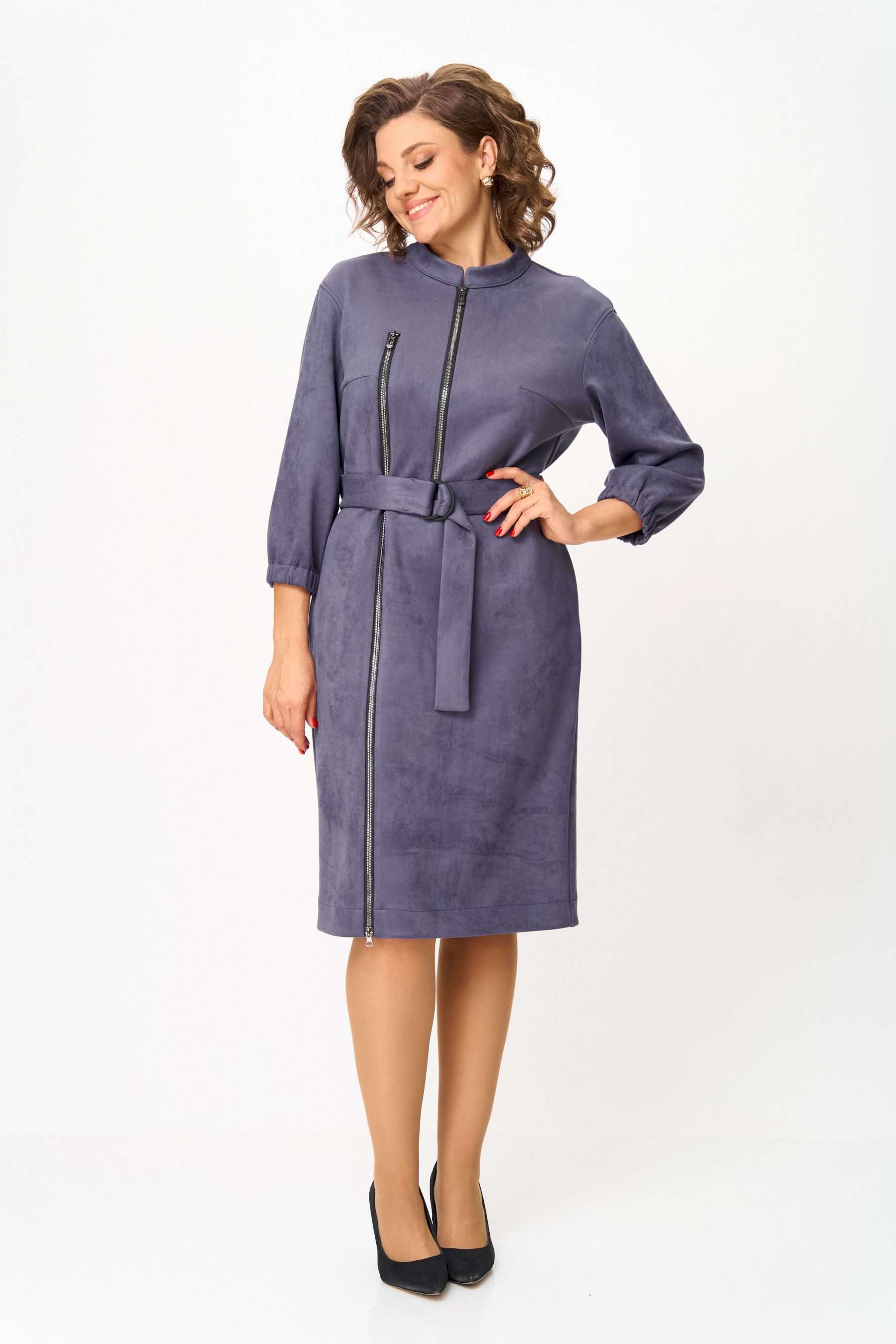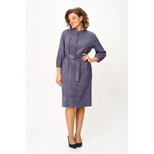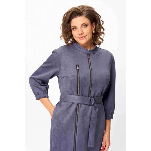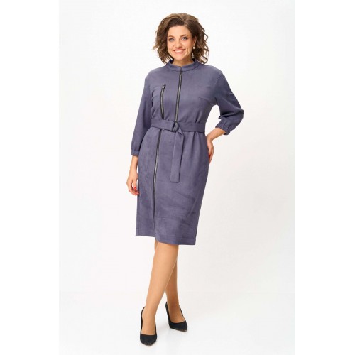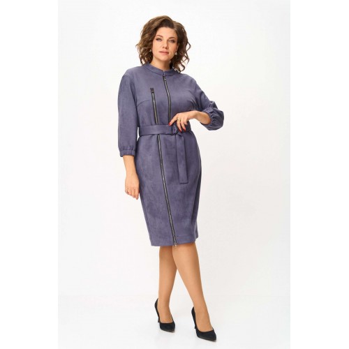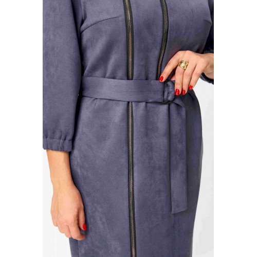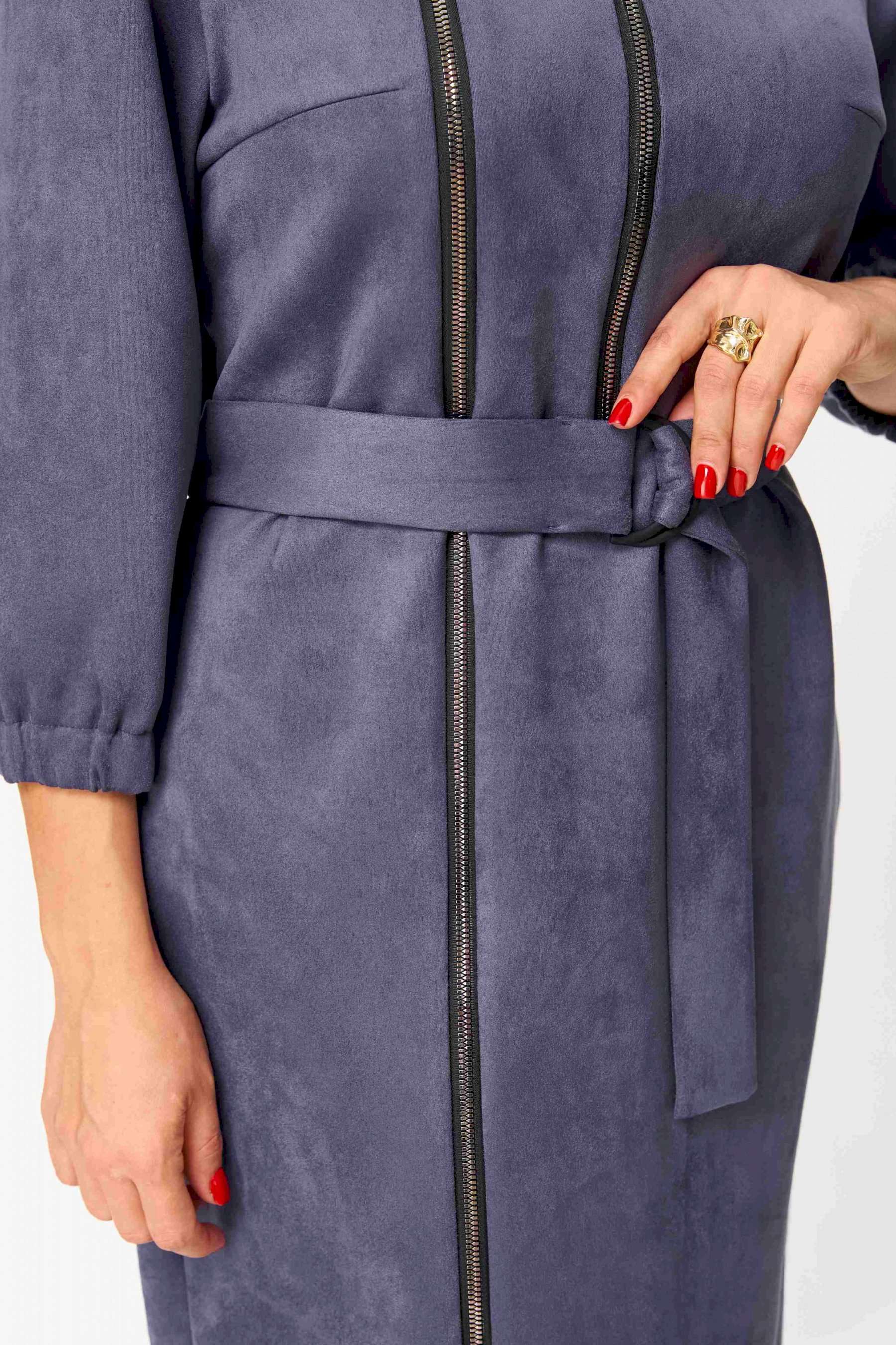 Элегантное женское платье из ткани искусственная замша. Платье полуприлегающего силуэта. По переду платье декорировано двумя рядами молнии. Горловина оформлена воротником стойка, в боковых швах на уровне бедер карманы. Спинка с центральным швом. Линия плеча спущена. Рукава втачные, длина ¾, низ на резинке. Длина платья по спинке – 108 см. Длина рукава – 44 см.