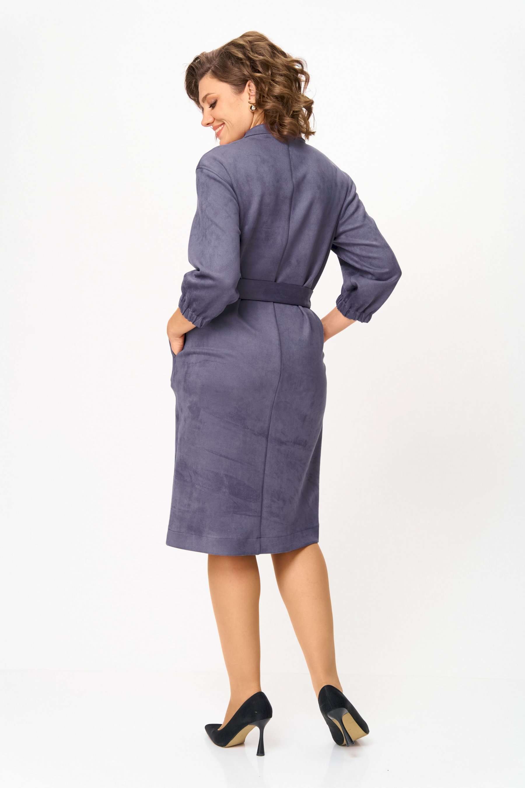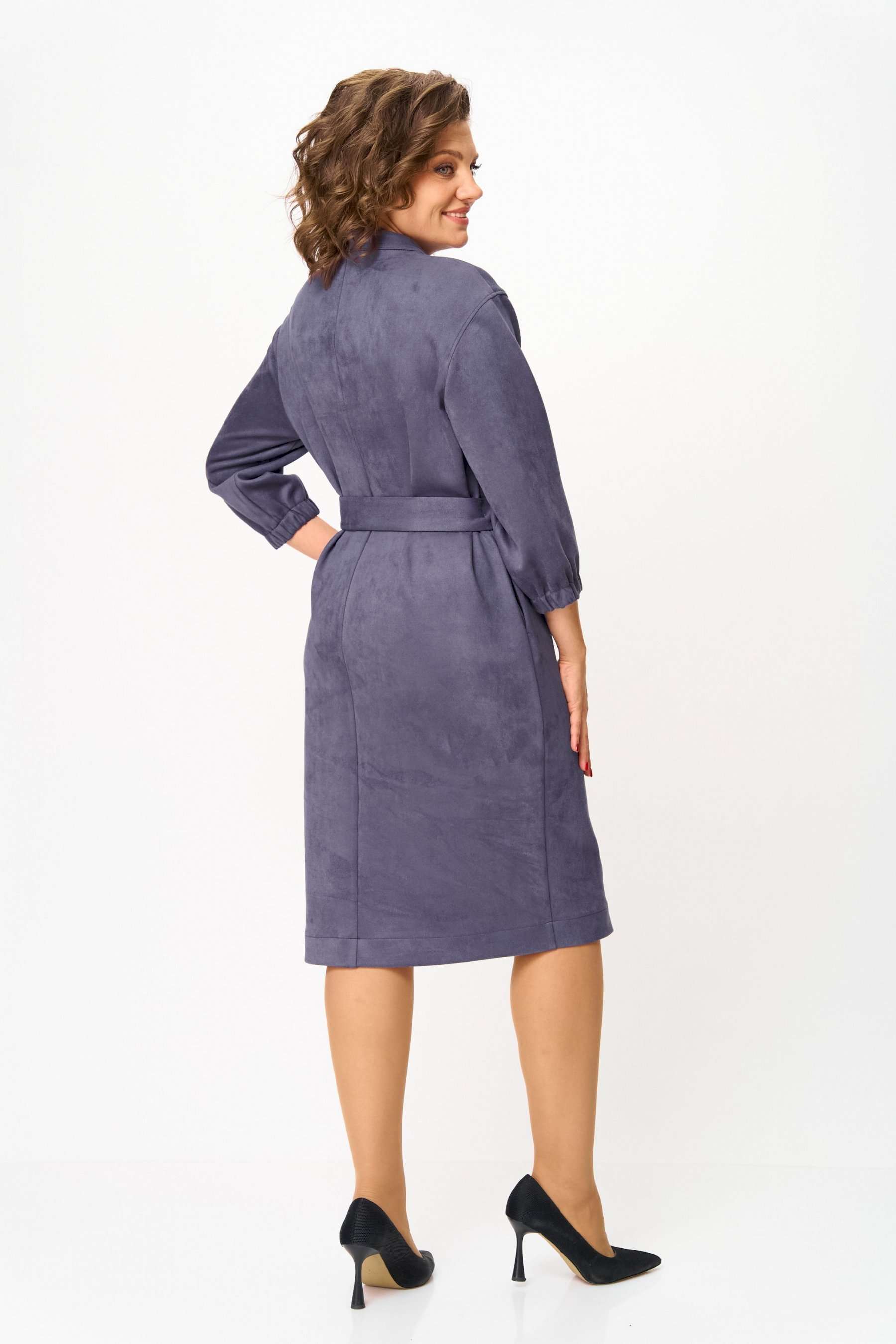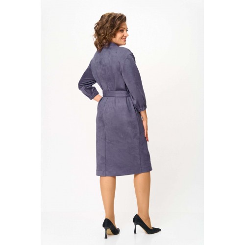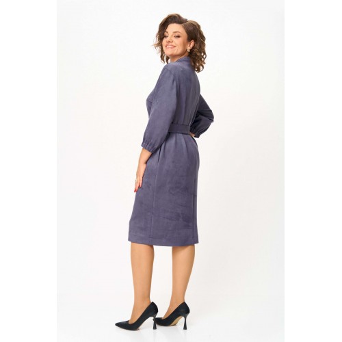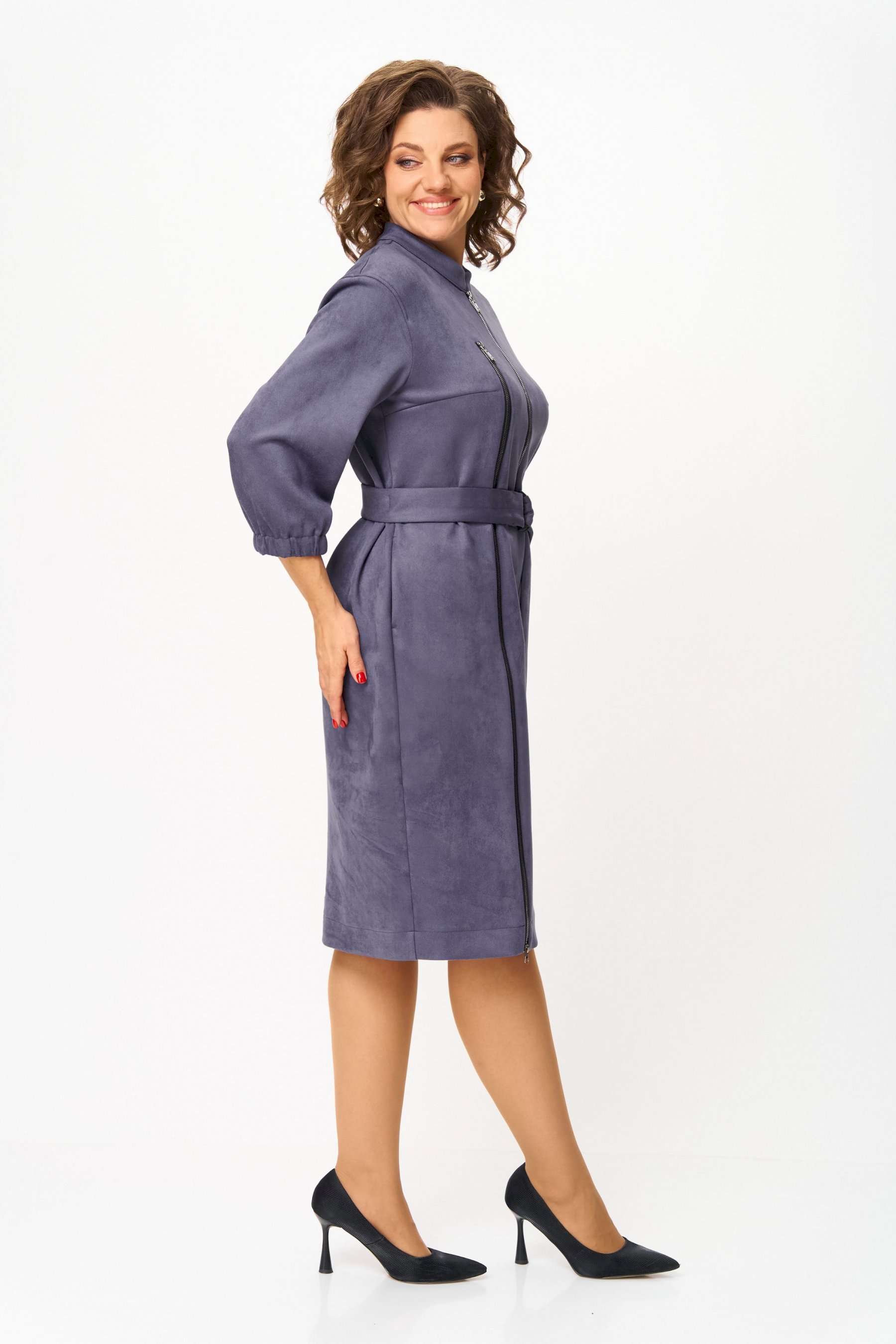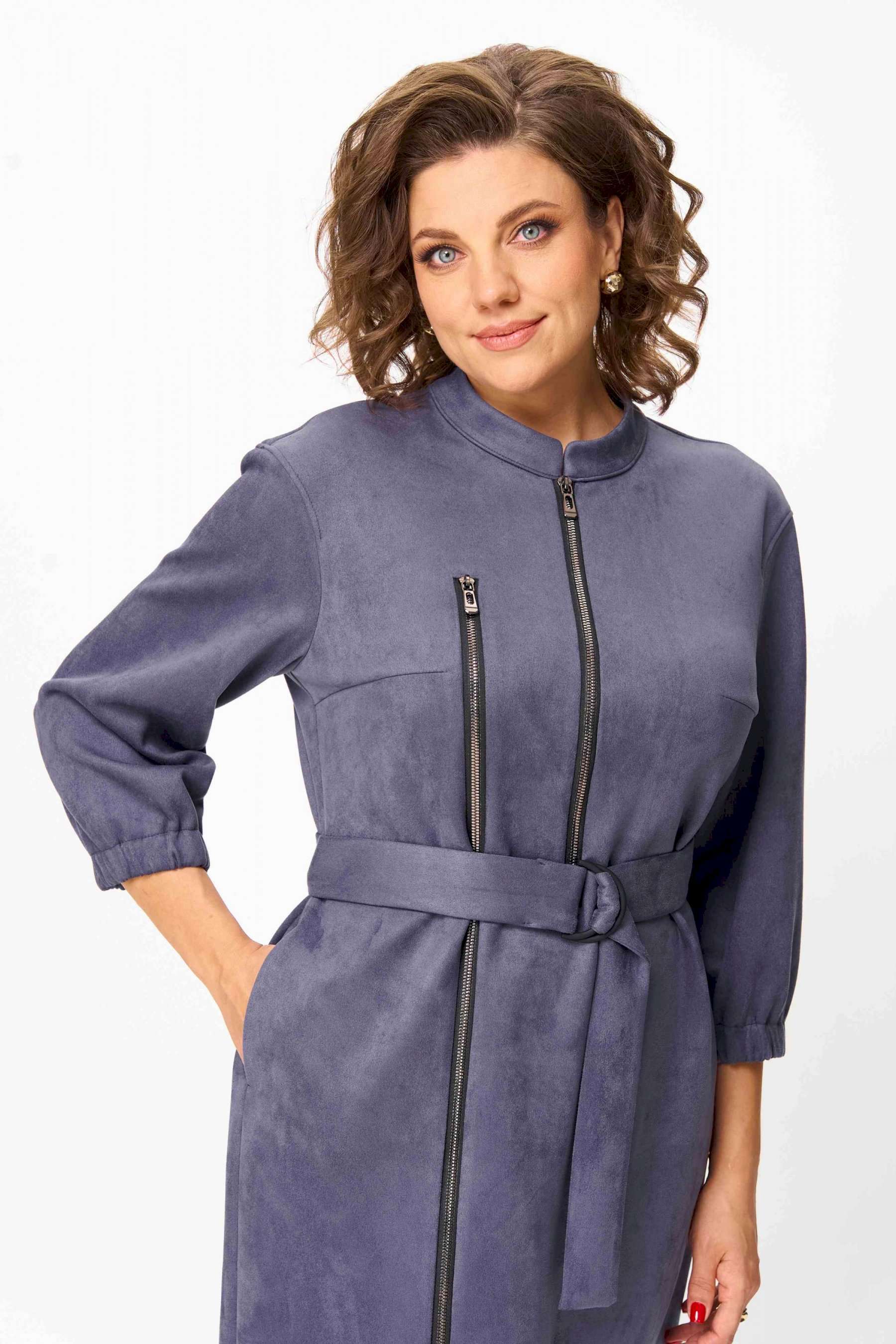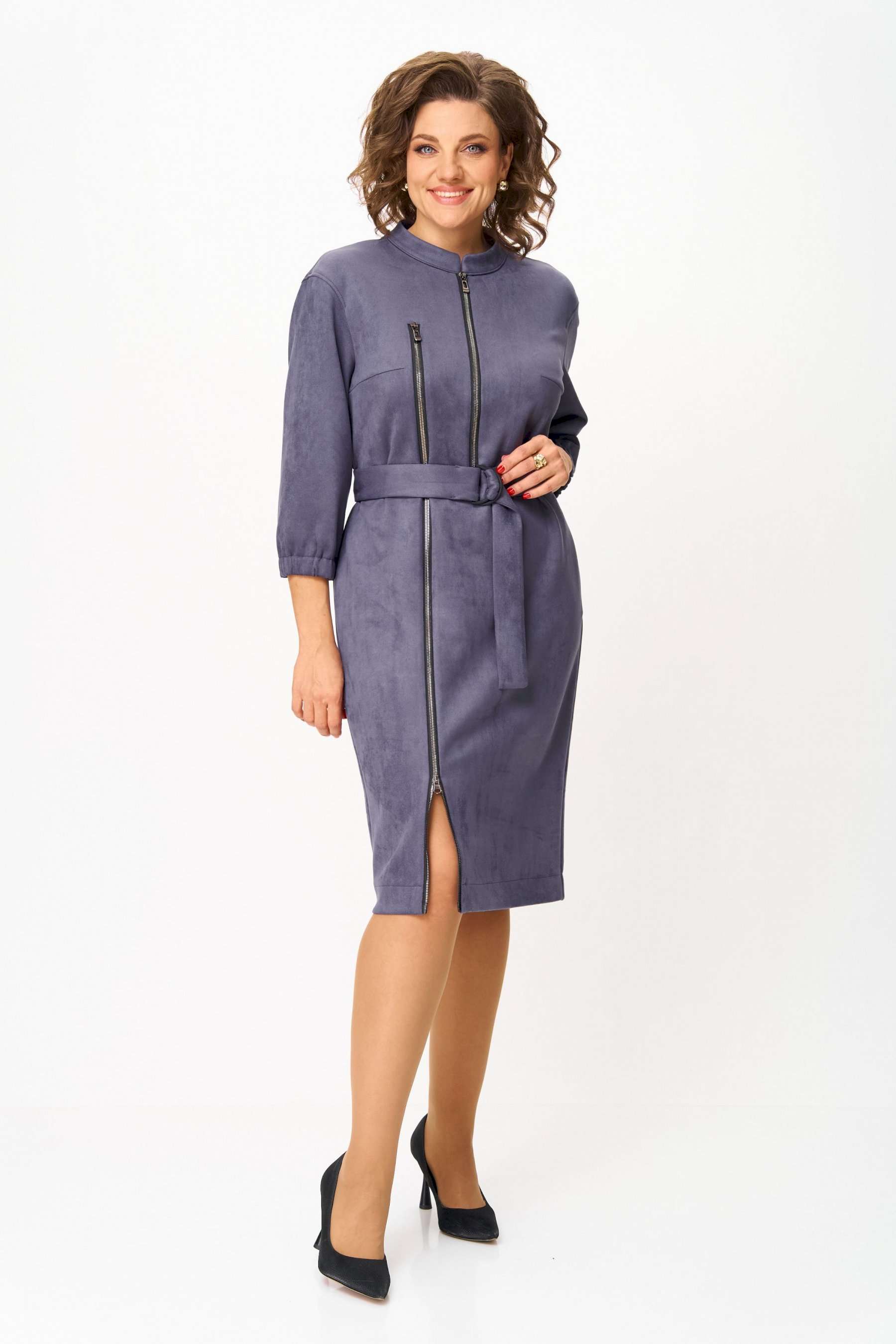 Элегантное женское платье из ткани искусственная замша. Платье полуприлегающего силуэта. По переду платье декорировано двумя рядами молнии. Горловина оформлена воротником стойка, в боковых швах на уровне бедер карманы. Спинка с центральным швом. Линия плеча спущена. Рукава втачные, длина ¾, низ на резинке. Длина платья по спинке – 108 см. Длина рукава – 44 см.