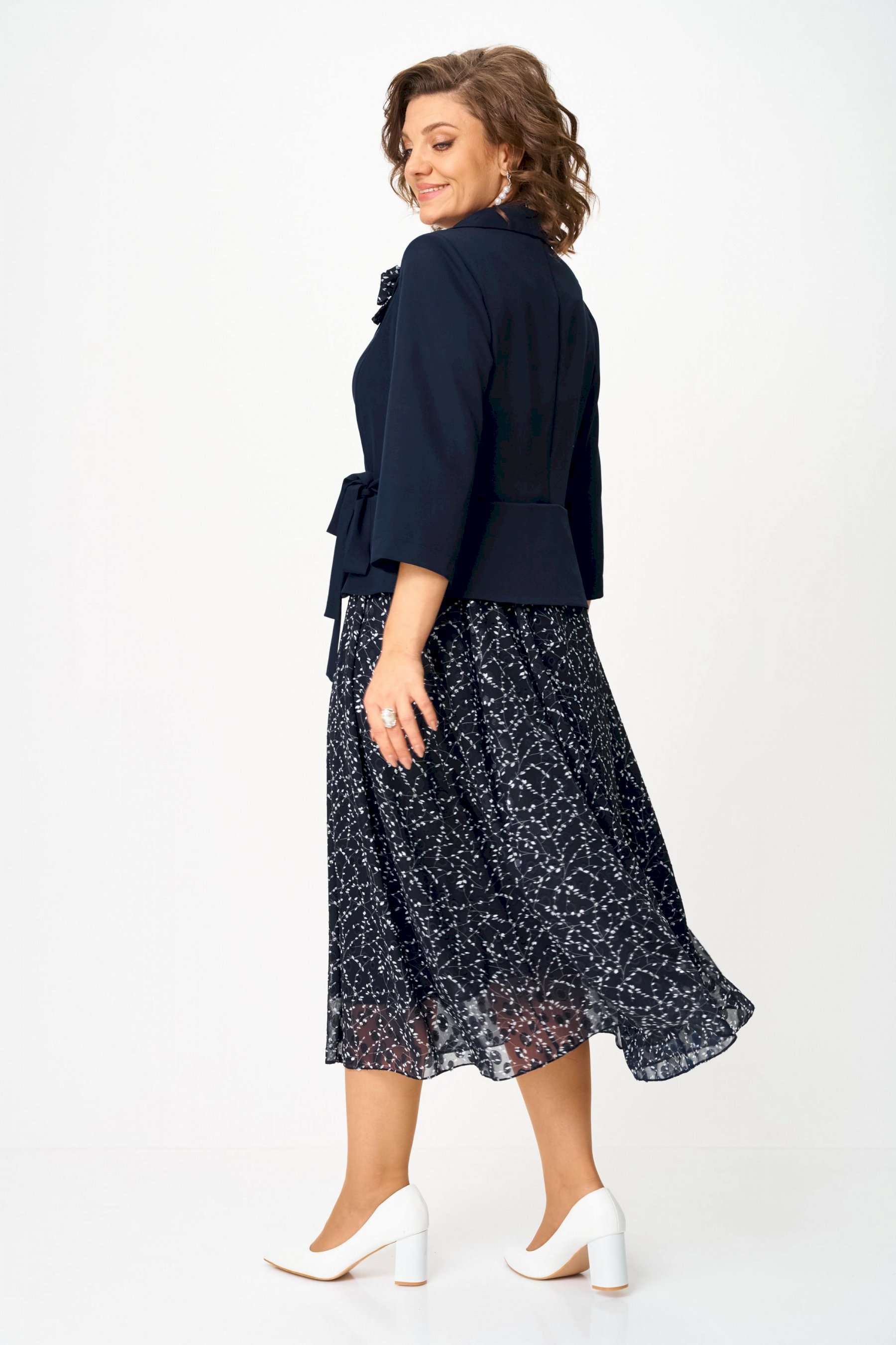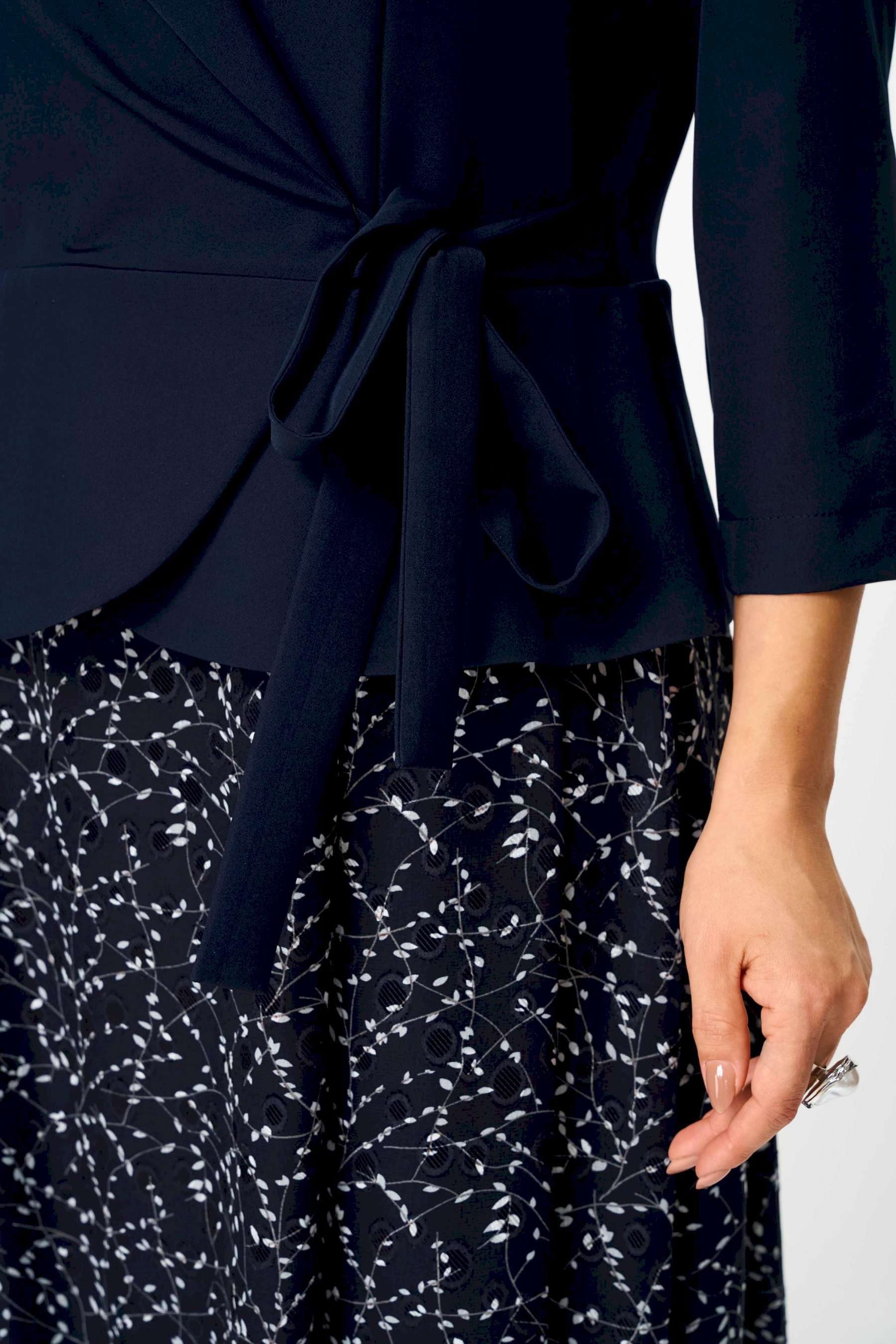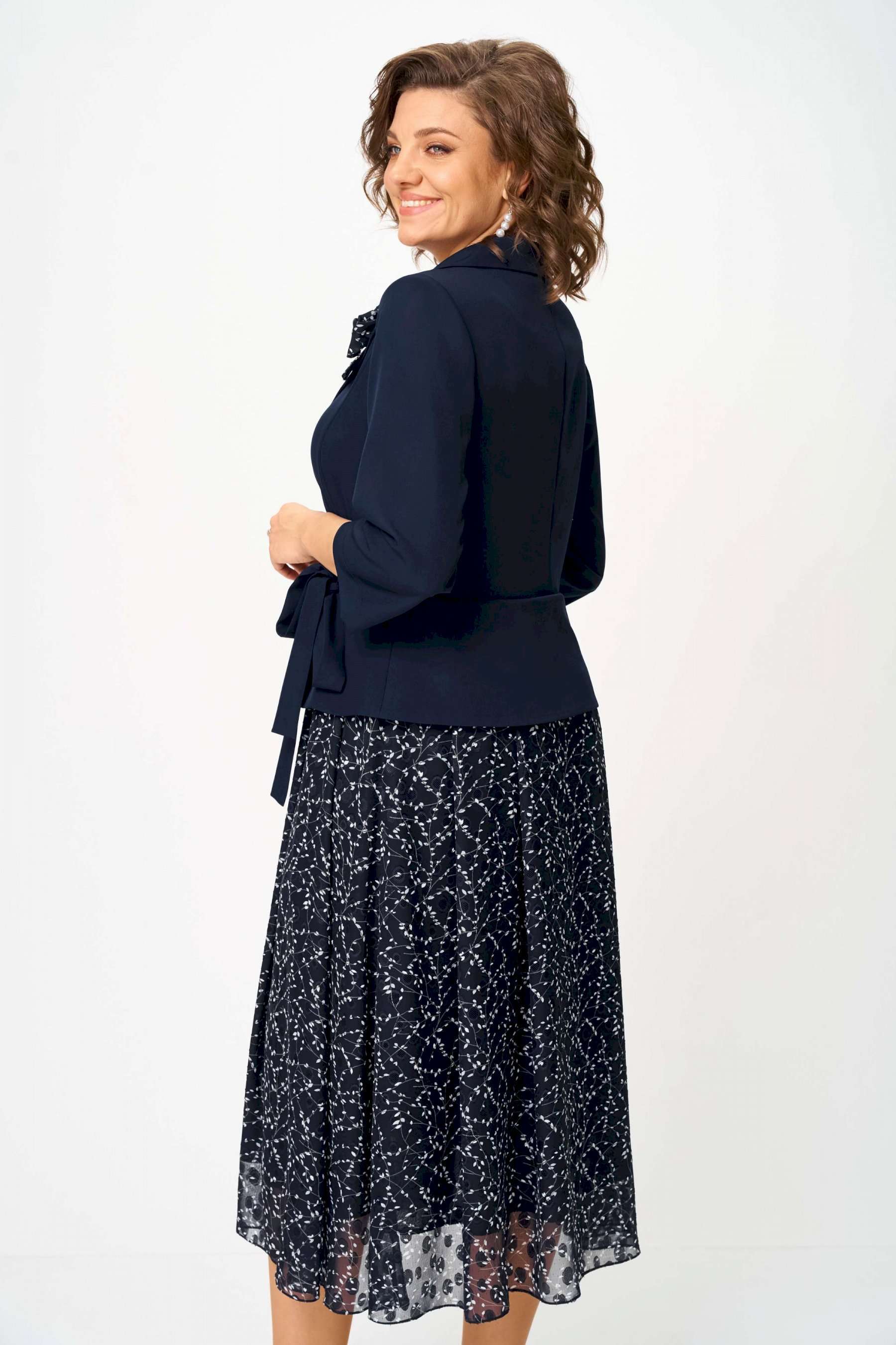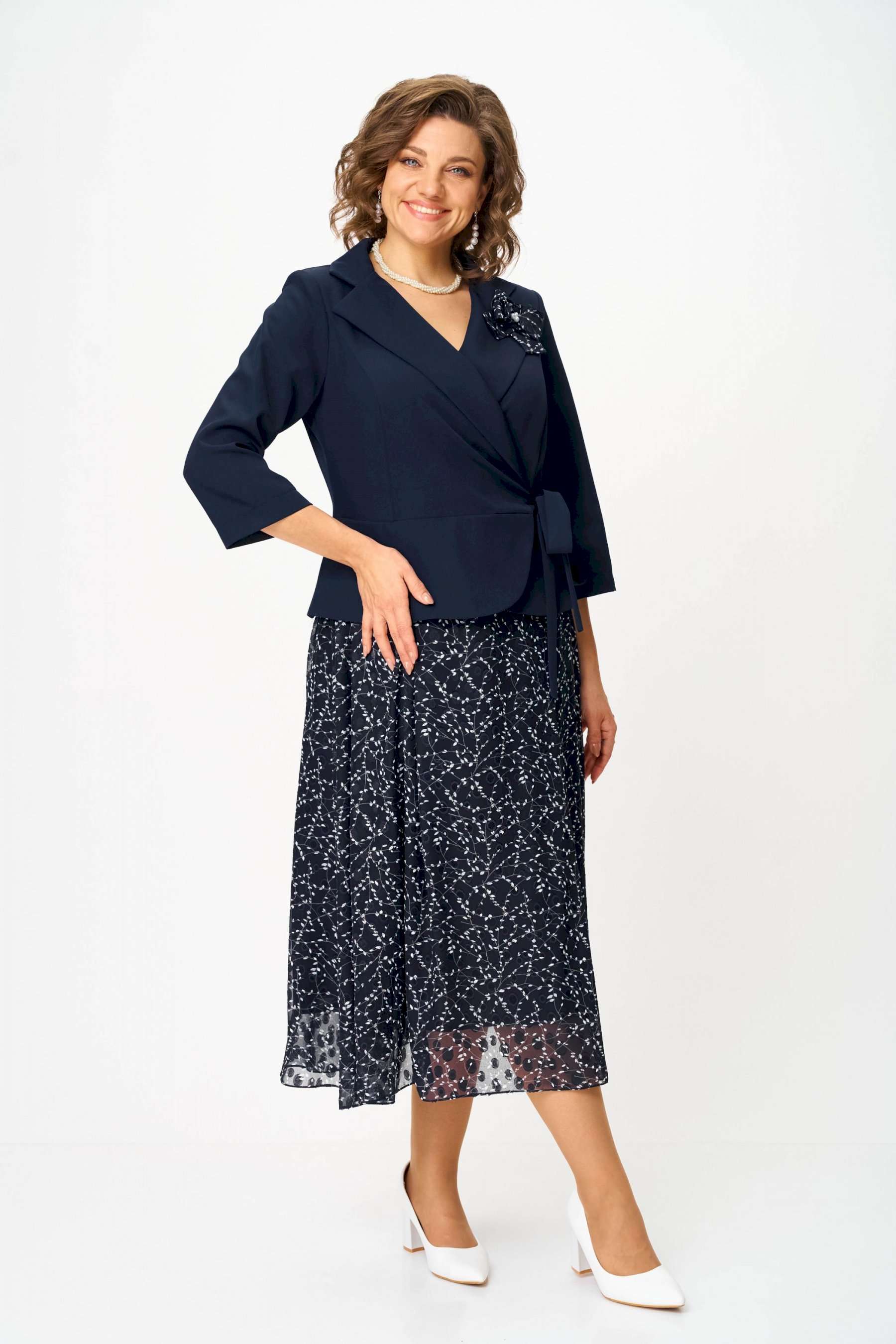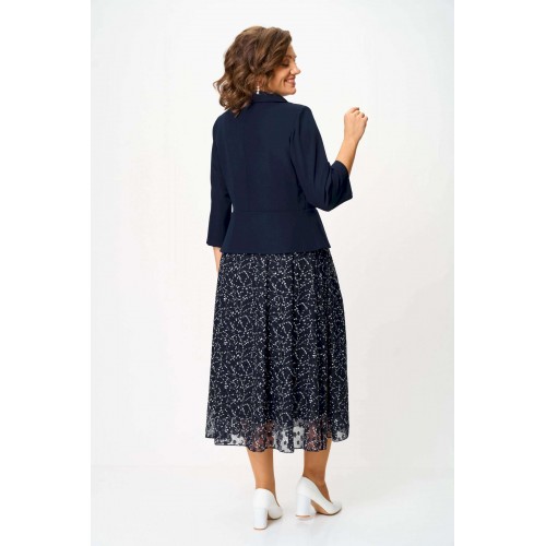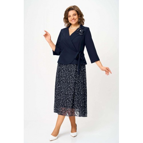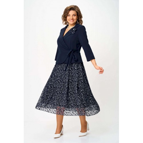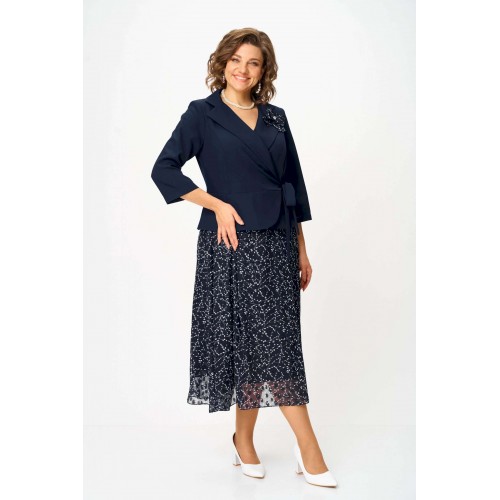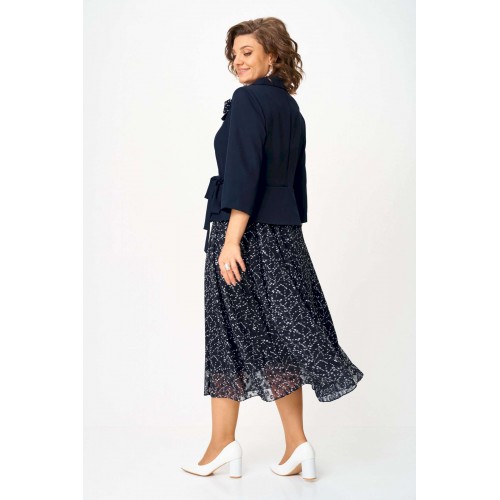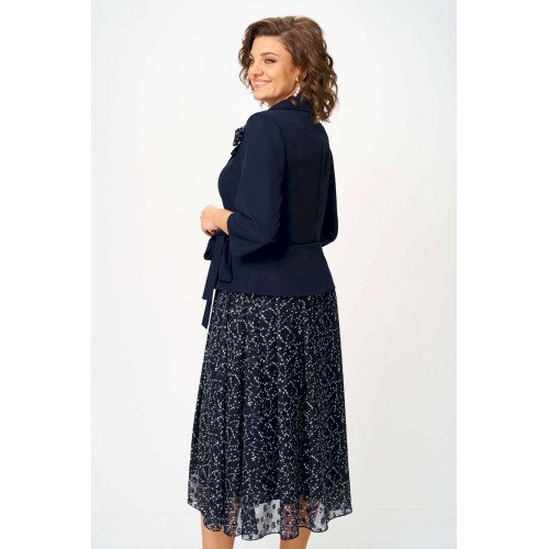 Элегантное женское платье, выполнено в виде имитации костюма из двух видов ткани. Лиф из плательной ткани, юбка из шифона. Платье с запахом, горловина с воротником пиджачного типа с отложными лацканами. Рукава втачные, длина 3/4. Юбка со складками по линии талии, расширенная к низу, на подкладке. По линии талии вставлен завязывающийся пояс. Длина платья – 124 см. Длина рукава от горловины – 47.5 см.